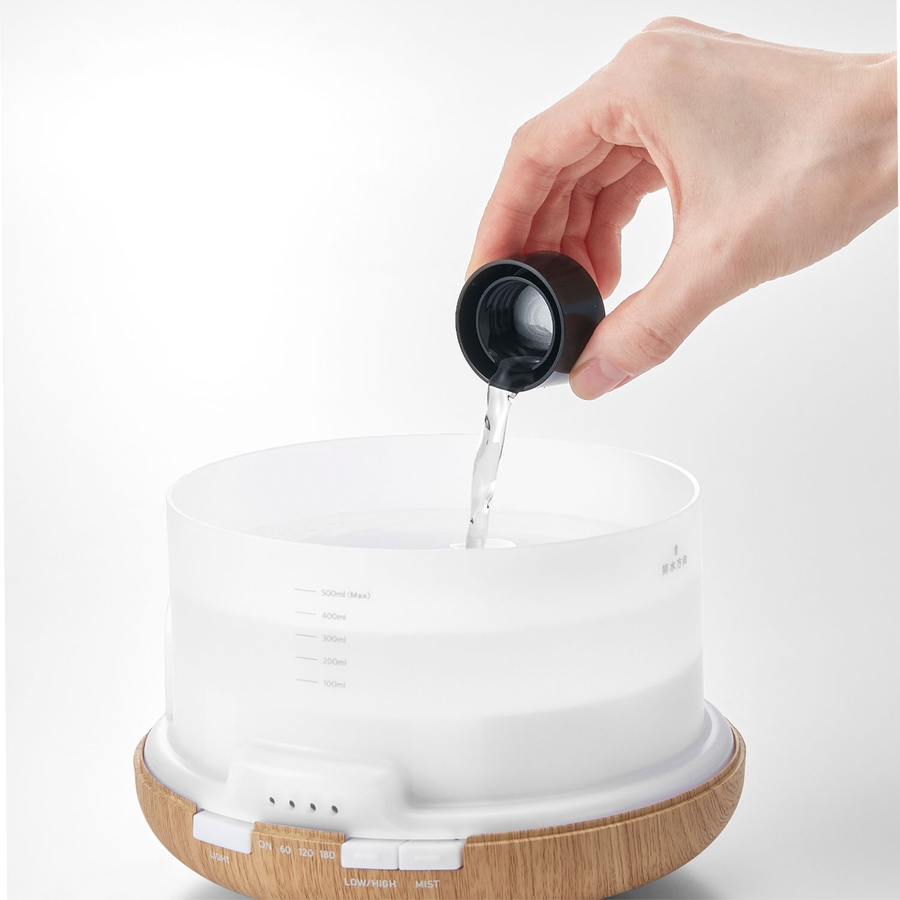 水タンクにお水を入れ、お好みのエッセンシャルオイルまたはアロマウォーターを入れてください。