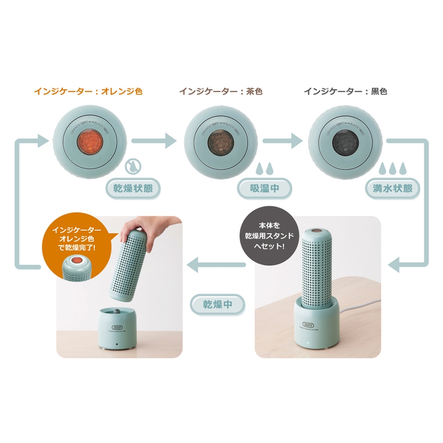 インジケーターの色で吸湿の状態が一目で分かる使いやすさもポイントです。