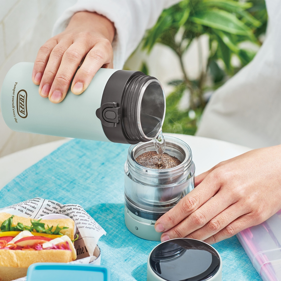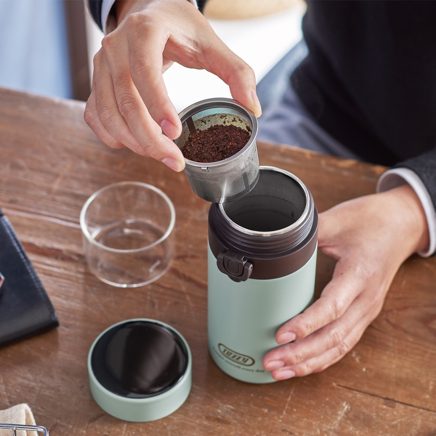 どこでも好きな時に、淹れたての美味しいコーヒー/お茶が楽しめる、ドリッパーと真空断熱ボトルがセットになった携帯式のブリューボトル。