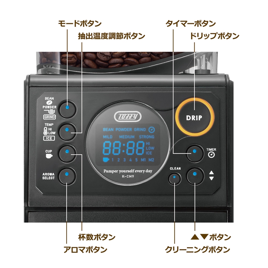 コーヒーの抽出や豆挽きの完了時間を設定できるタイマー機能つき。