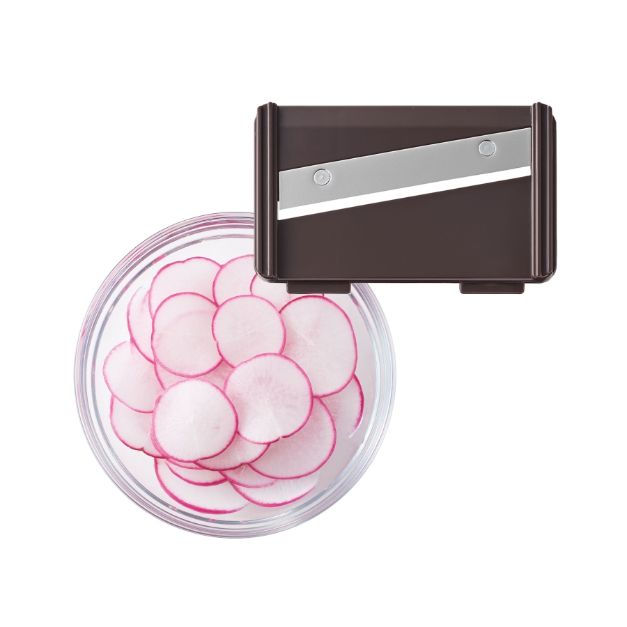 安全ホルダー付きで、薄くなった野菜も安全にスライスできます。