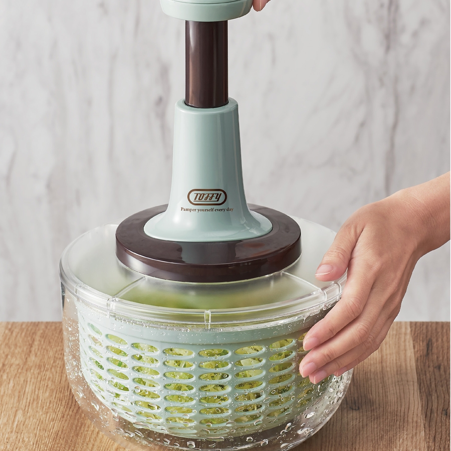 洗った野菜を入れたらハンドルをセットしてプッシュするだけで、高速回転で野菜の水分をしっかり水切り!
