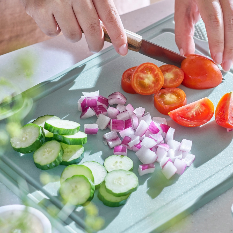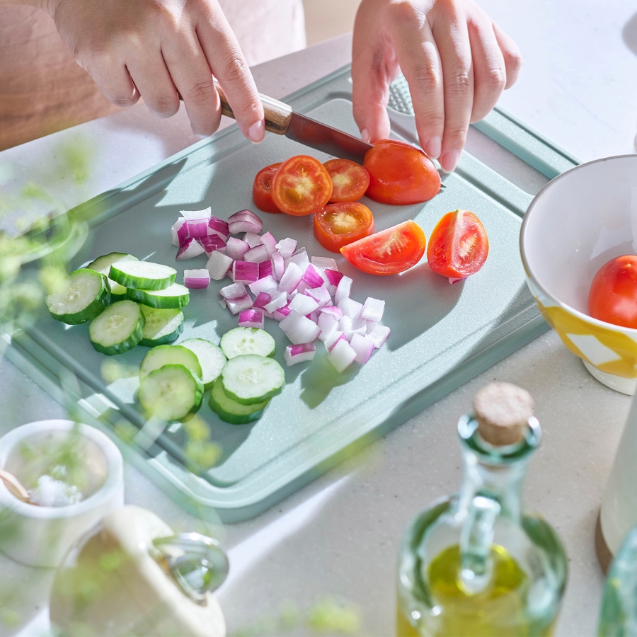 外周にくぼみがあり、カットした野菜などの水分が周りにこぼれにくい設計です。