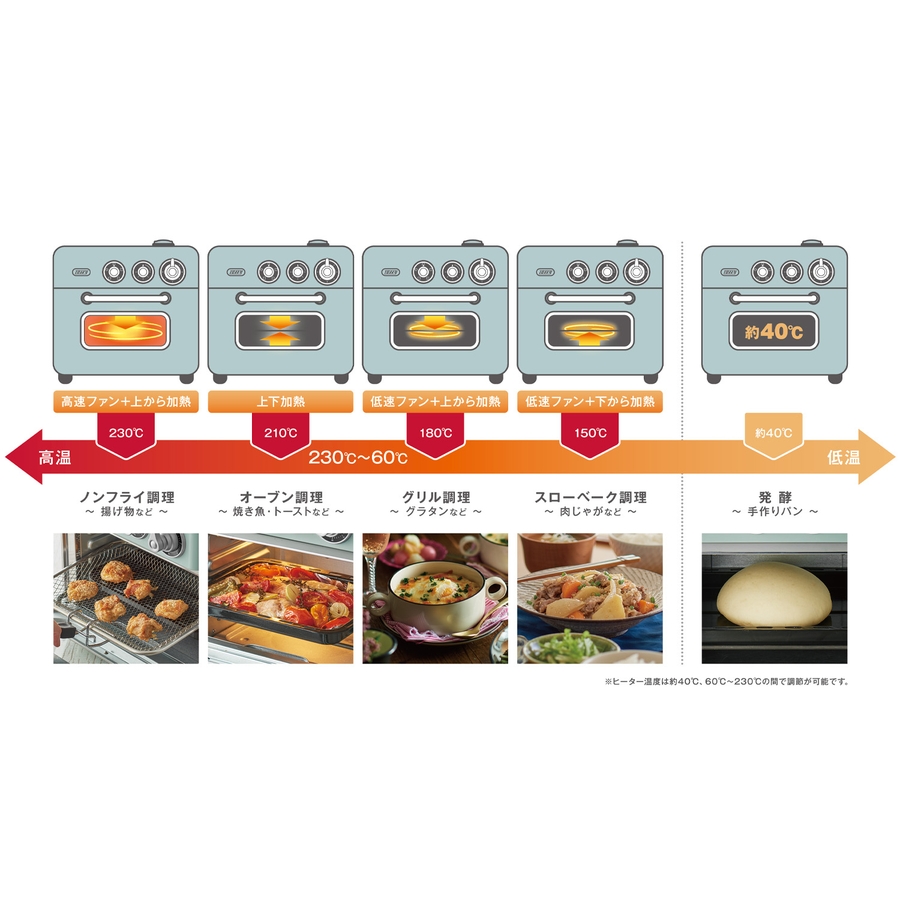 「ノンフライ調理」から「オーブン」「グリル」「スローベーク」「発酵」まで1台5役!
