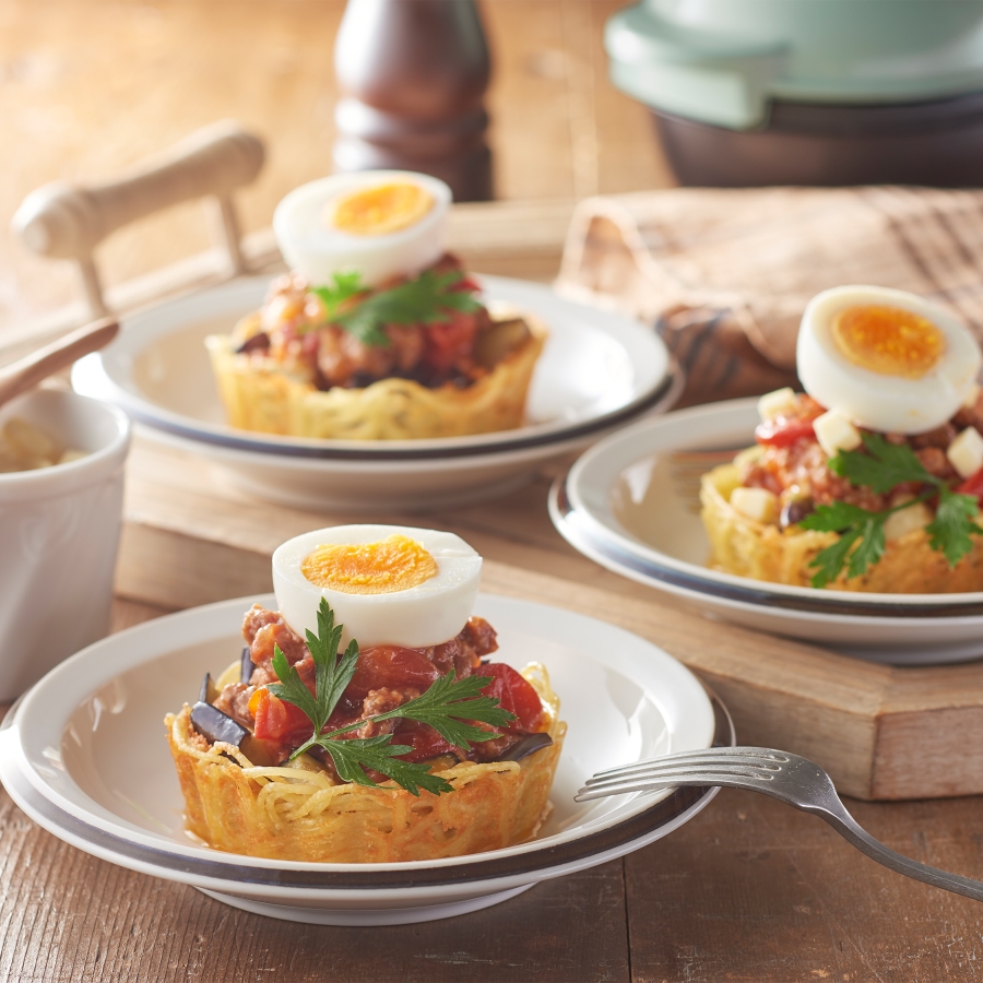 食パンで作った器でキッシュ、お餅で作った器でクリームあんみつ、パスタで作った器でミートソースなど。