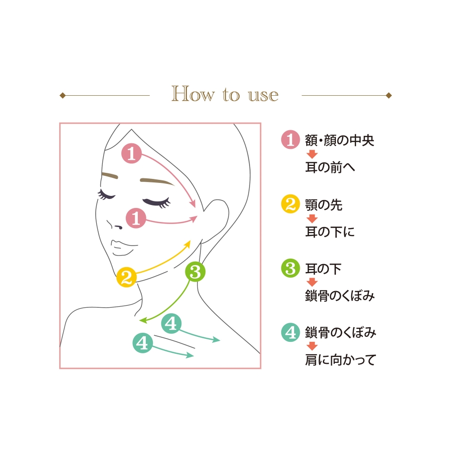●パッケージには顔まわりケアの使用ガイドを掲載。【使い方】指輪の曲線部分のラインを気になる箇所に当てて優しくすべらせます。カッサの滑りを良くし、肌への負担をやわらげるためにも、クリームなどを塗った肌にご使用ください。
