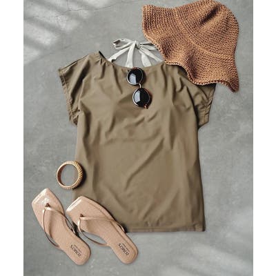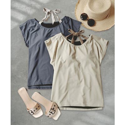 ホルターネックの水着を中に着ているかのようなデザインになっていますが、実際はトップスと一体型。