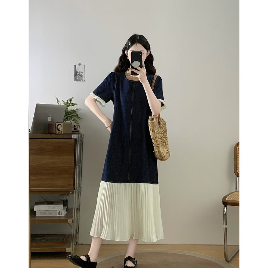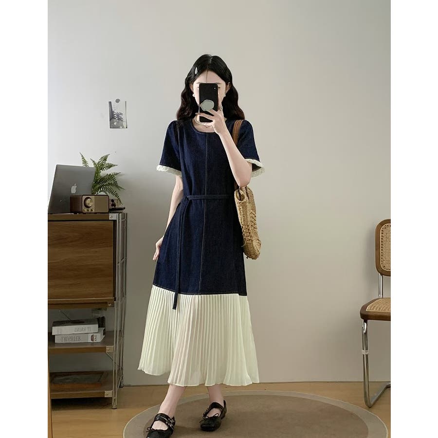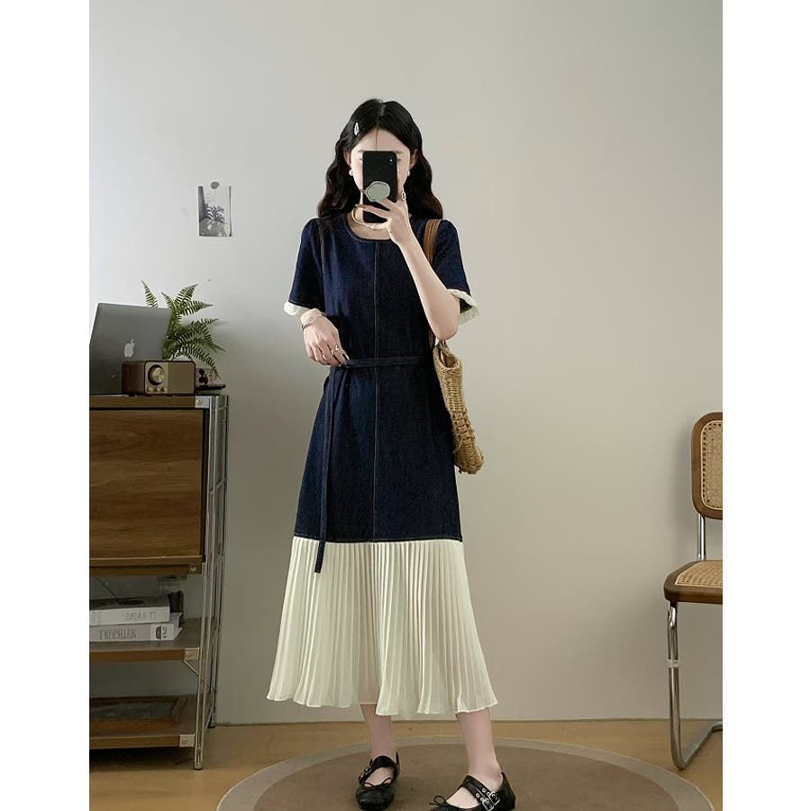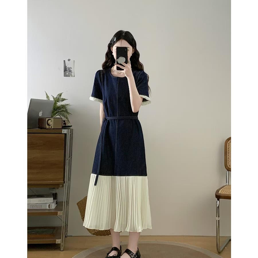 ベルト付き半袖ロングクルーネックデニムワンピース