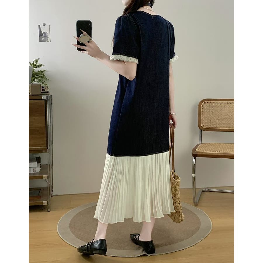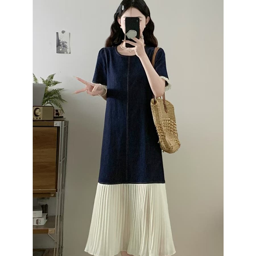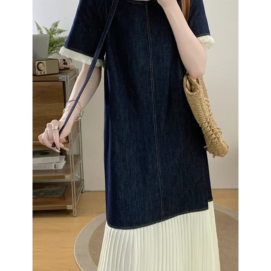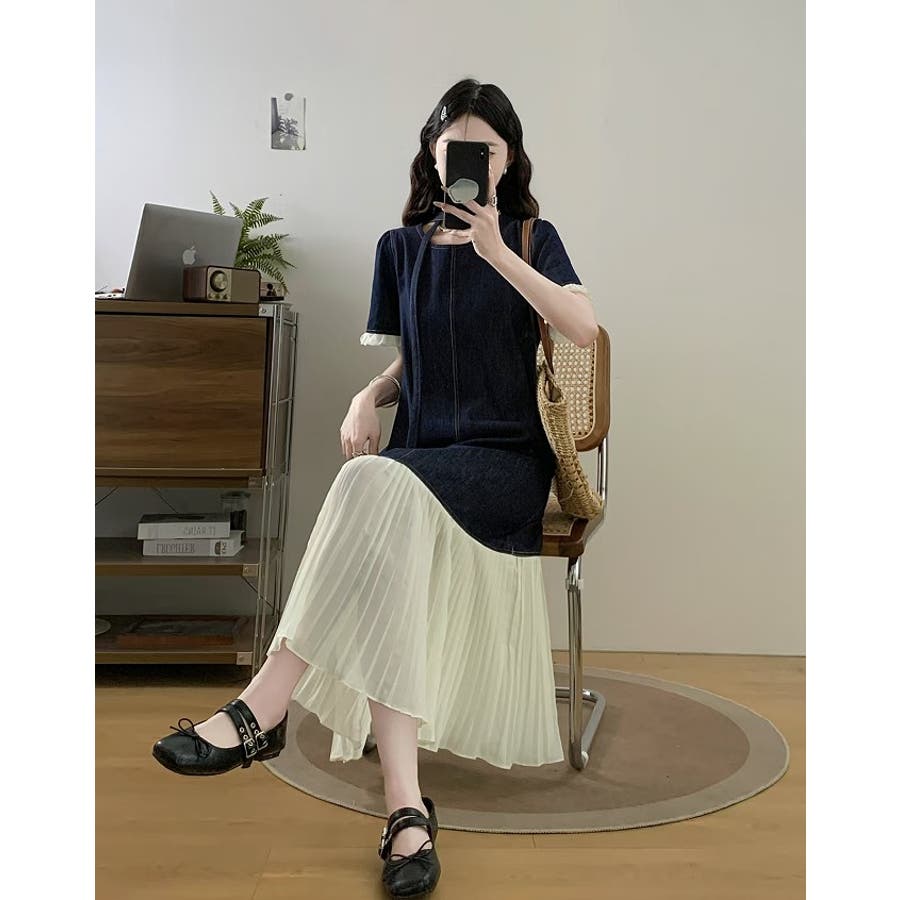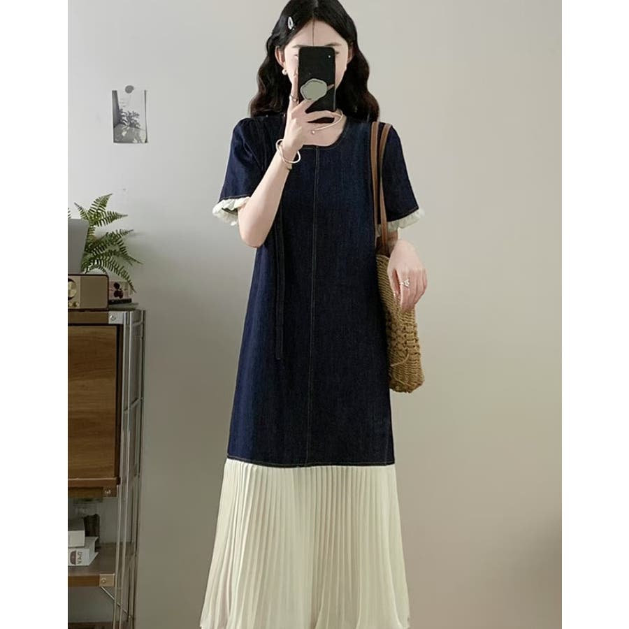 ベルト付き半袖ロングクルーネックデニムワンピース