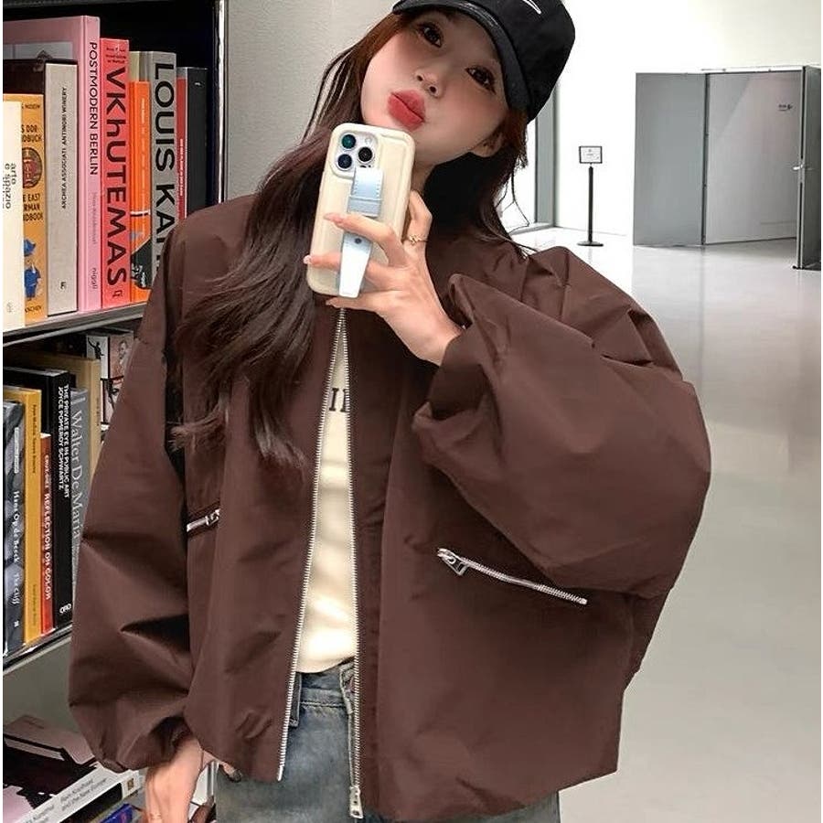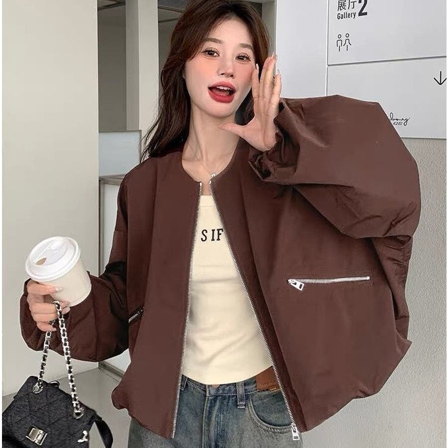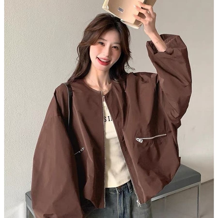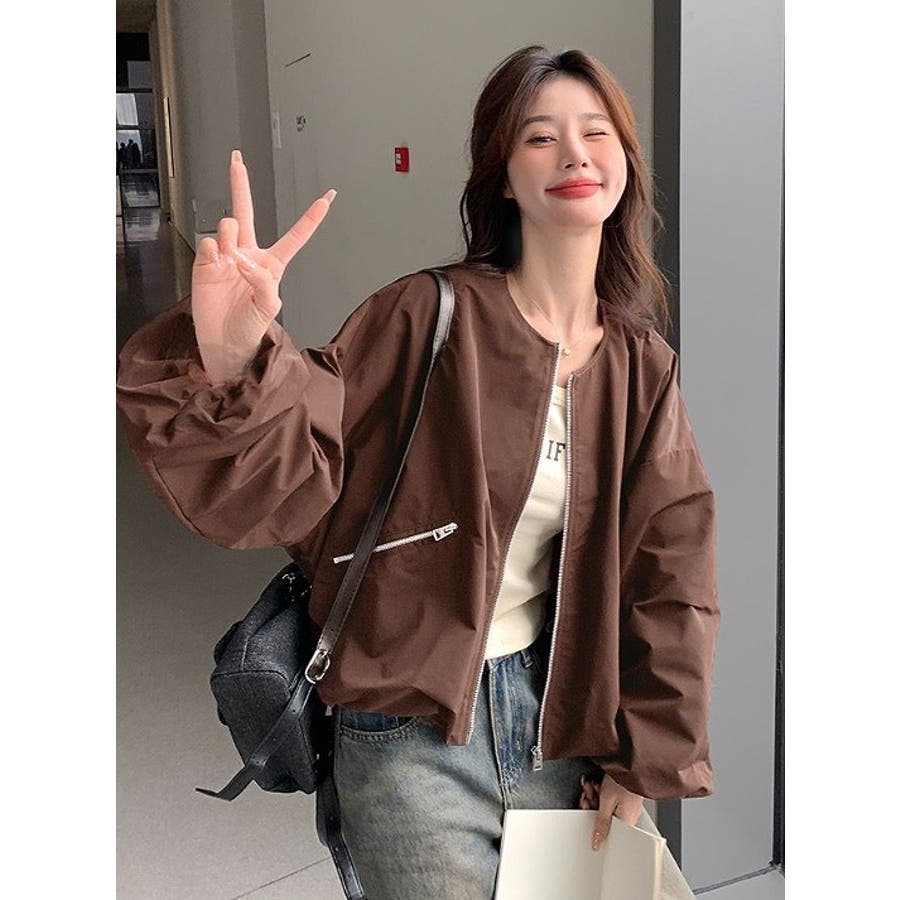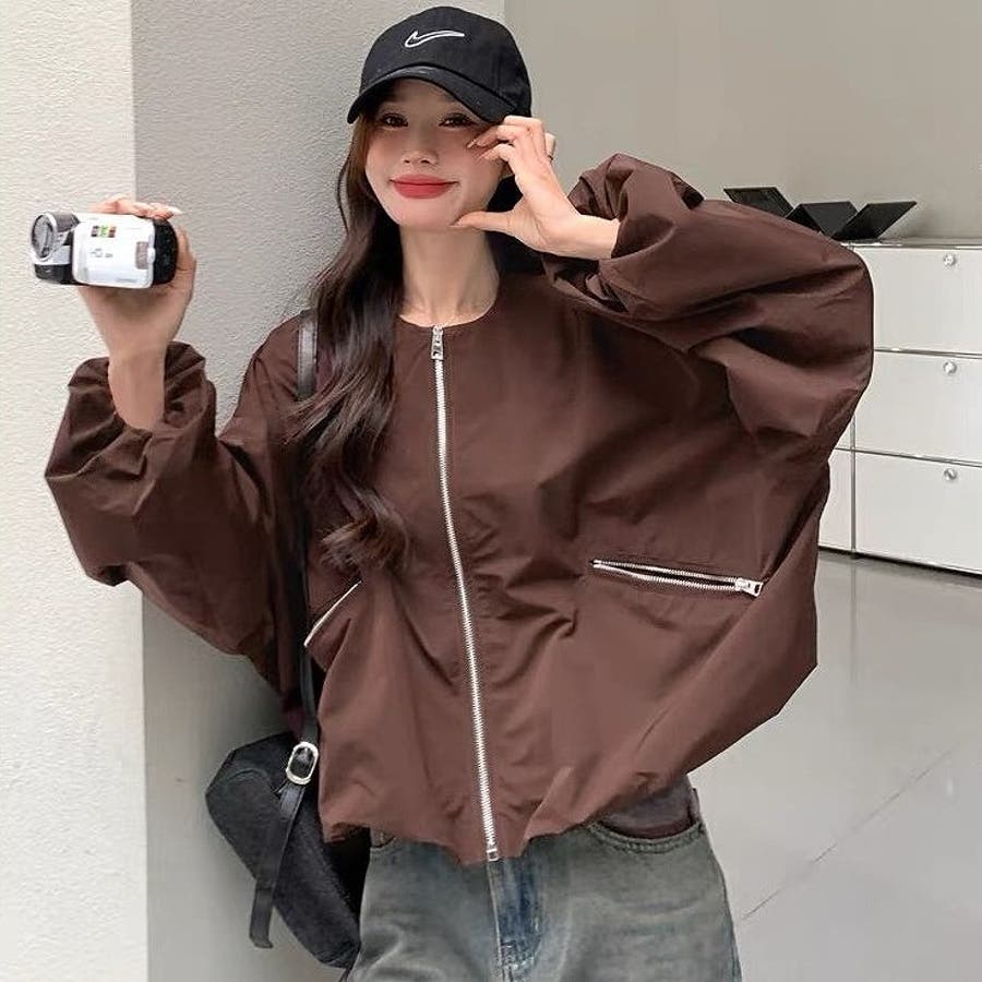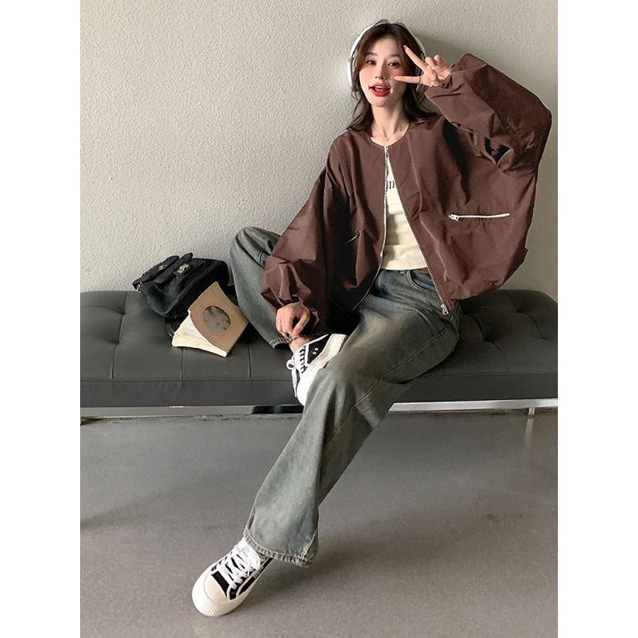 ファッションクルーネックジップ付きポケット付き無地ジャケット