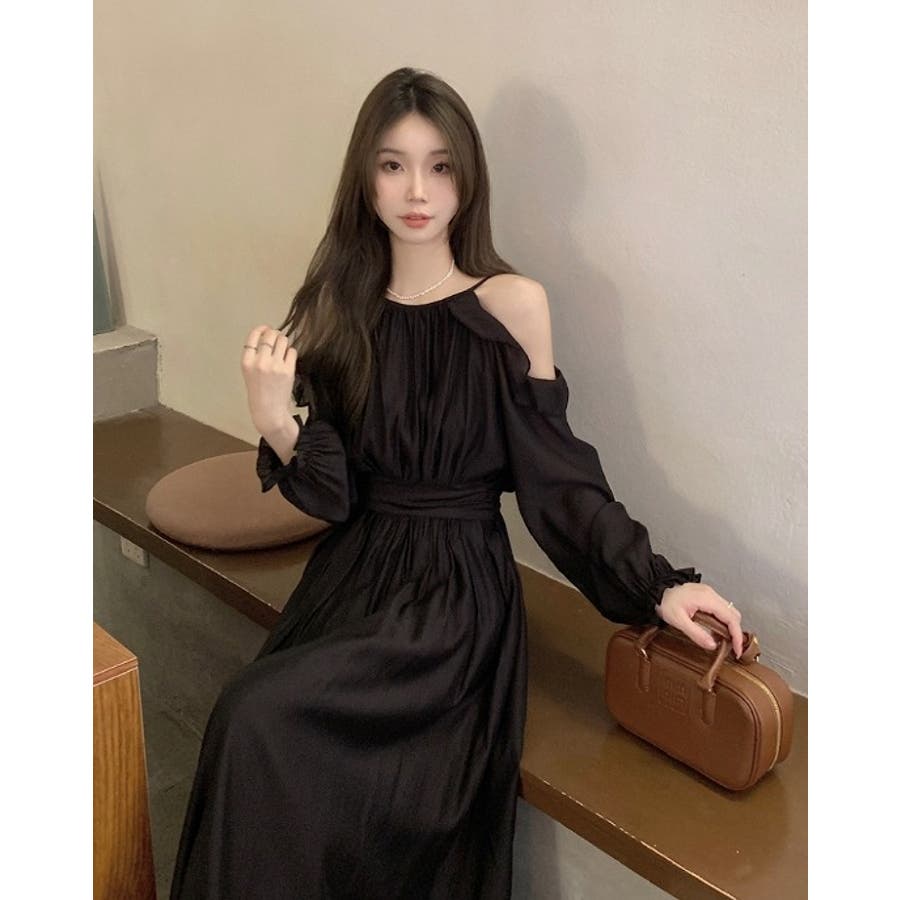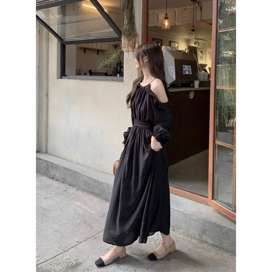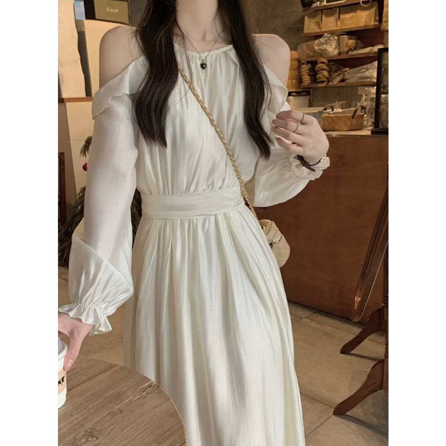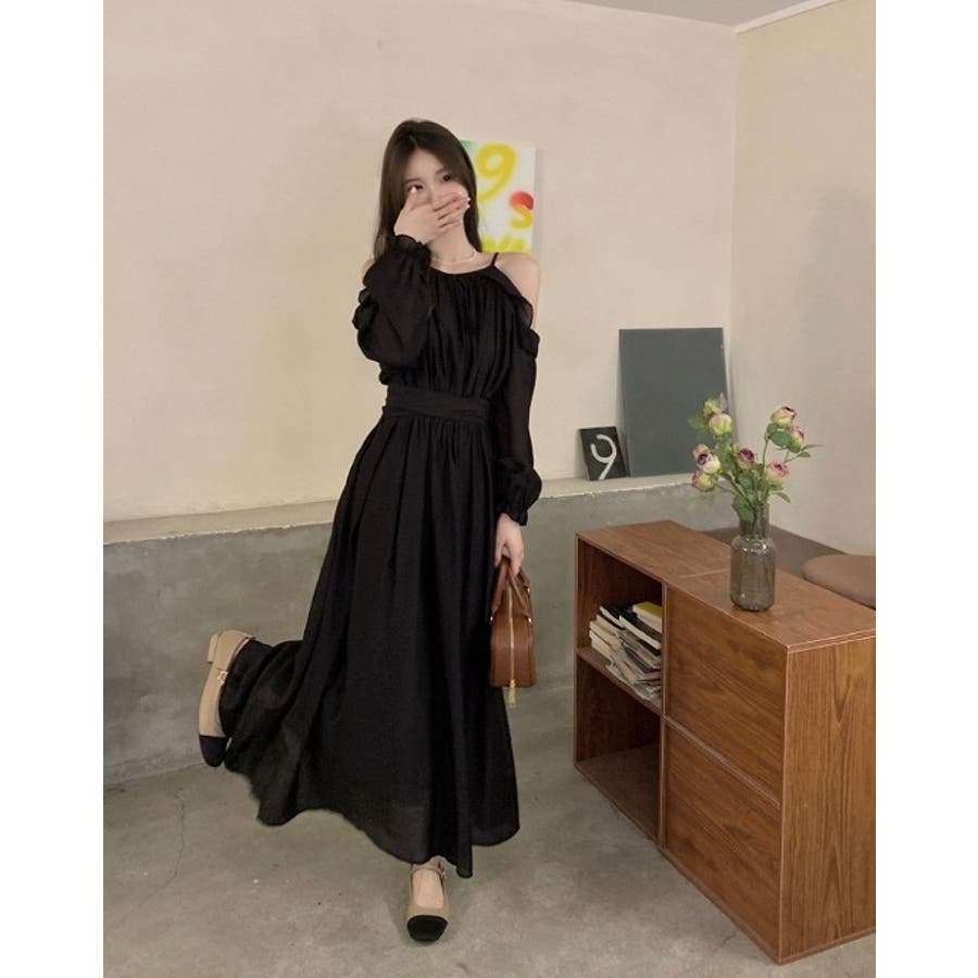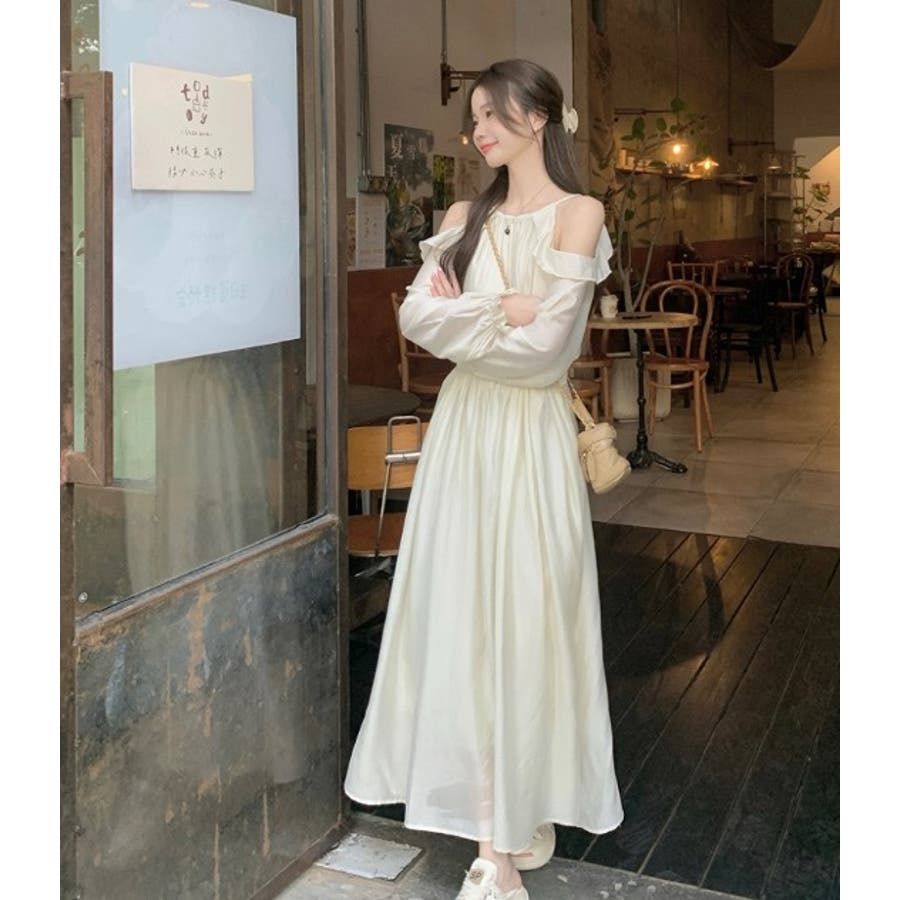 高級感があるフレア袖オフショルダー無地キャミワンピース
