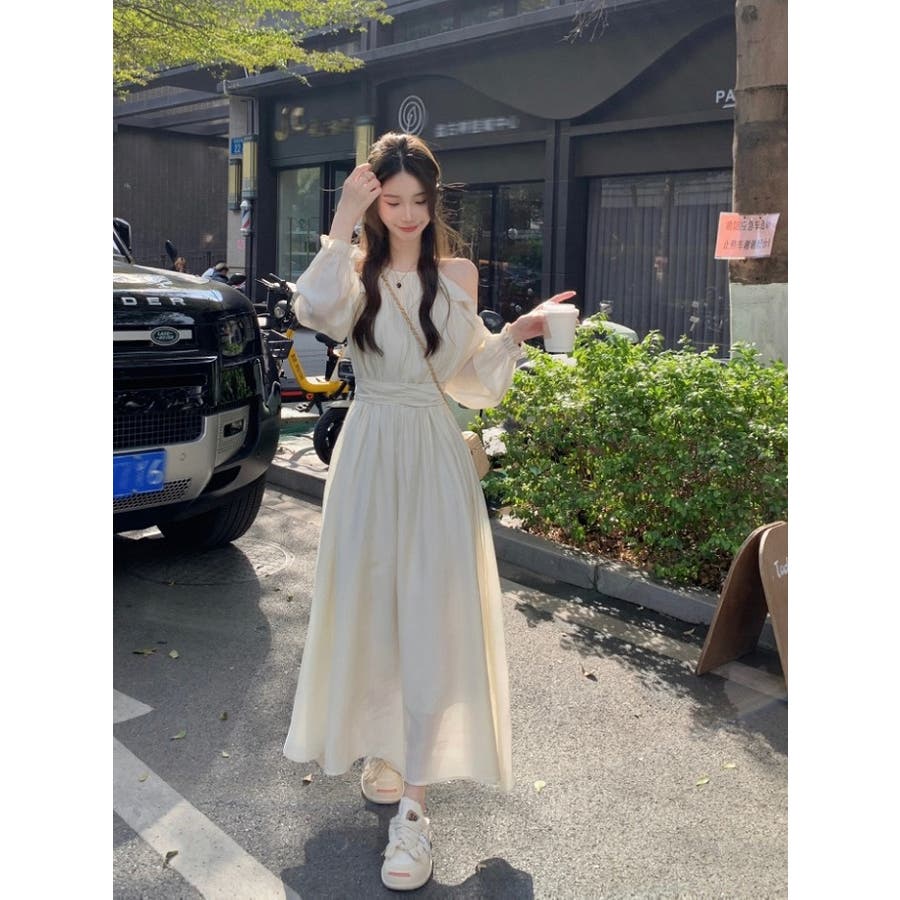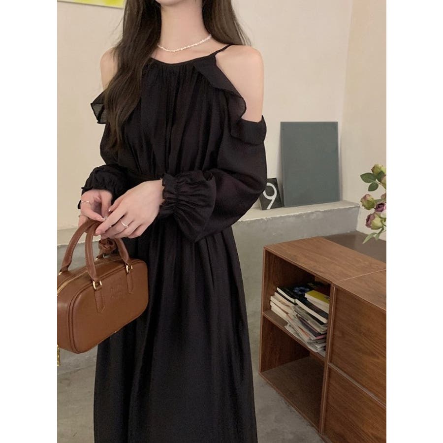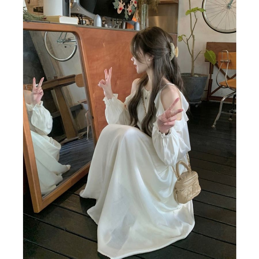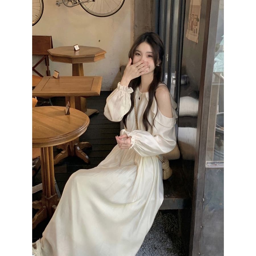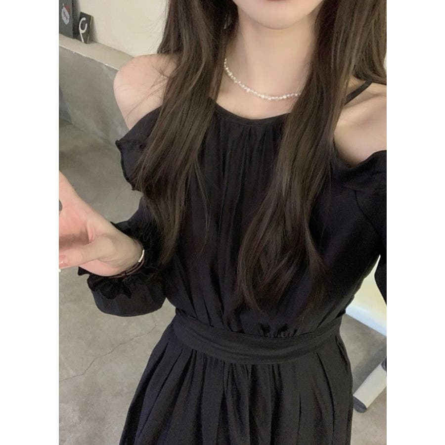 高級感があるフレア袖オフショルダー無地キャミワンピース