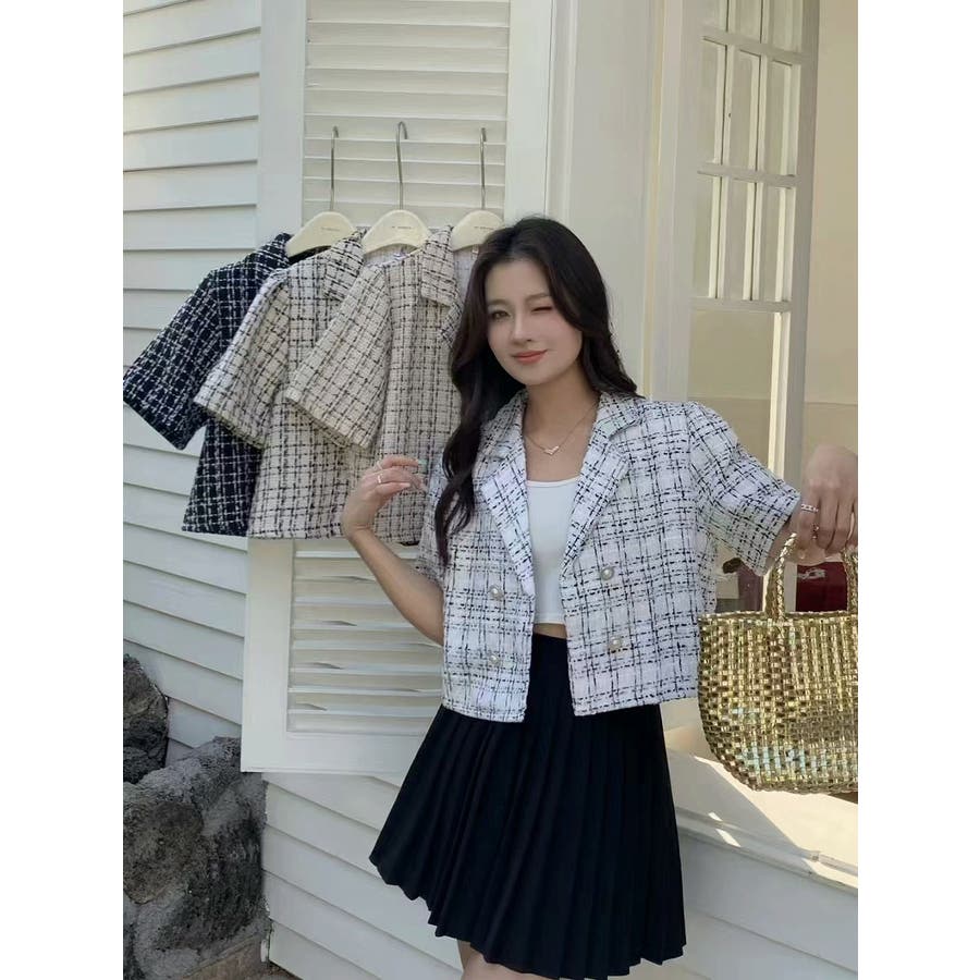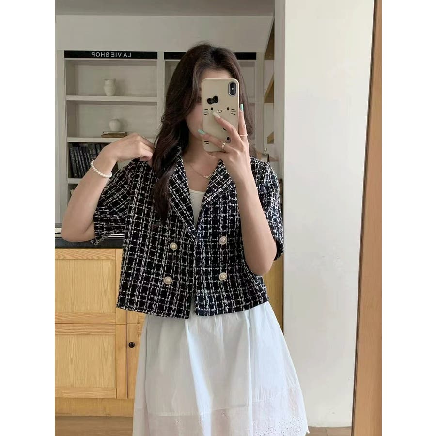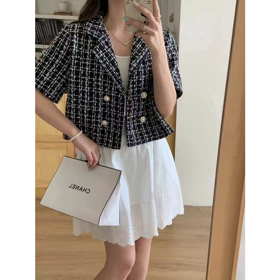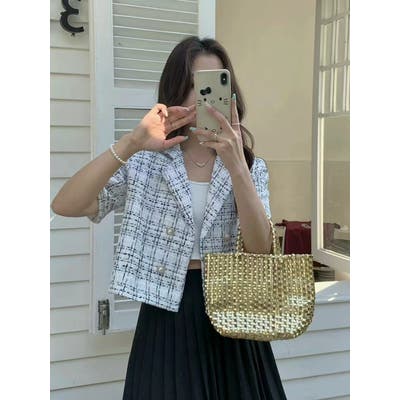 襟付きダブルブレスト半袖ツイードショートジャケット