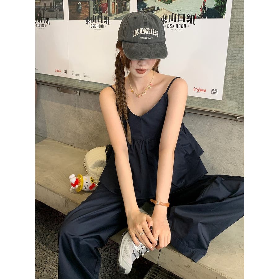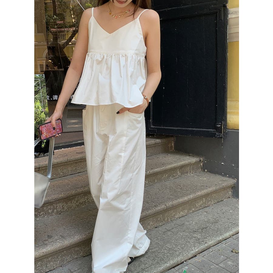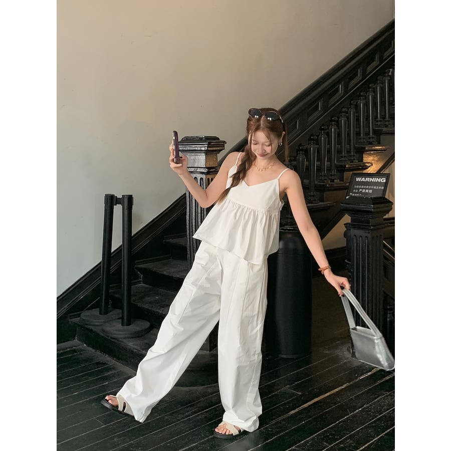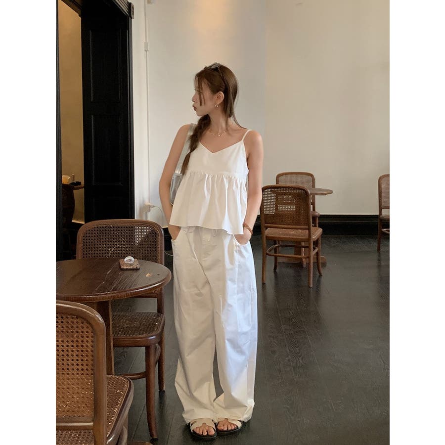 Vネックキャミソールポケット付きドローストリングワイドレッグ2点セットアップ