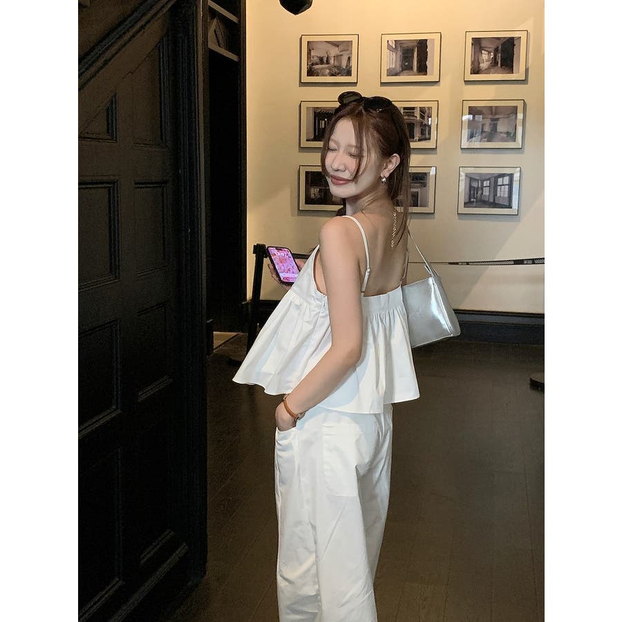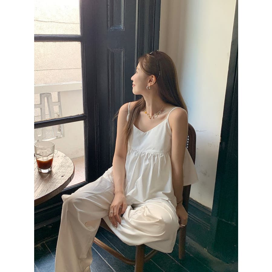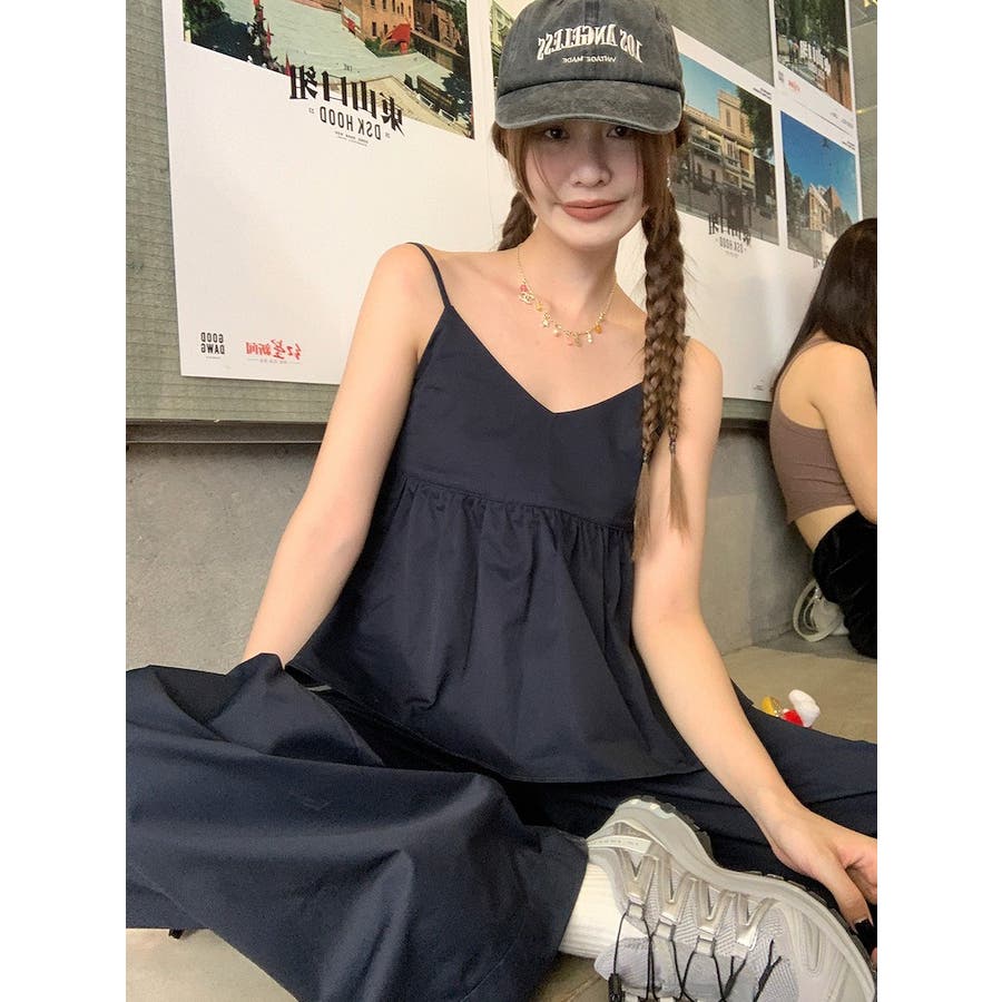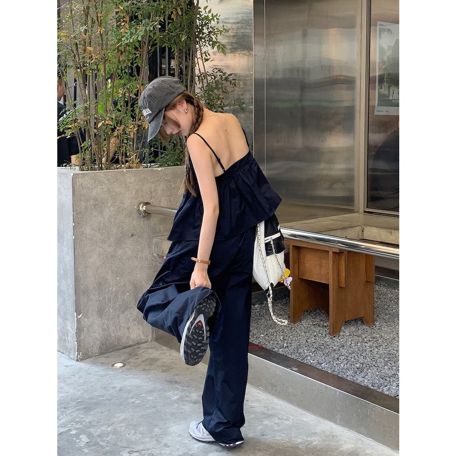 Vネックキャミソールポケット付きドローストリングワイドレッグ2点セットアップ