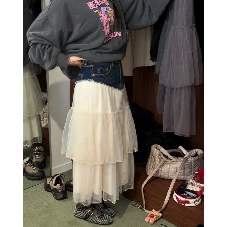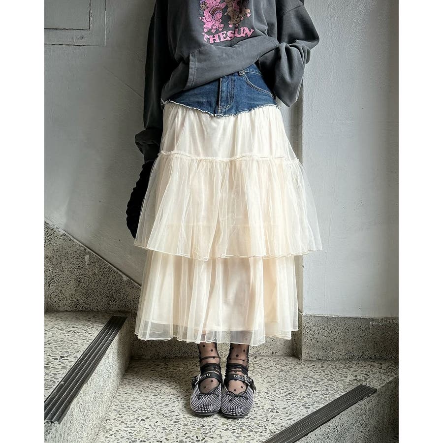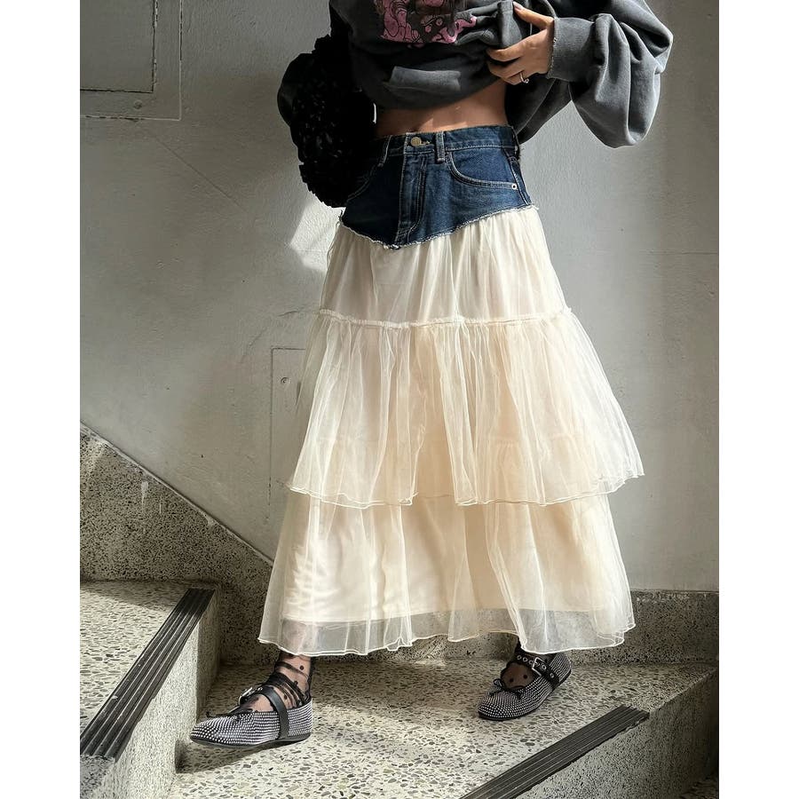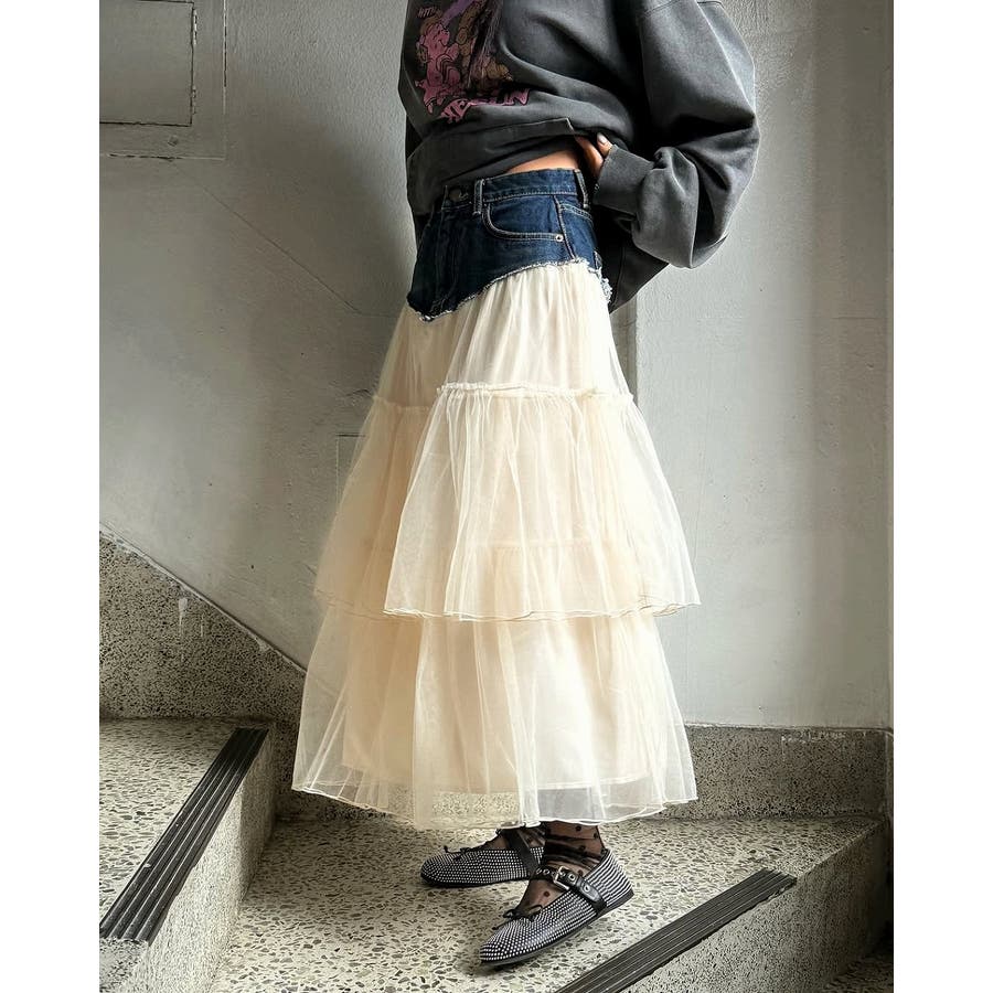 ポケット付きチュール切り替えデニムスカート