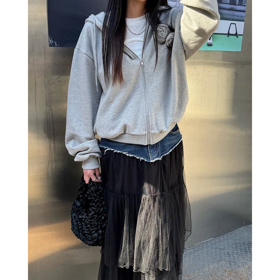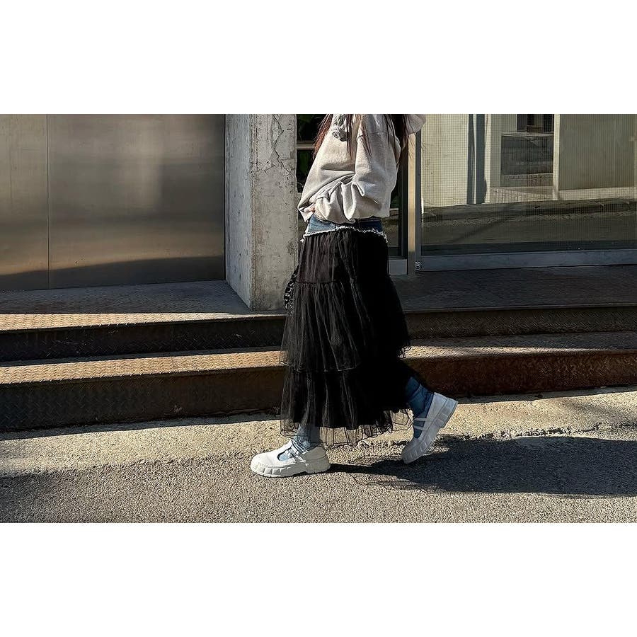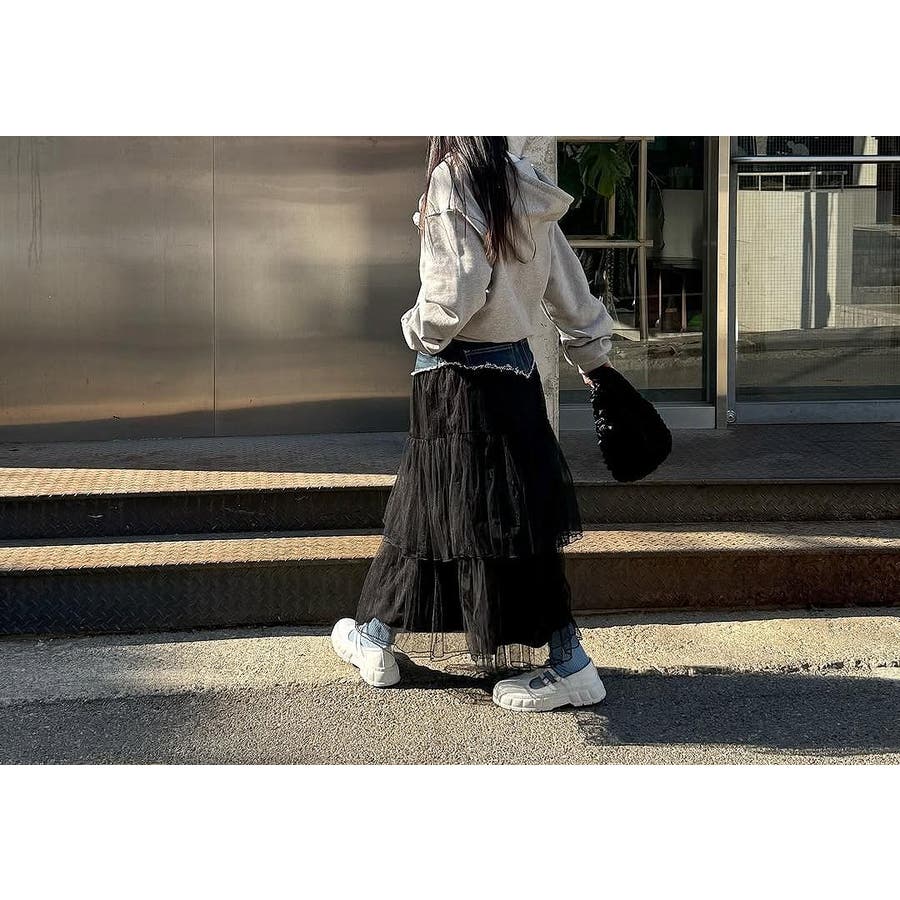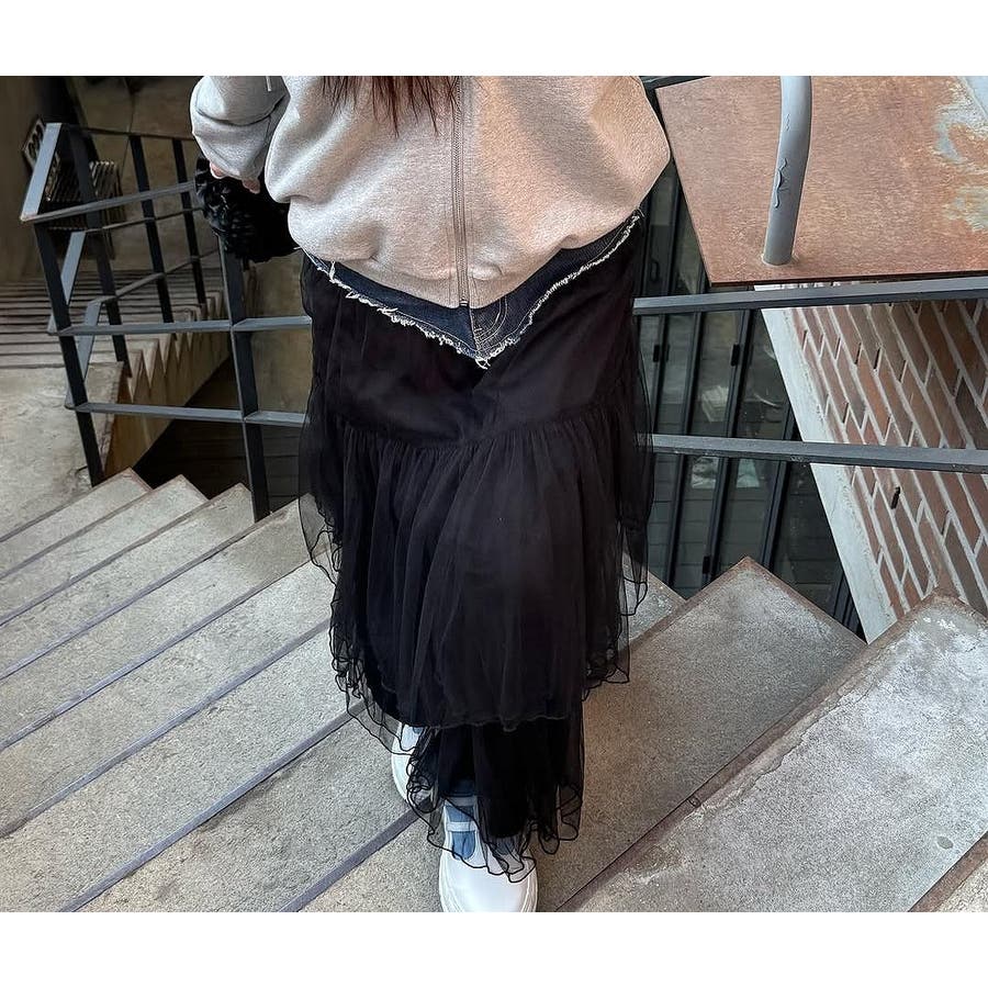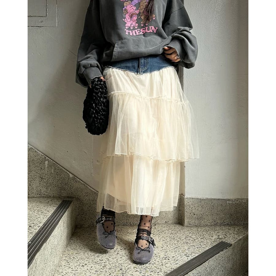 ポケット付きチュール切り替えデニムスカート