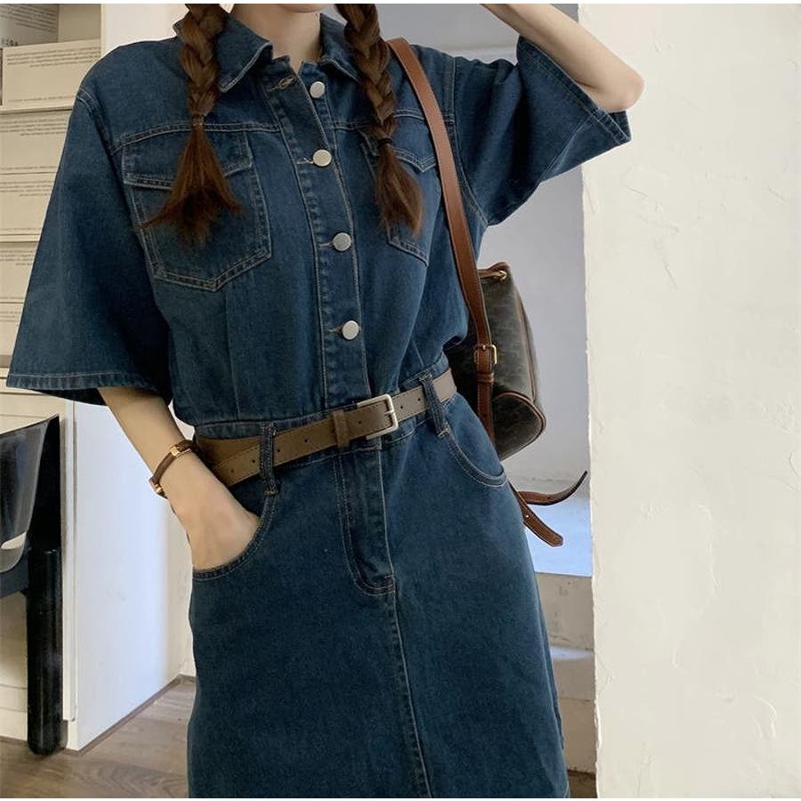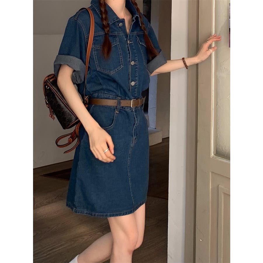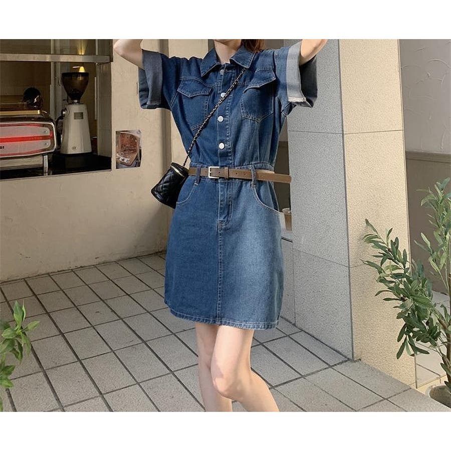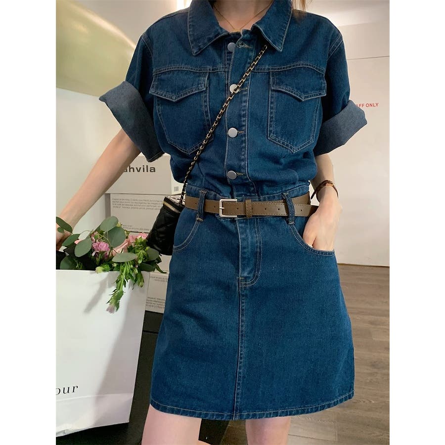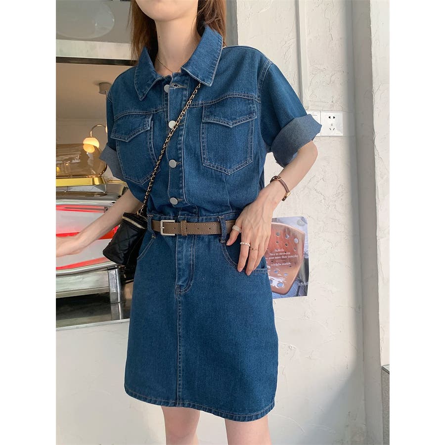 半袖ベルト付きポケット付きデニムワンピース