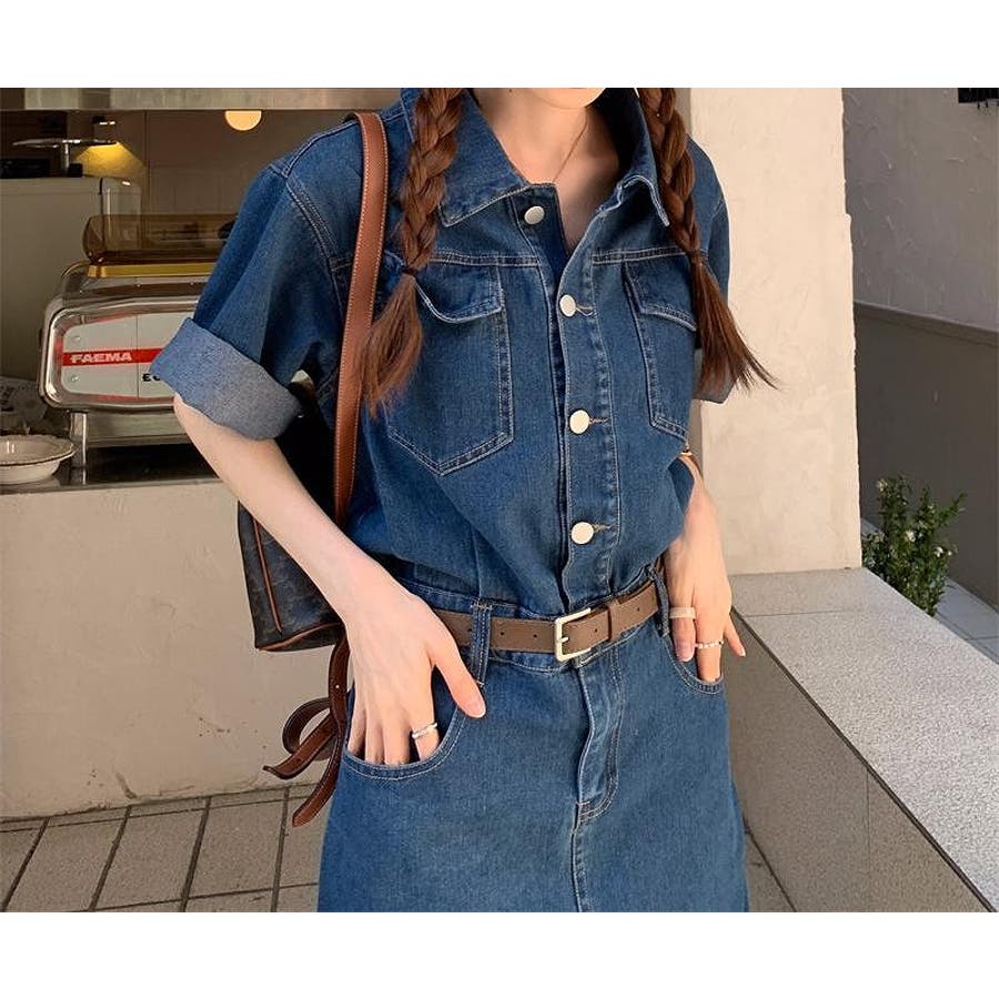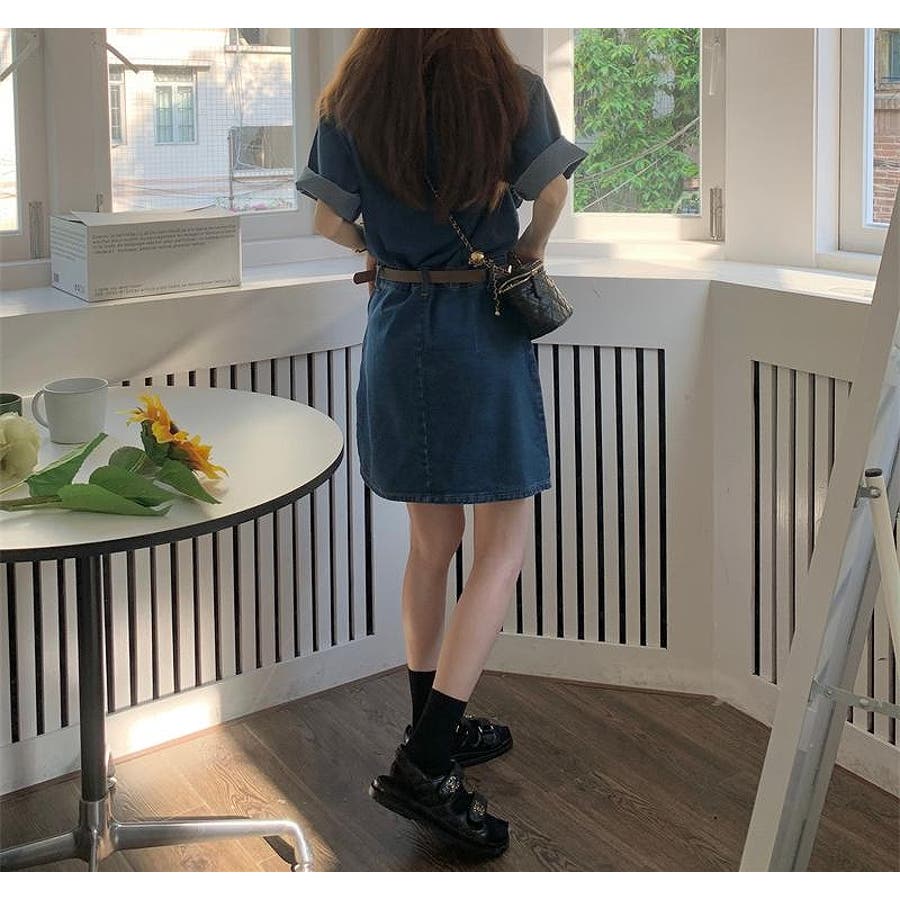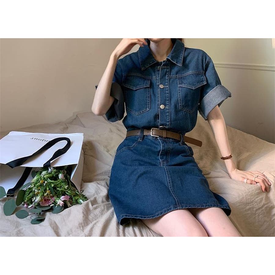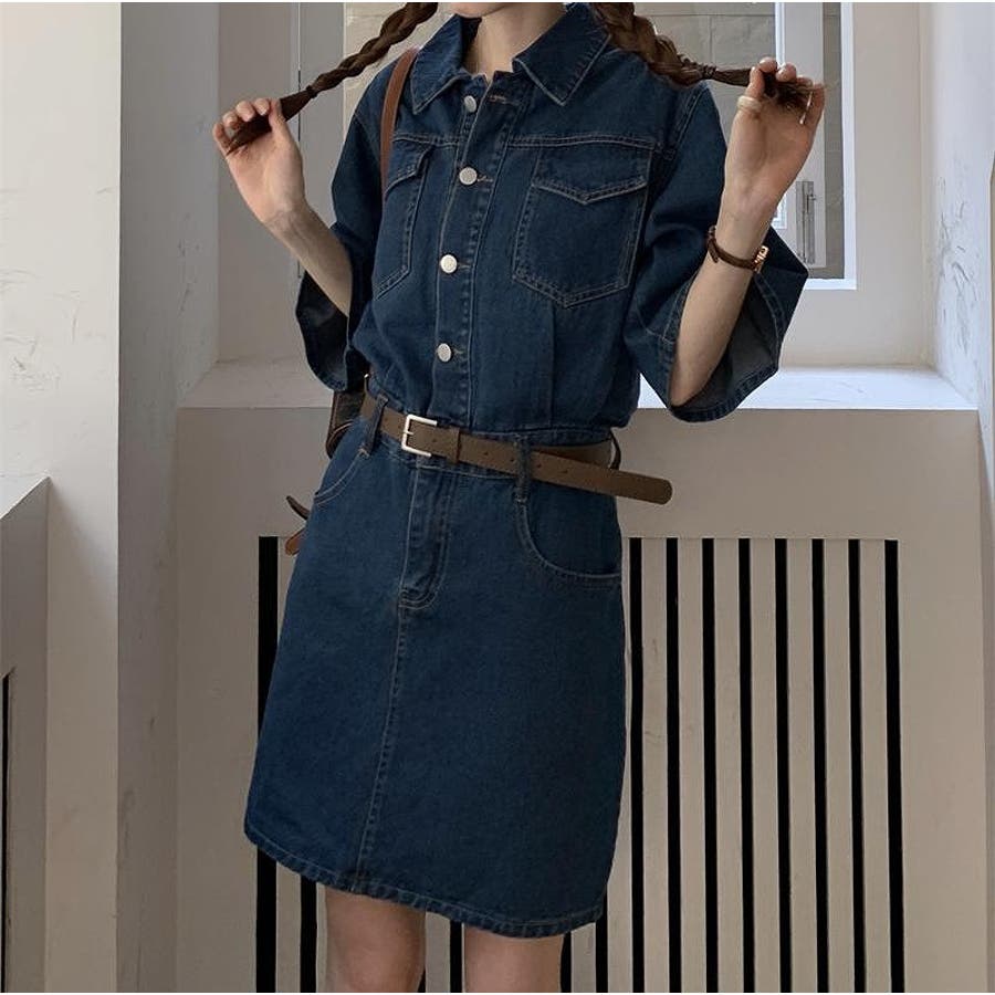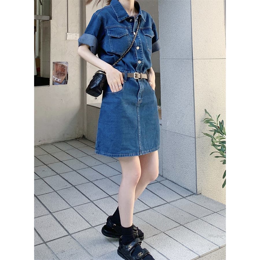 半袖ベルト付きポケット付きデニムワンピース