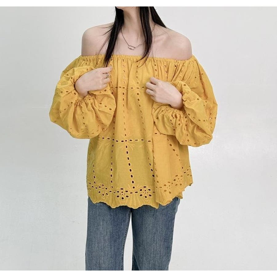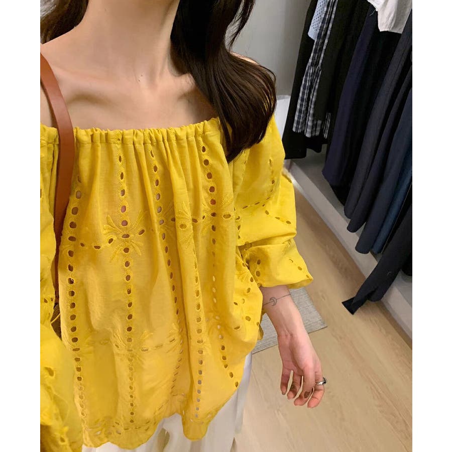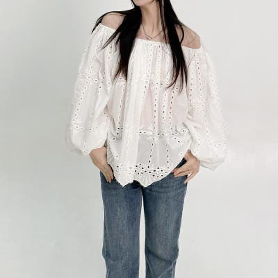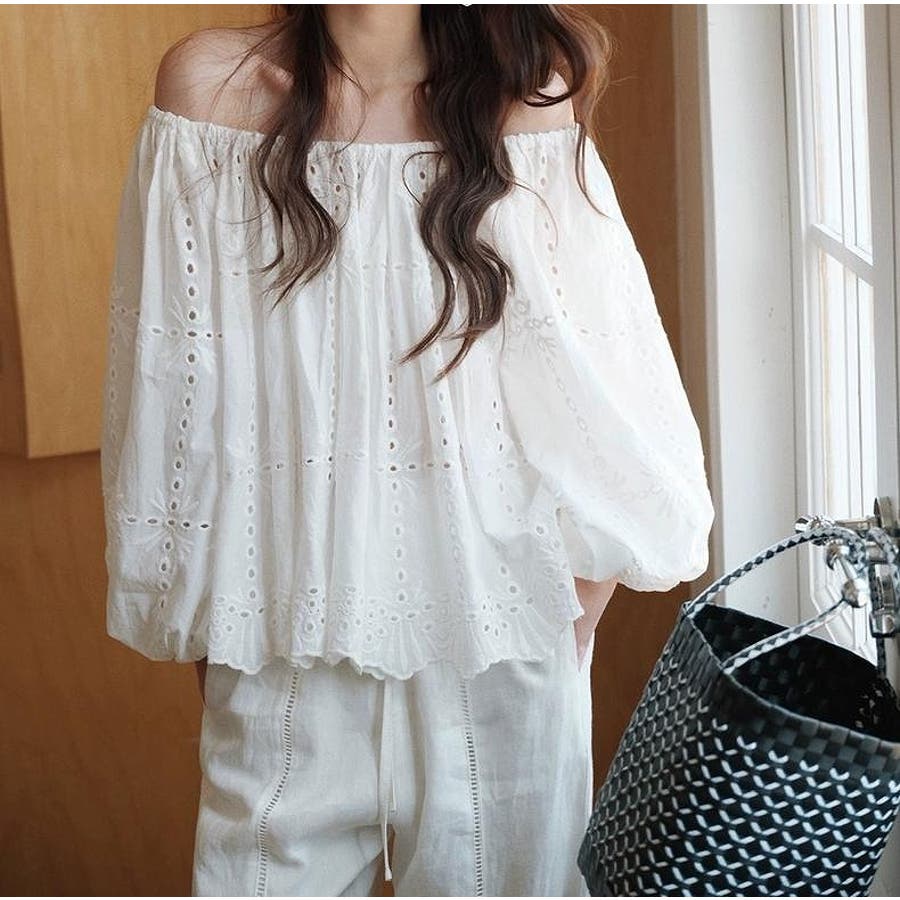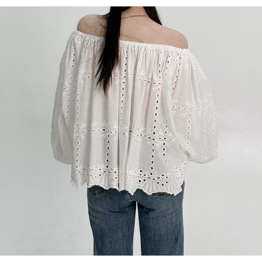 刺繍パフスリーブオフショルダートップス