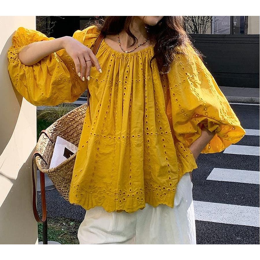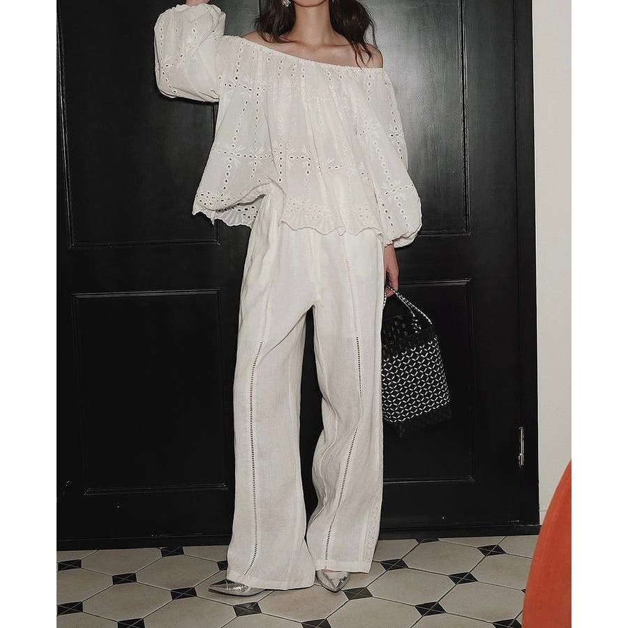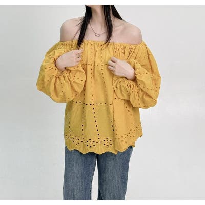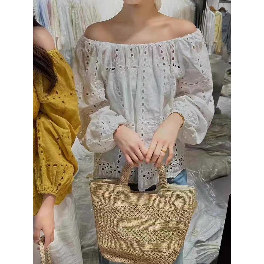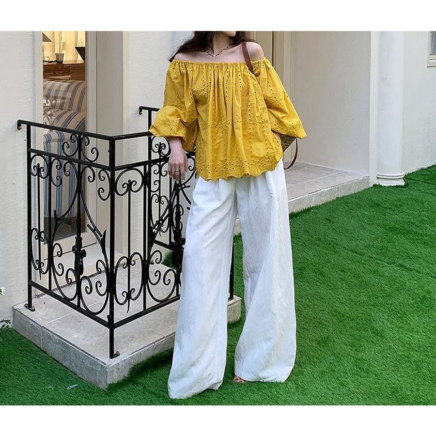 刺繍パフスリーブオフショルダートップス