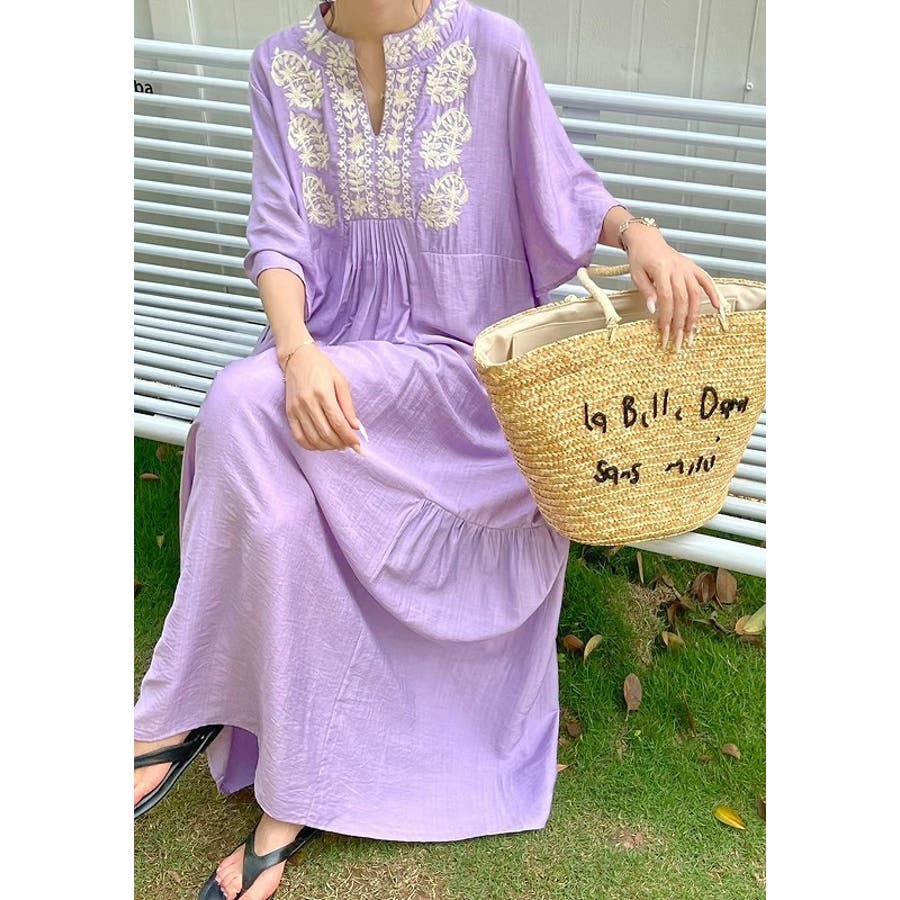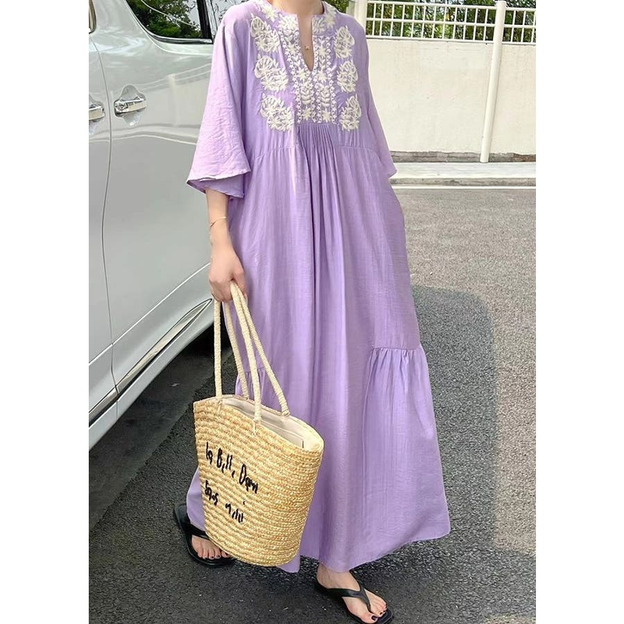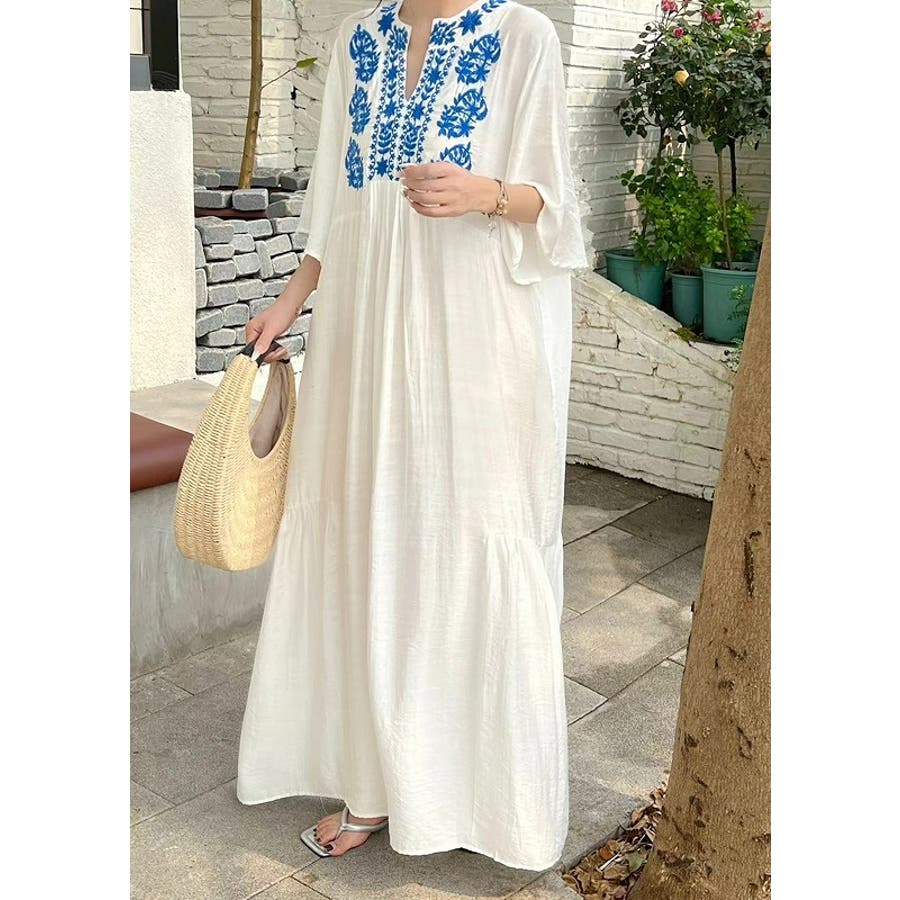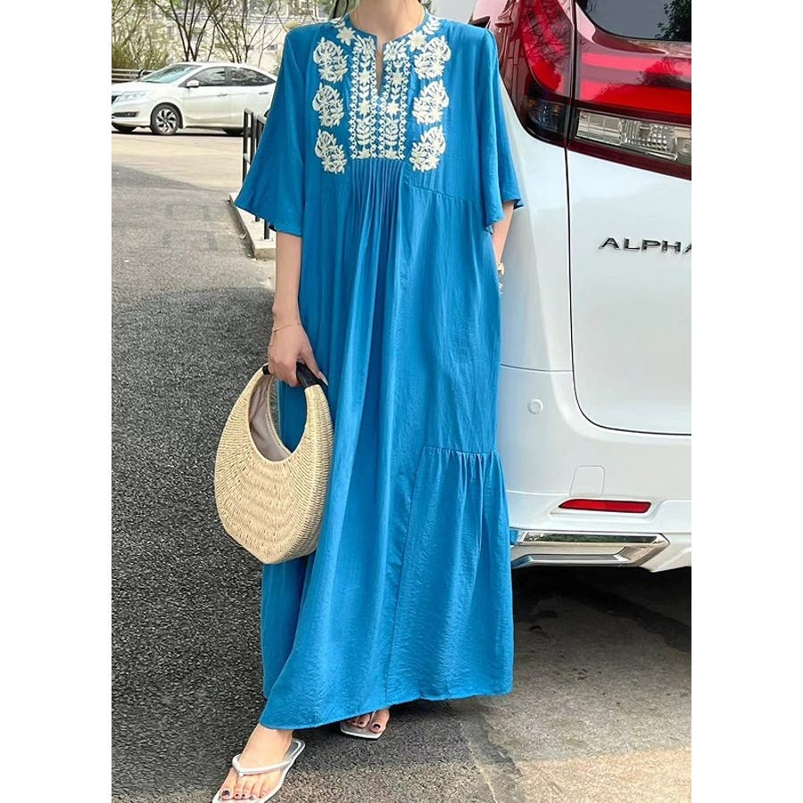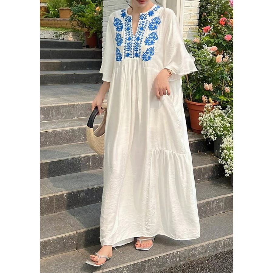 刺繍半袖ロングVネックワンピース