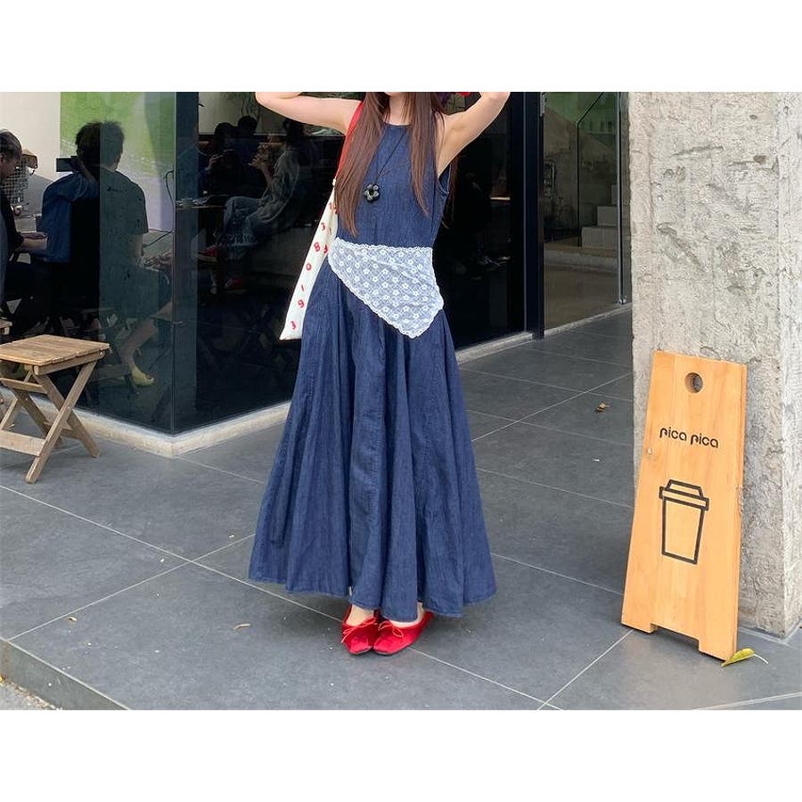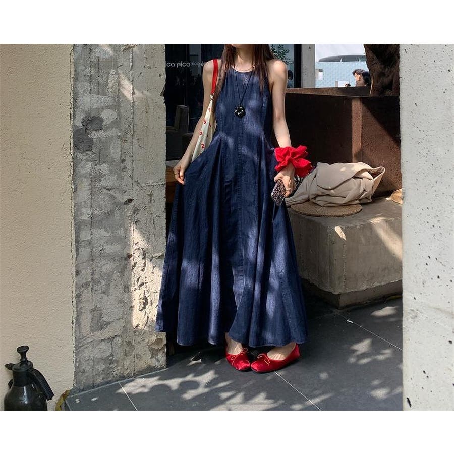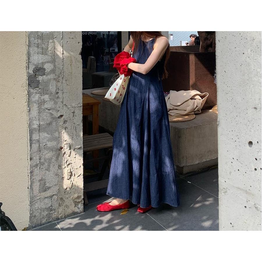袖なしロングデニムワンピース