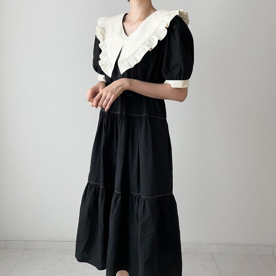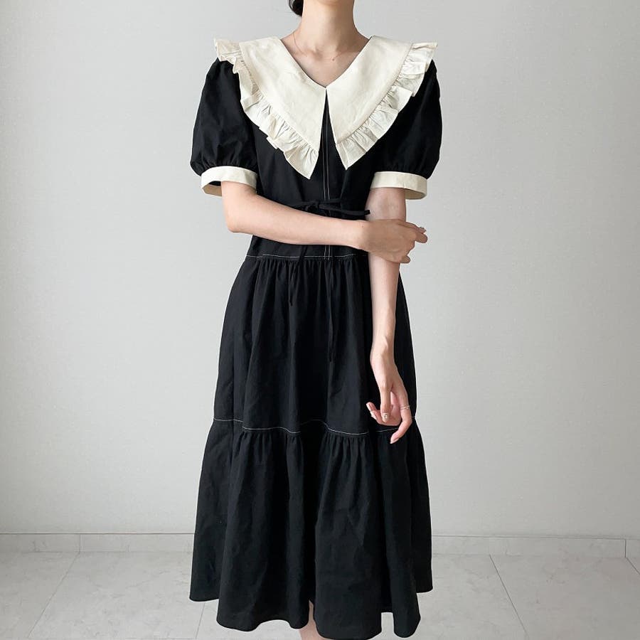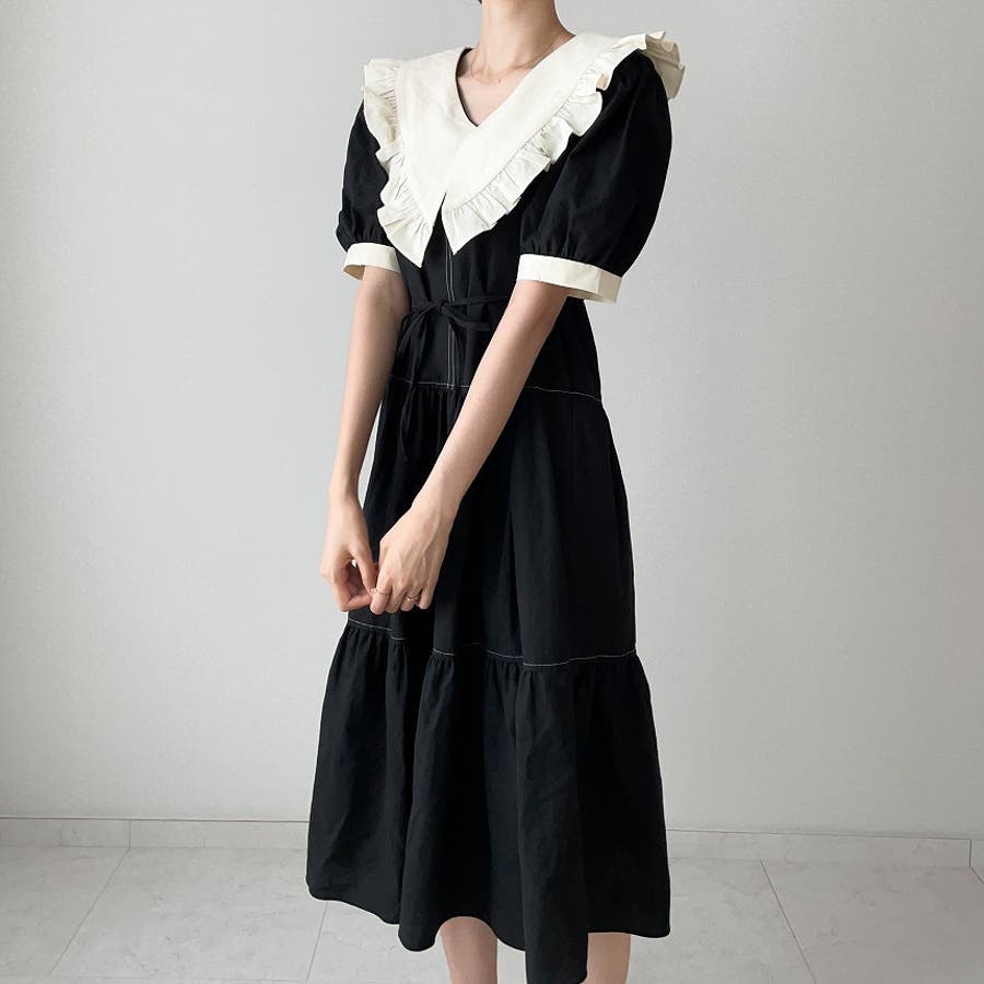 配色デカ襟半袖ワンピース
