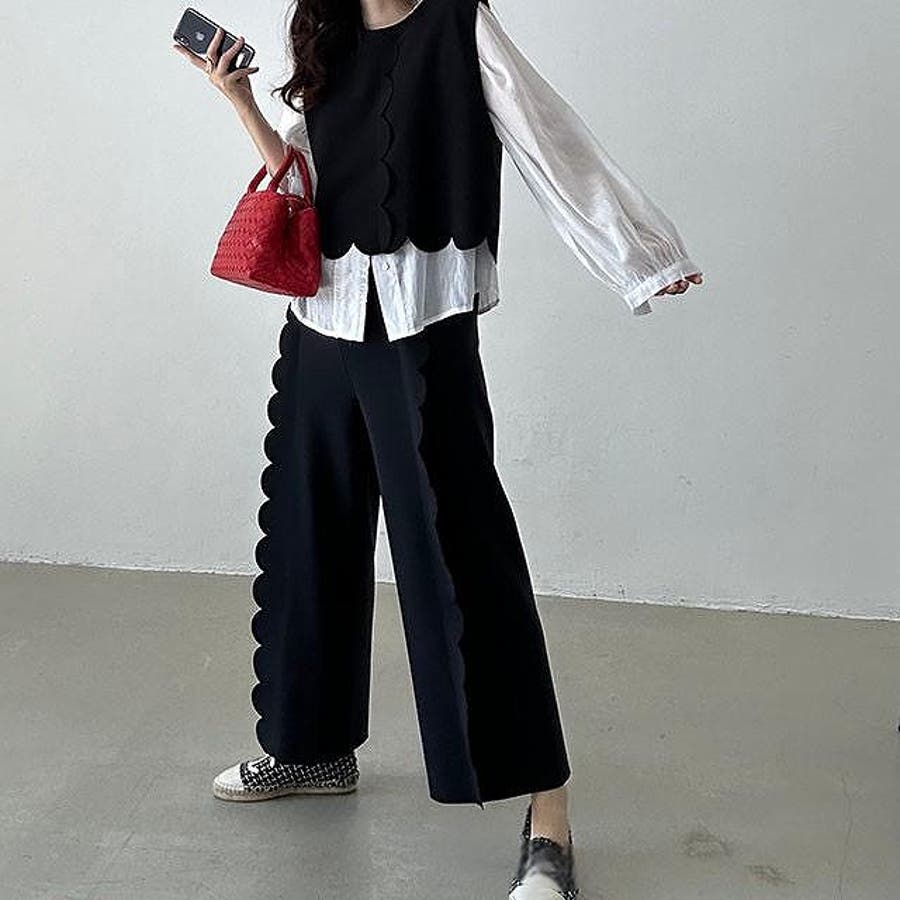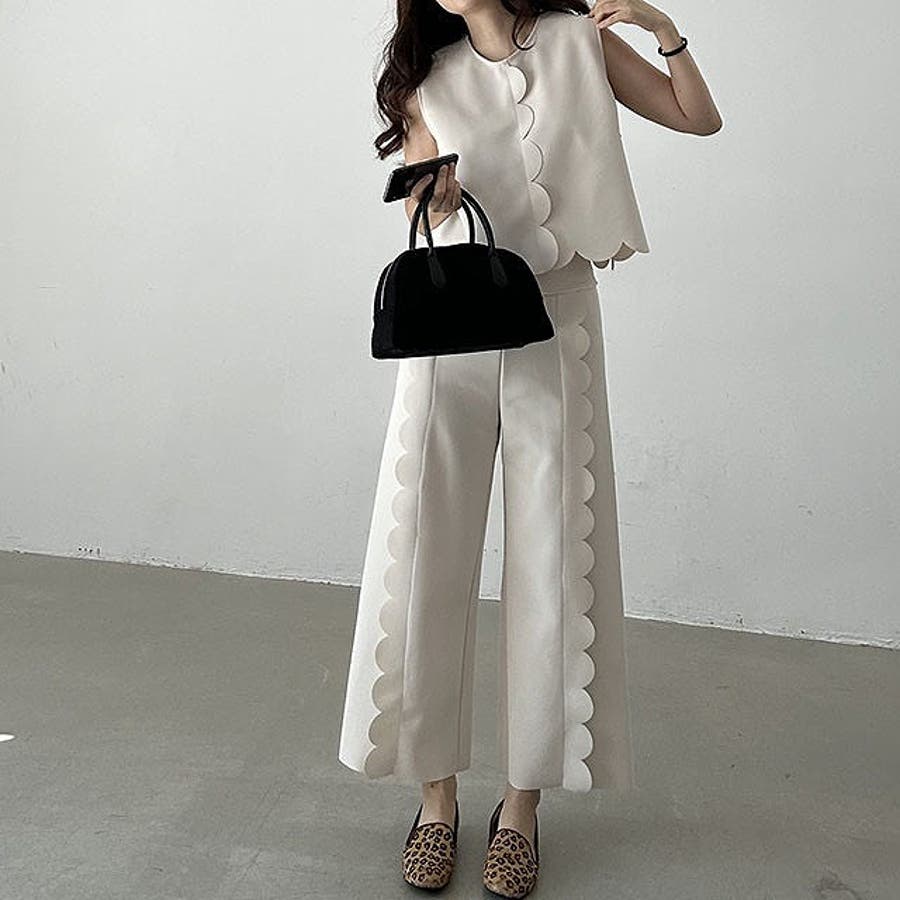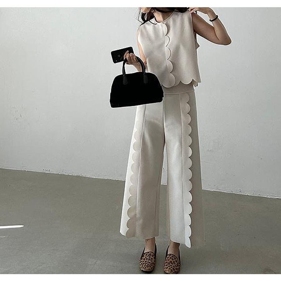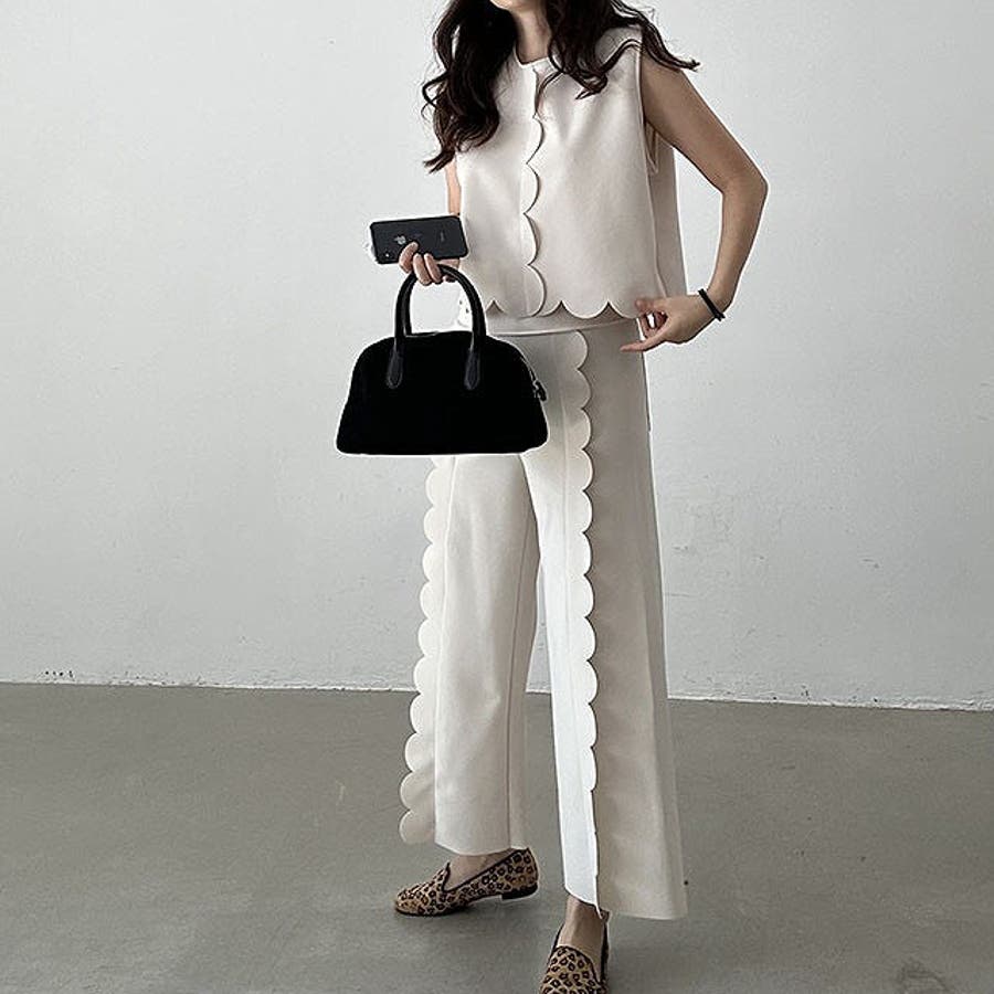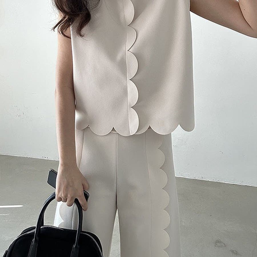 袖なしクルーネックトップスハイウエストパンツセットアップ