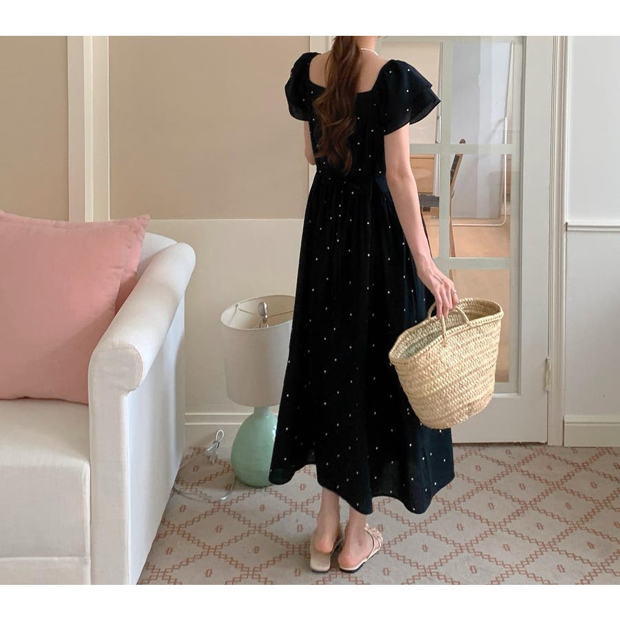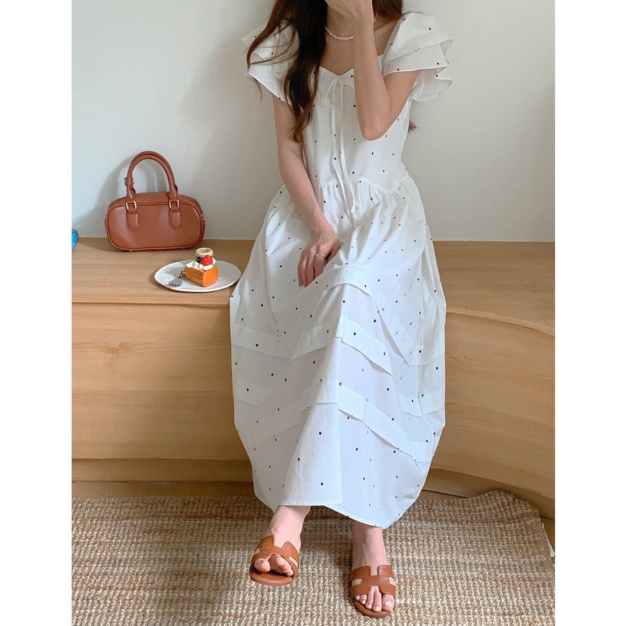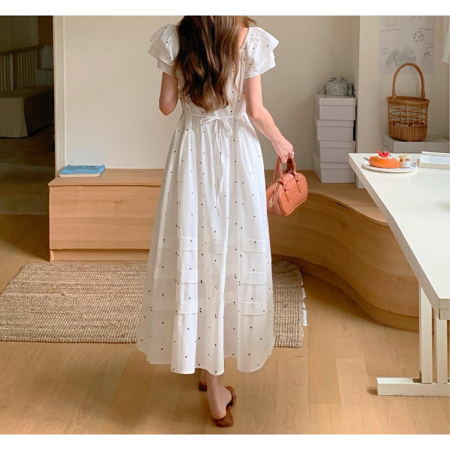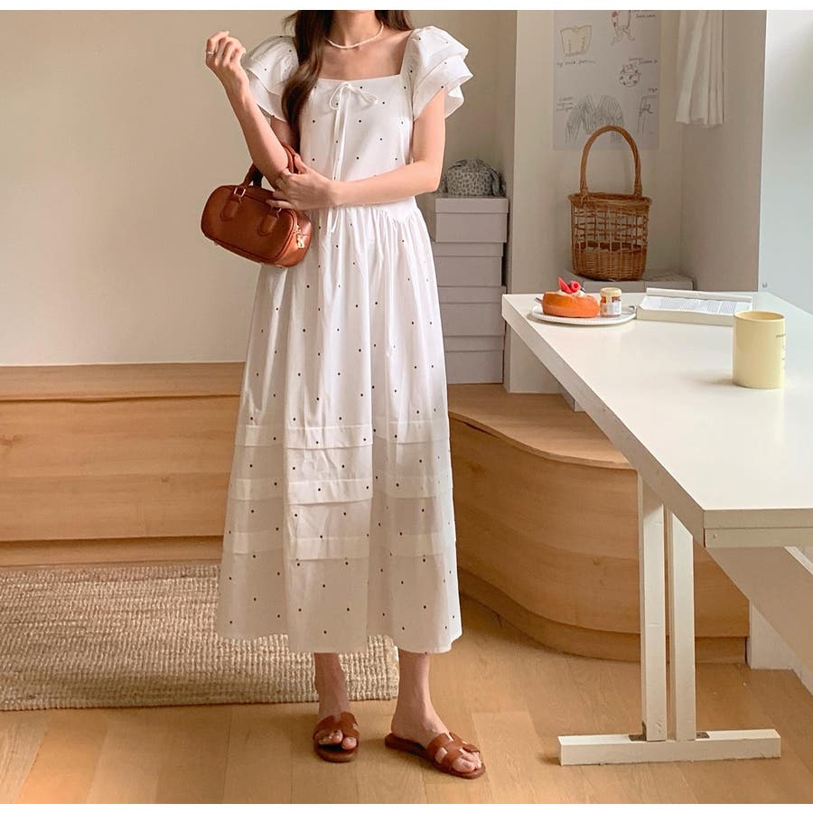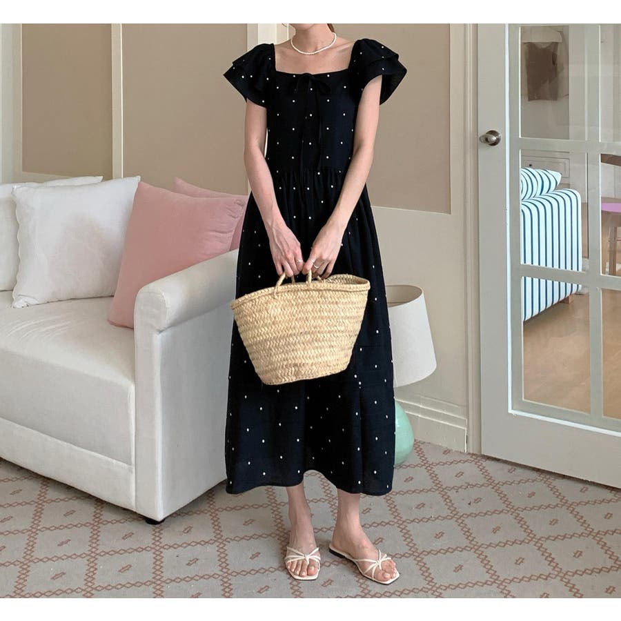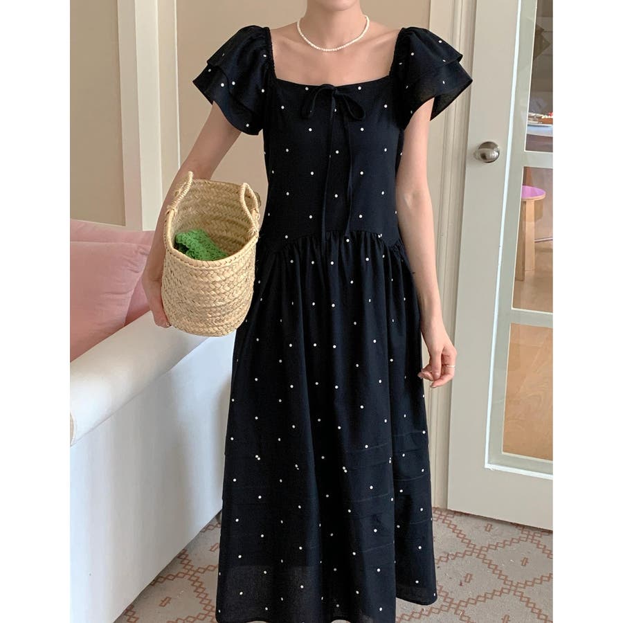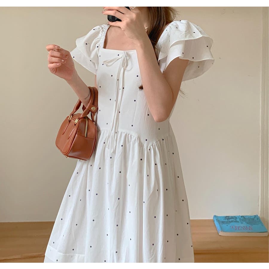 リボンスクエアネックラインドット柄ワンピース