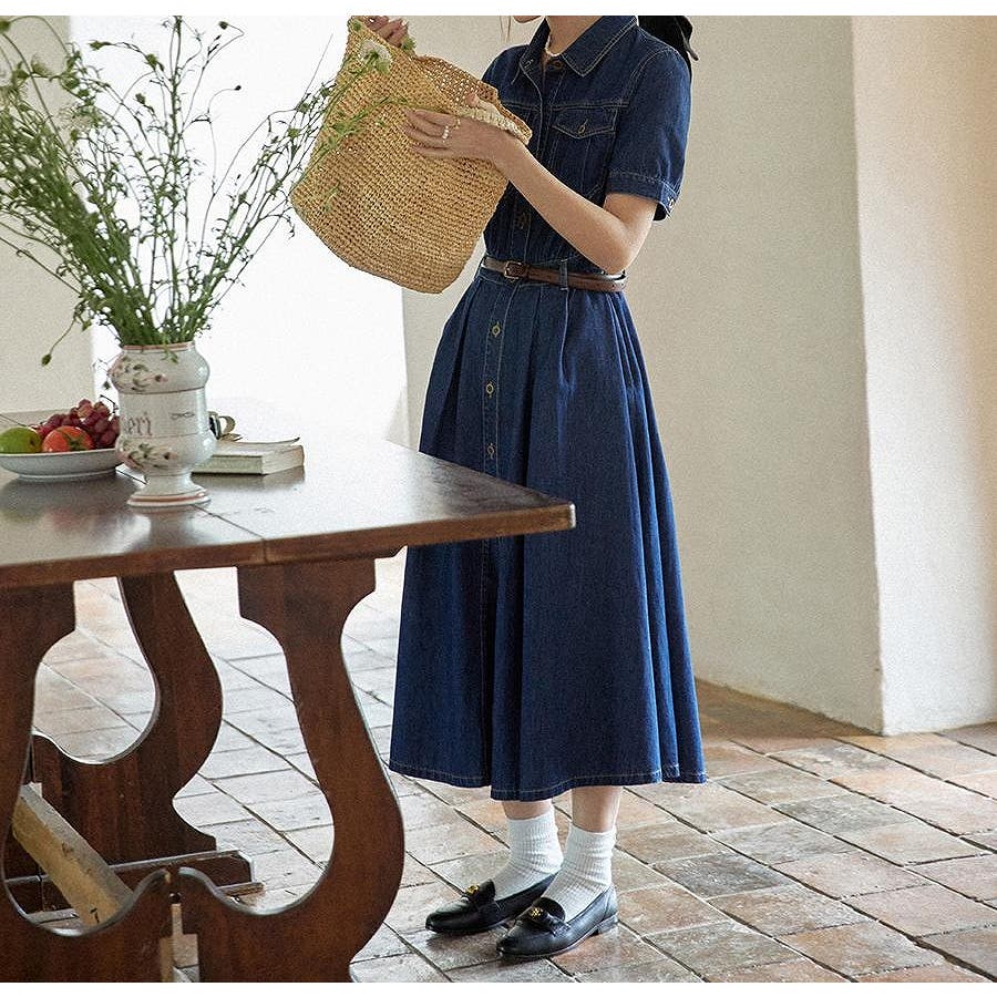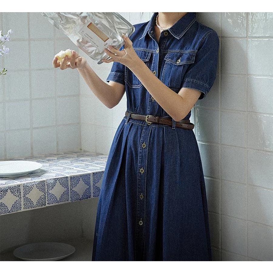 半袖シングルブレストデニムワンピース