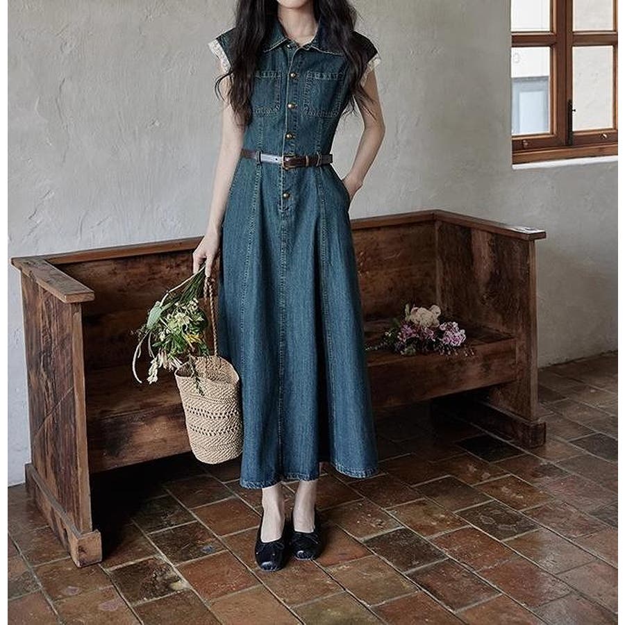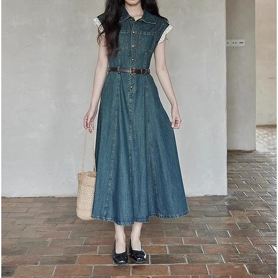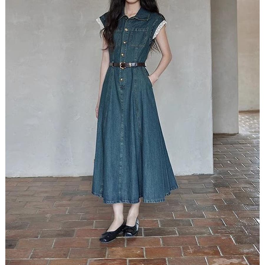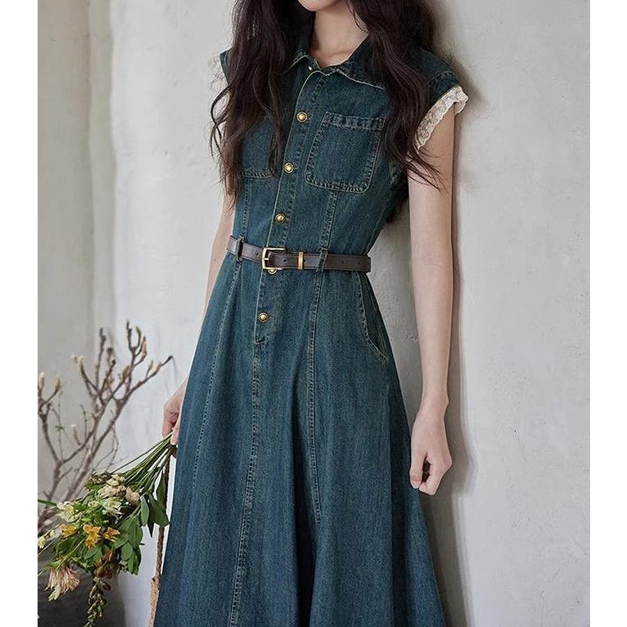 ベルト付きデニムワンピース