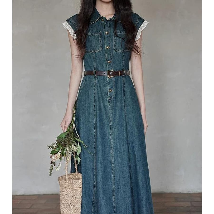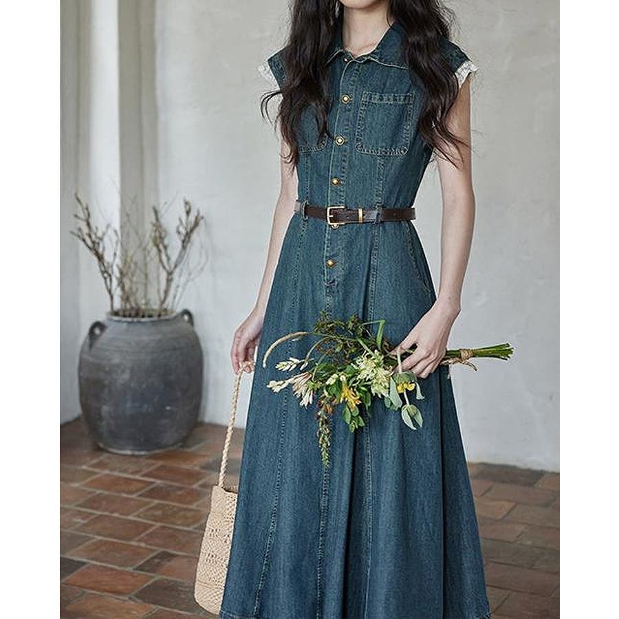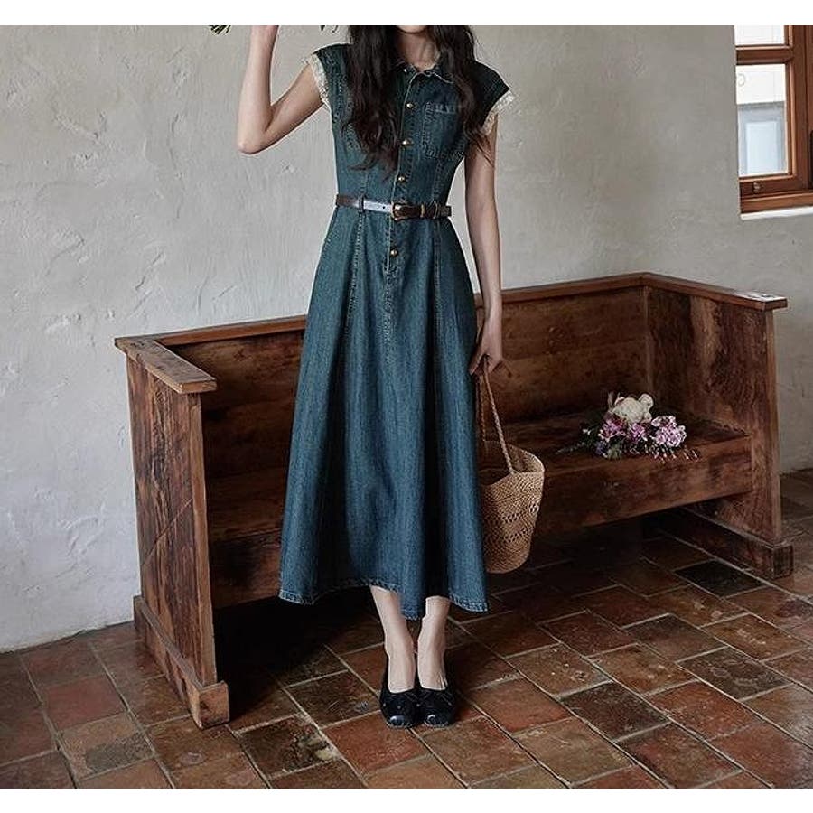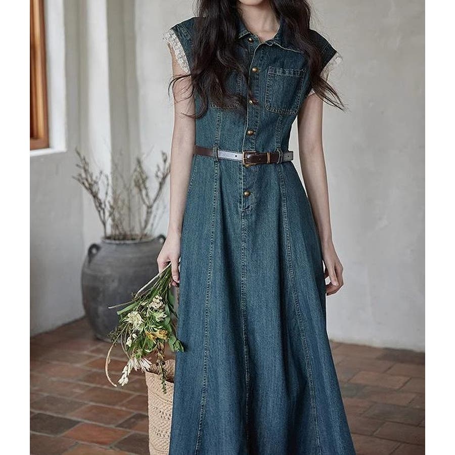 ベルト付きデニムワンピース