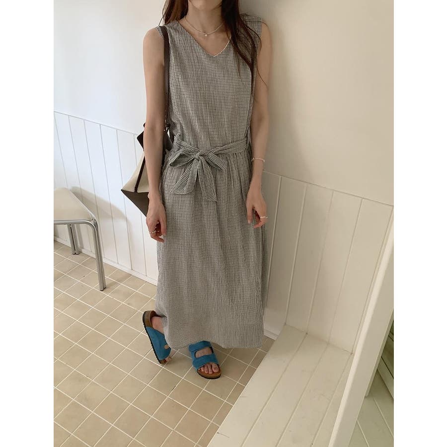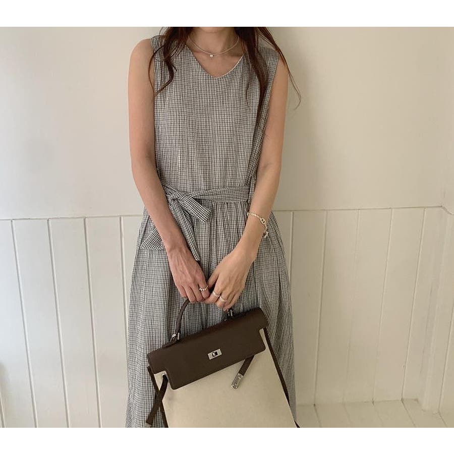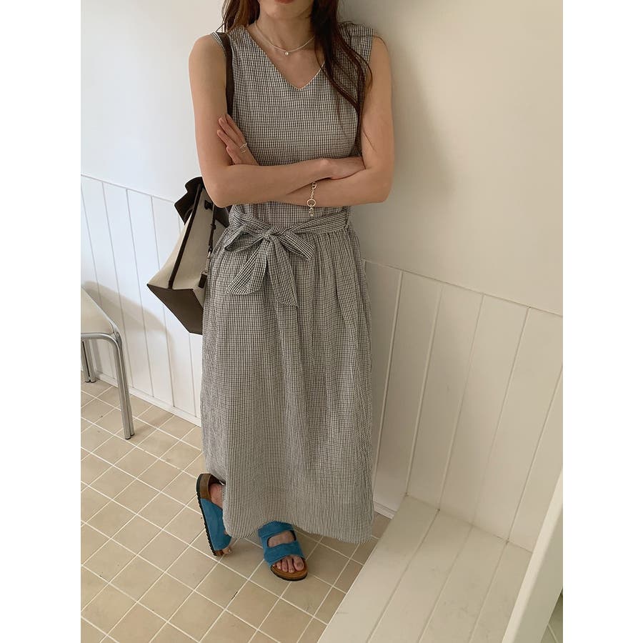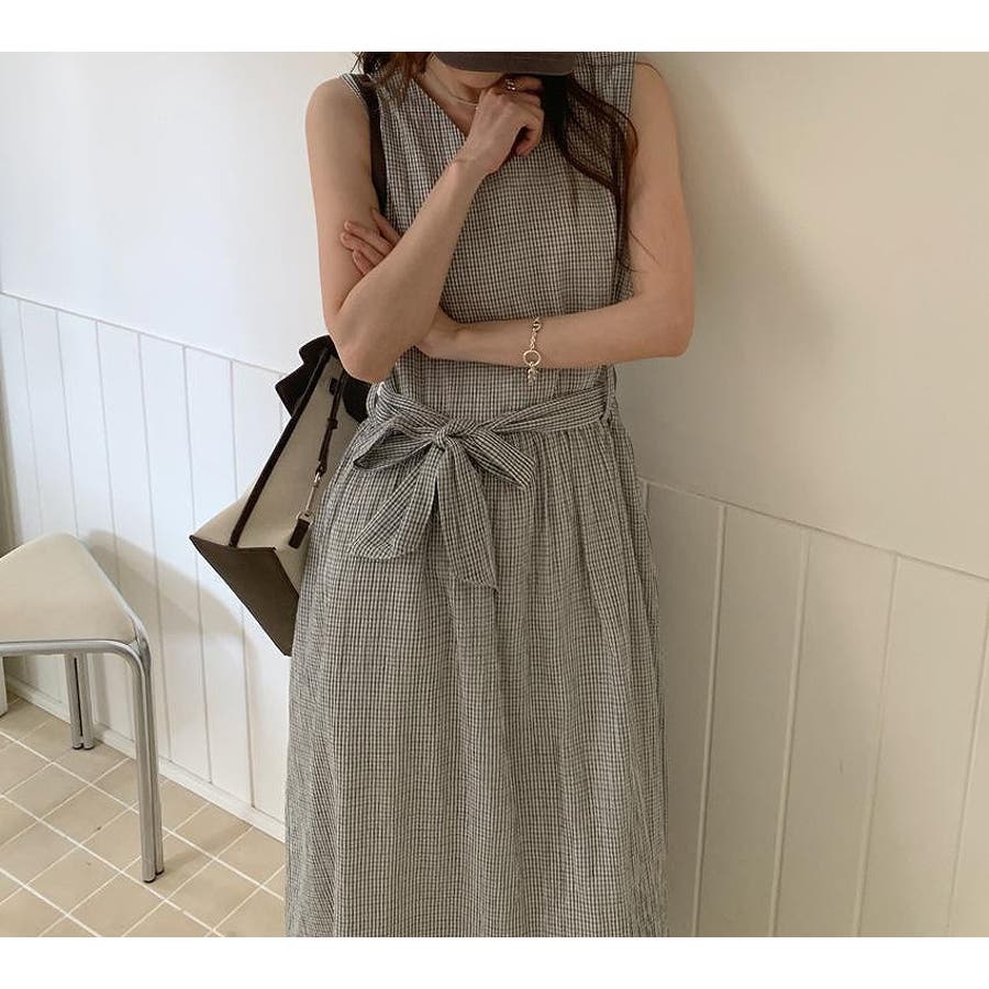 リボン袖なしチェック柄ワンピース