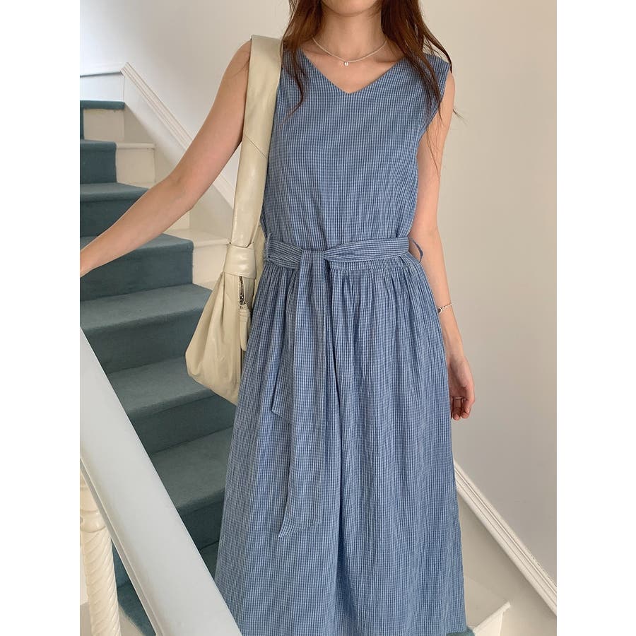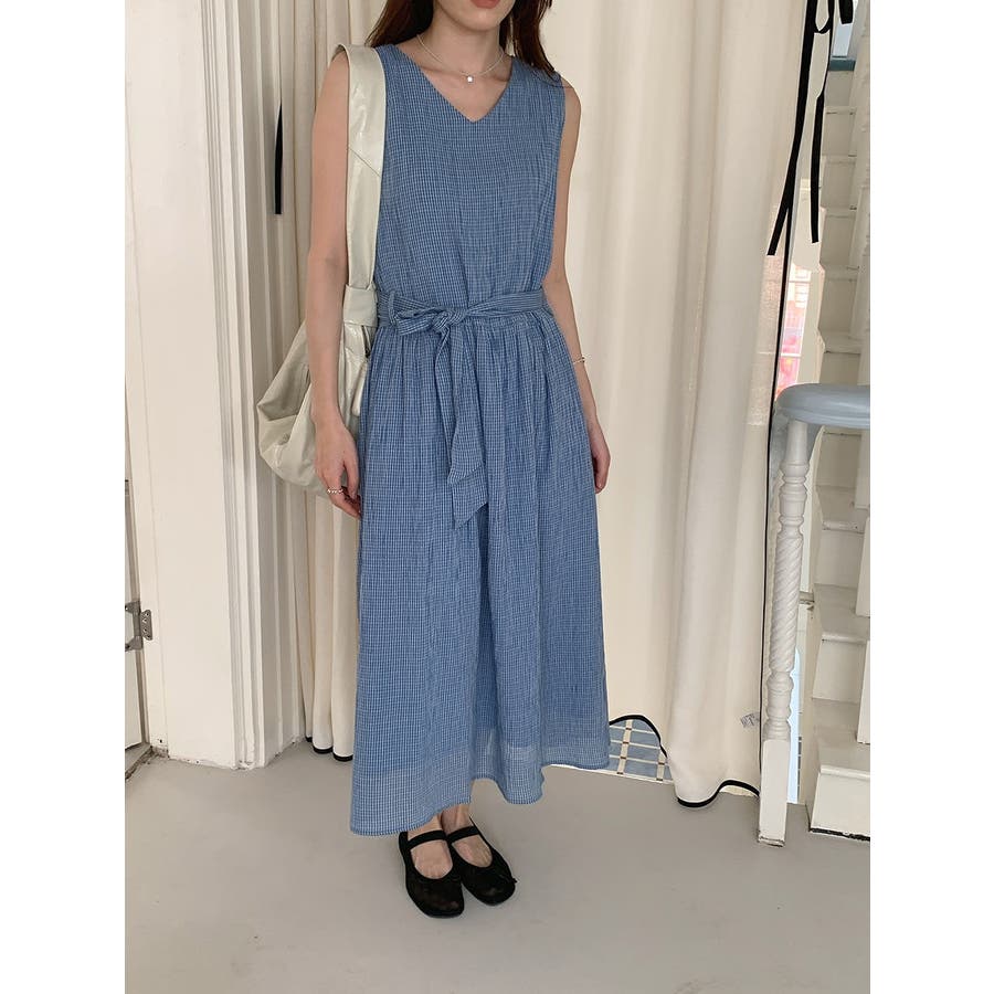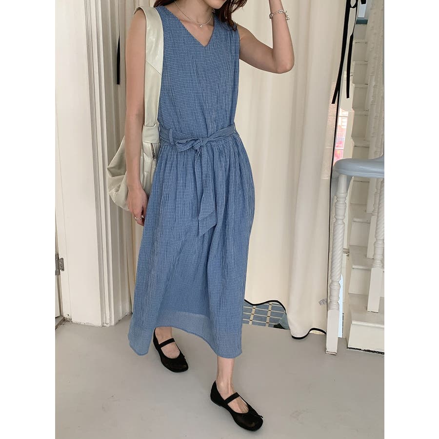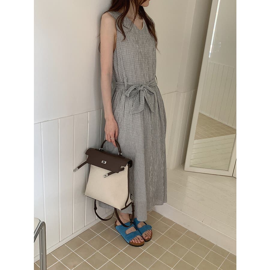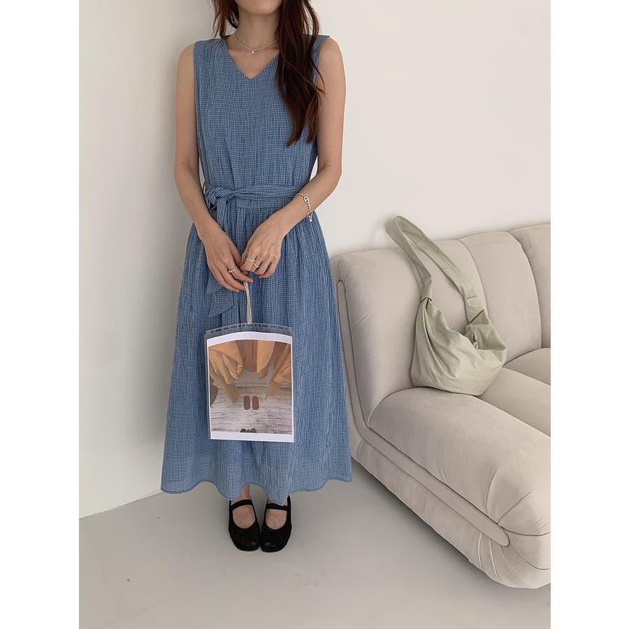 リボン袖なしチェック柄ワンピース