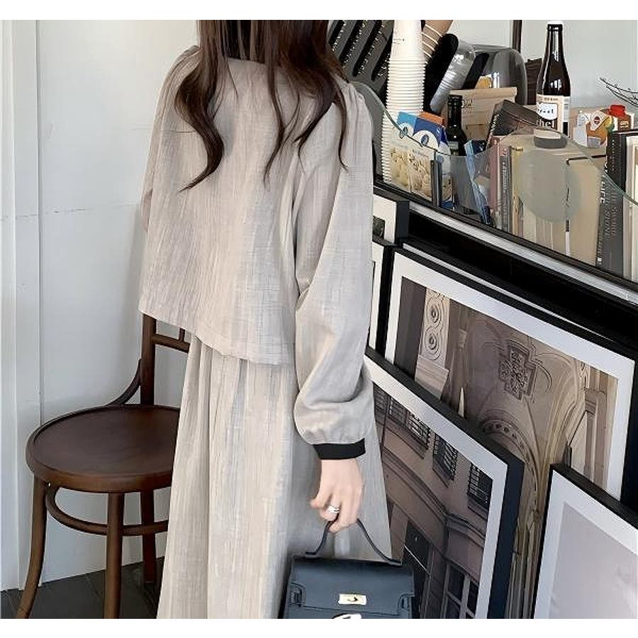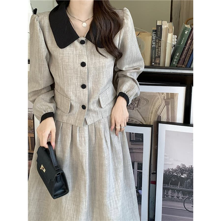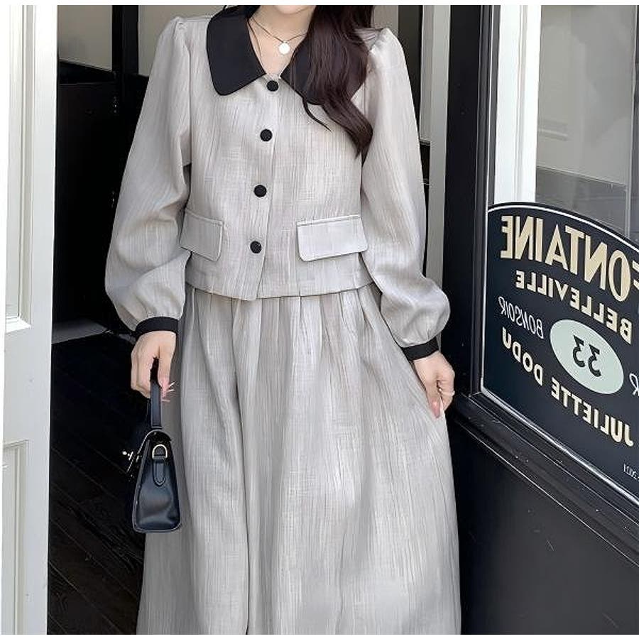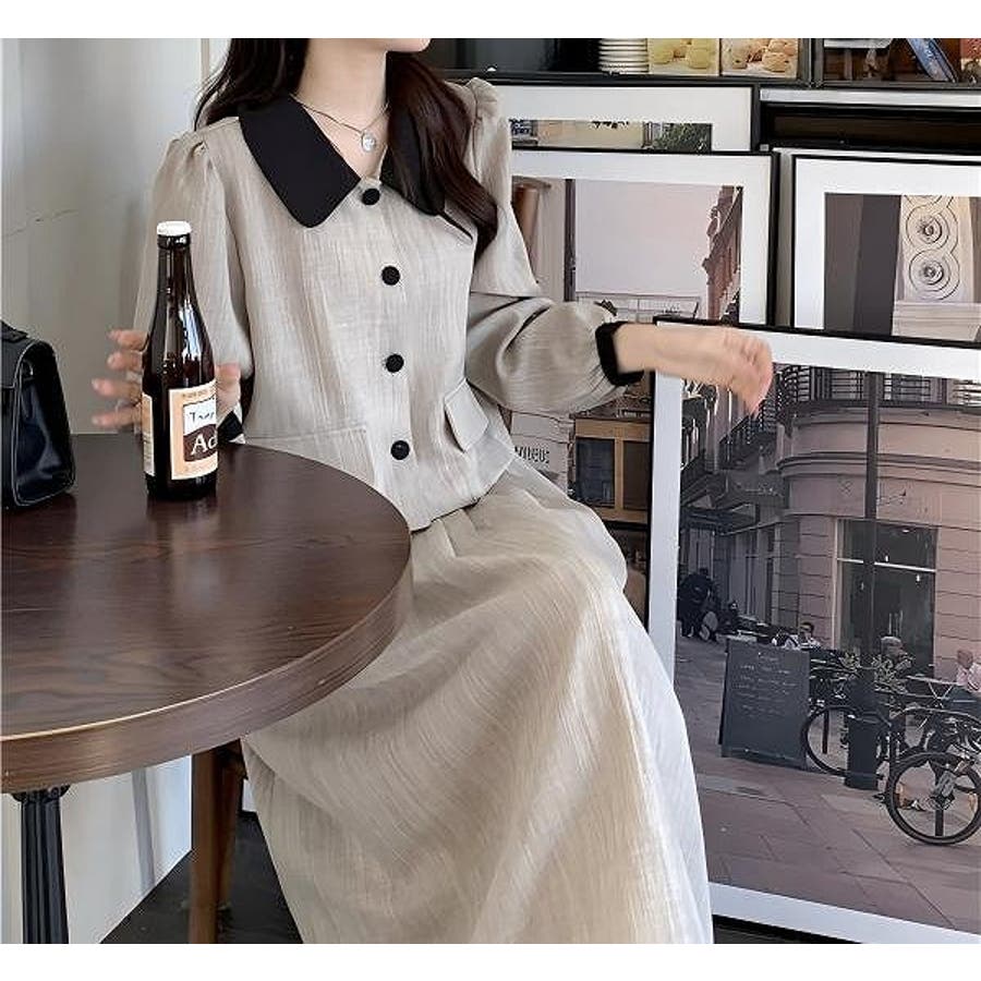 カラーコントラストの襟付きシャツジャケットスカートセットアップ
