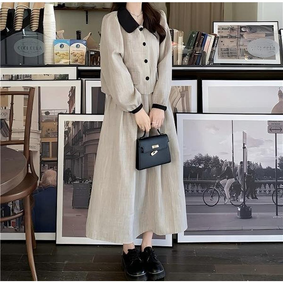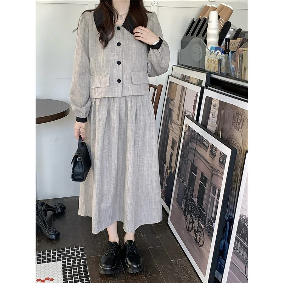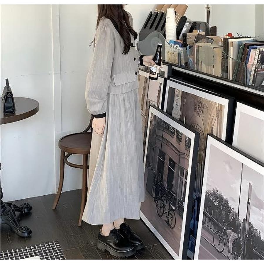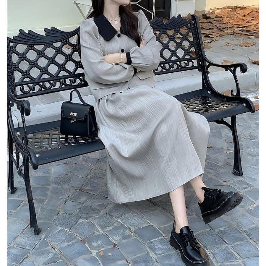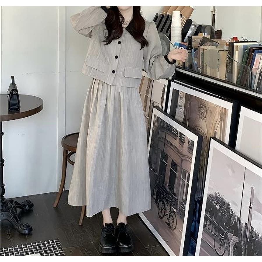 カラーコントラストの襟付きシャツジャケットスカートセットアップ
