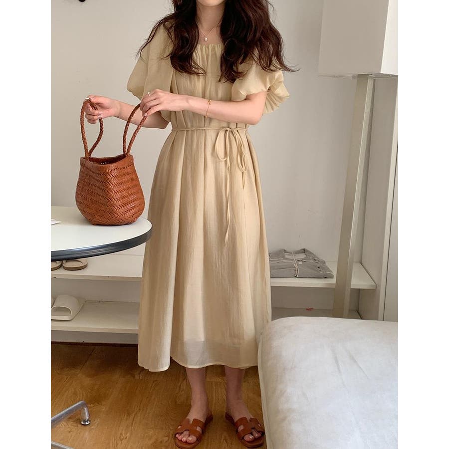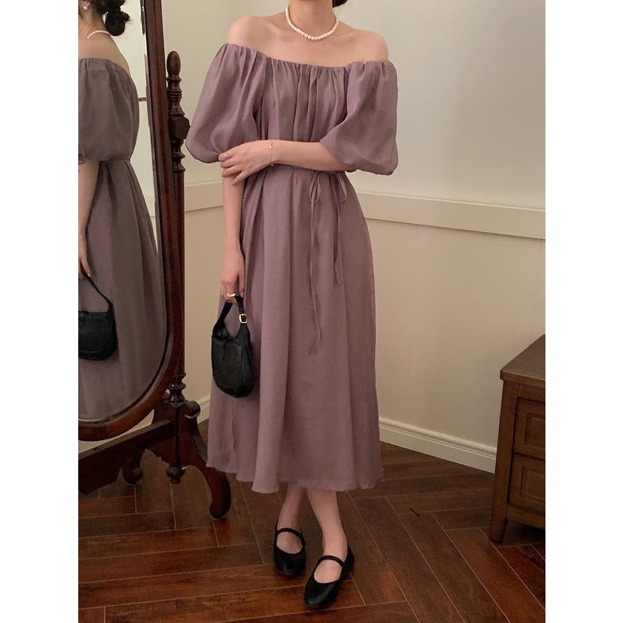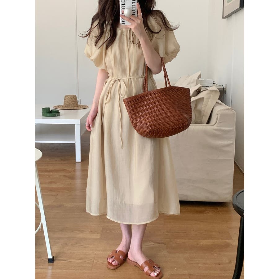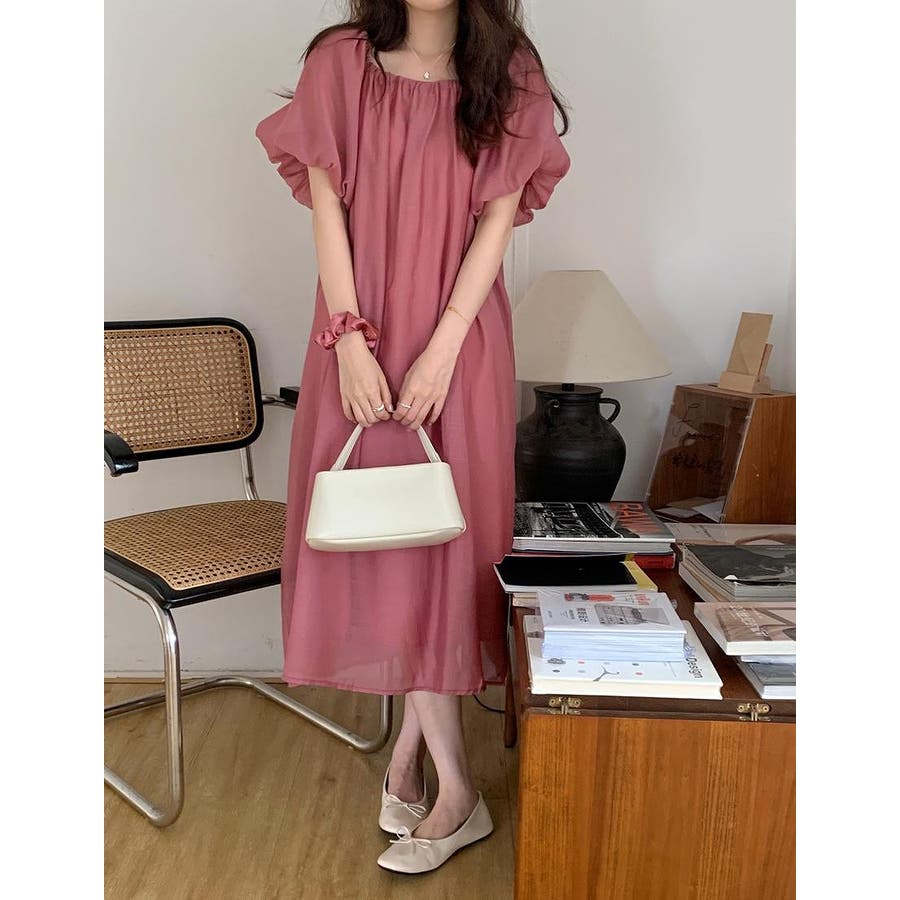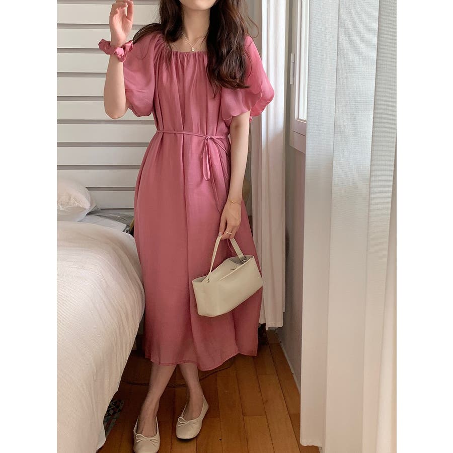 リボンパフスリーブボートネックワンピース