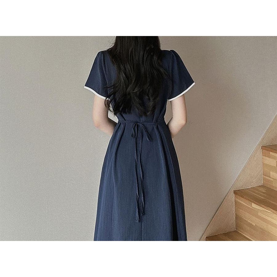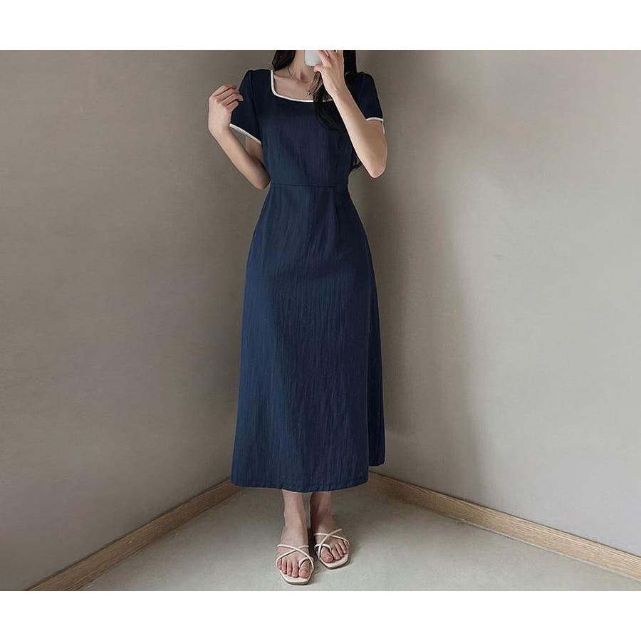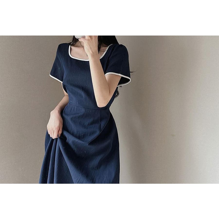 カラーコントラストの襟付き半袖ワンピース