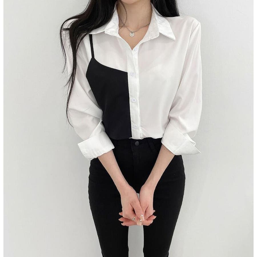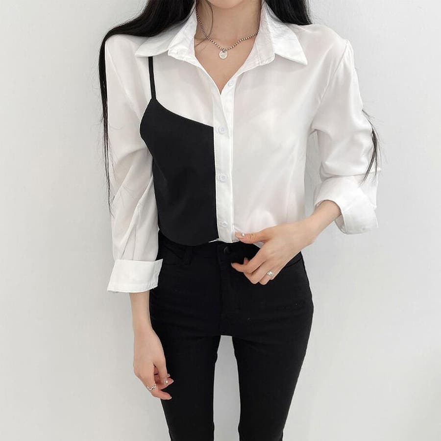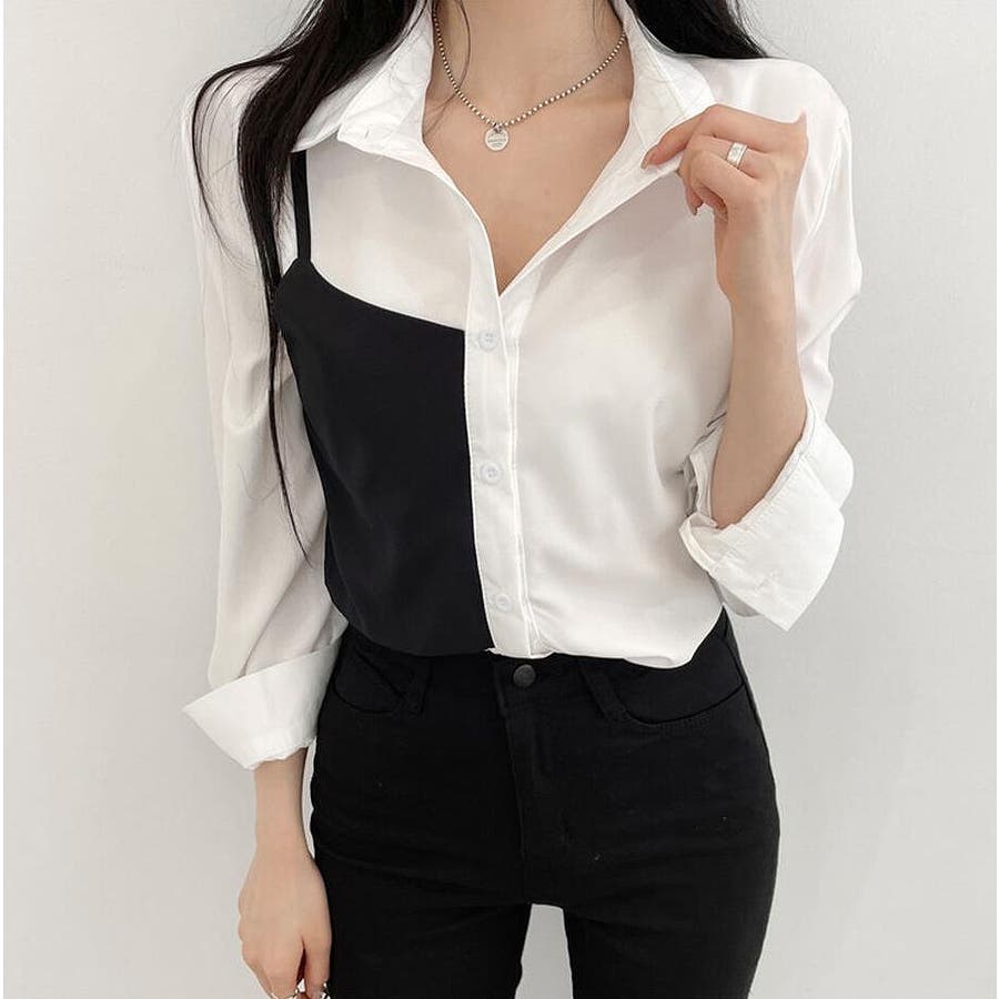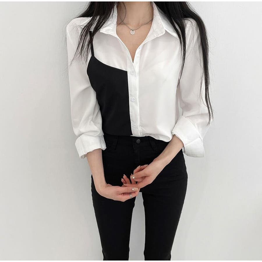 襟付きシングルブレストフェイクレイヤード長袖シャツ
