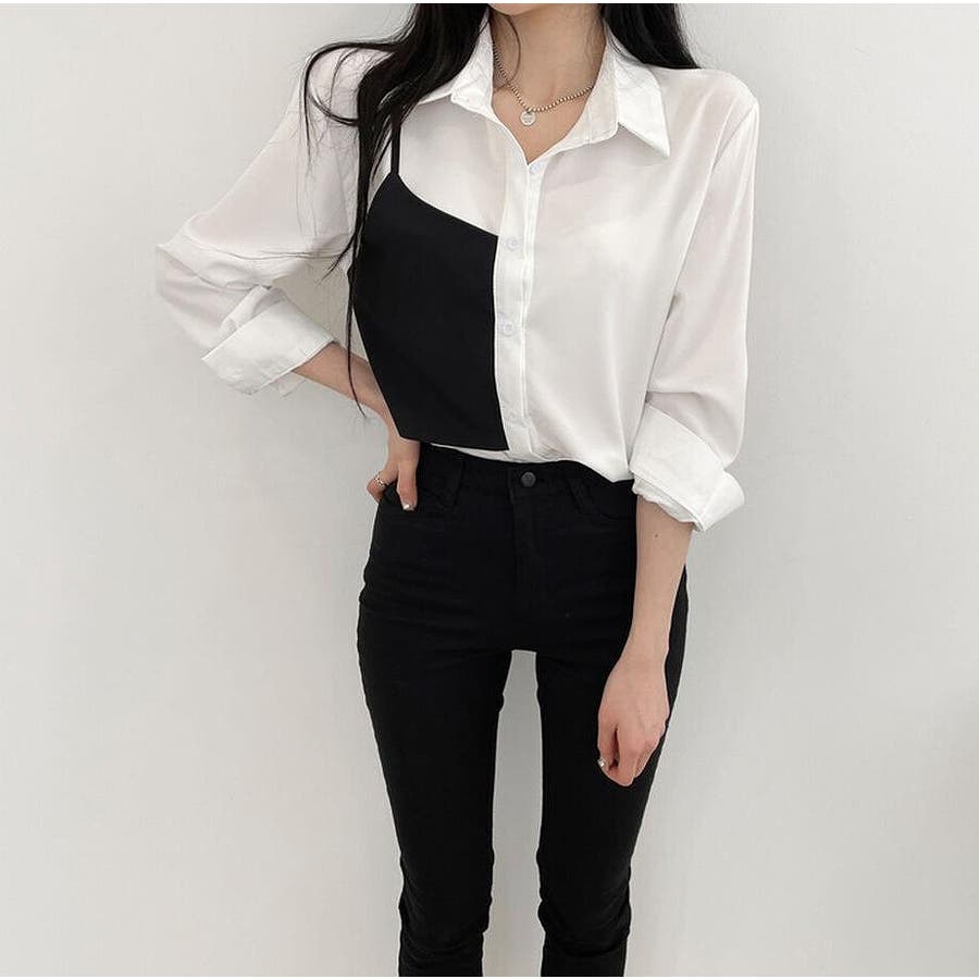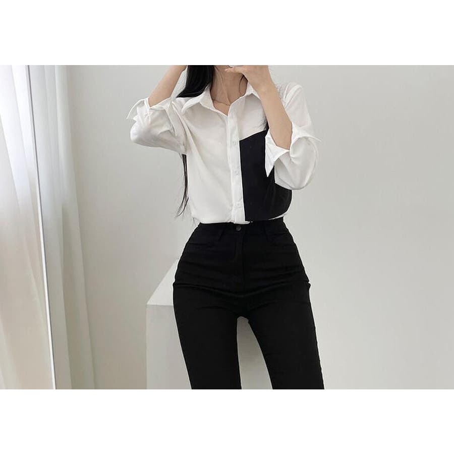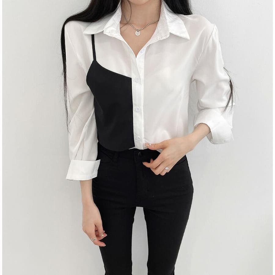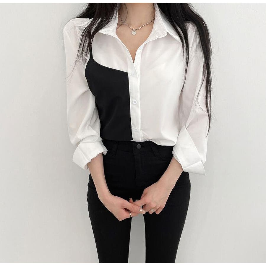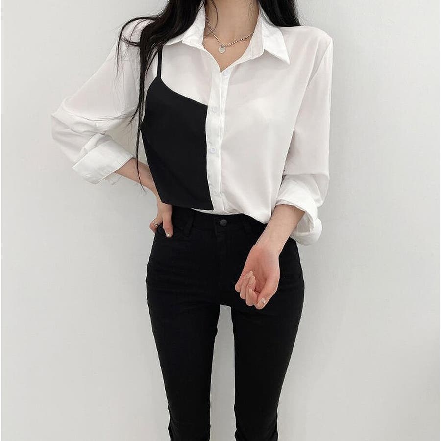襟付きシングルブレストフェイクレイヤード長袖シャツ