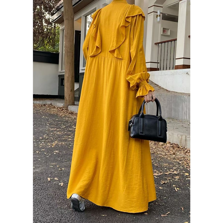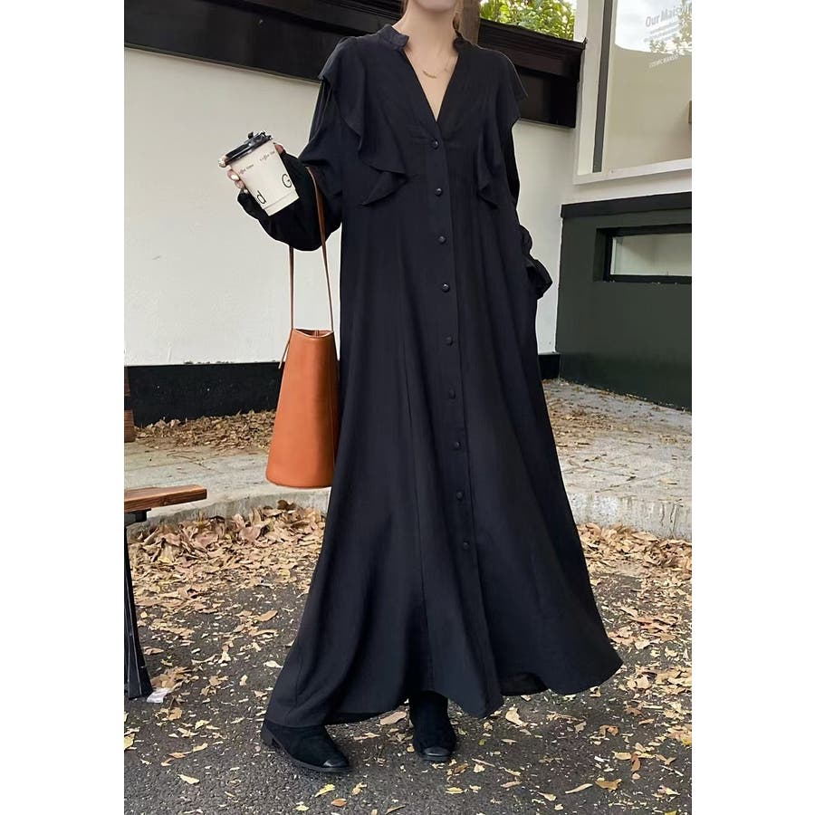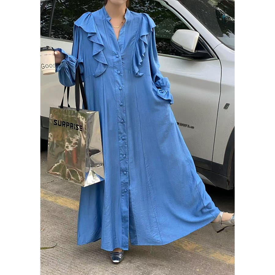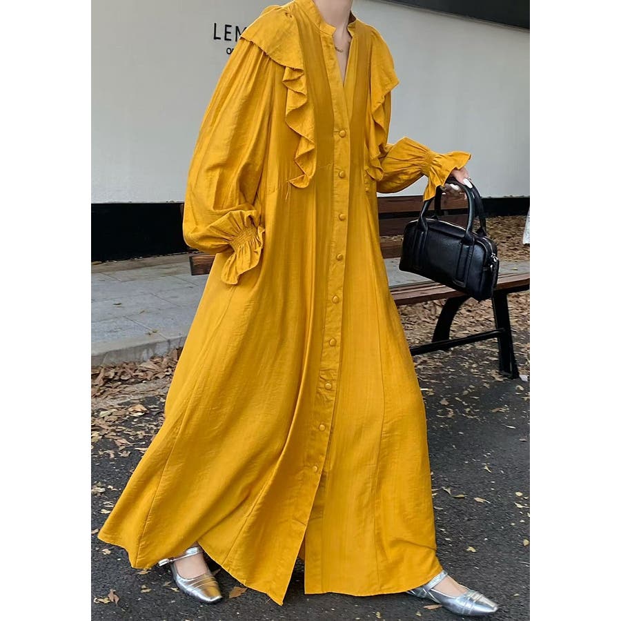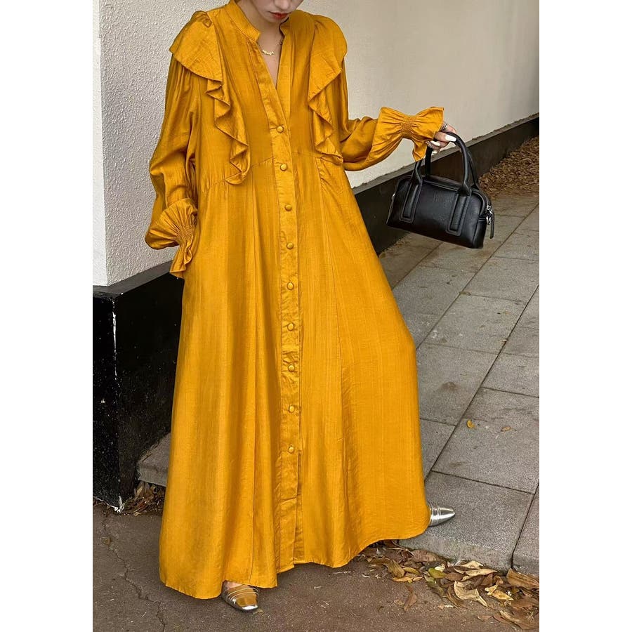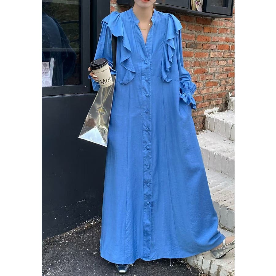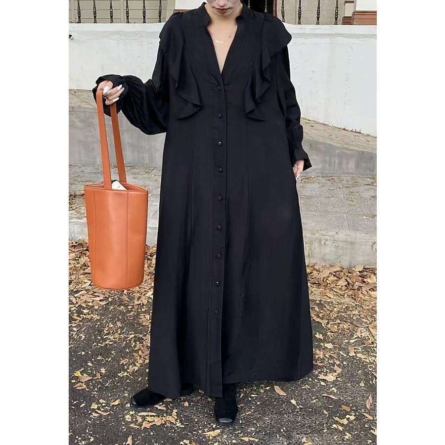 フリル長袖シングルブレストワンピース