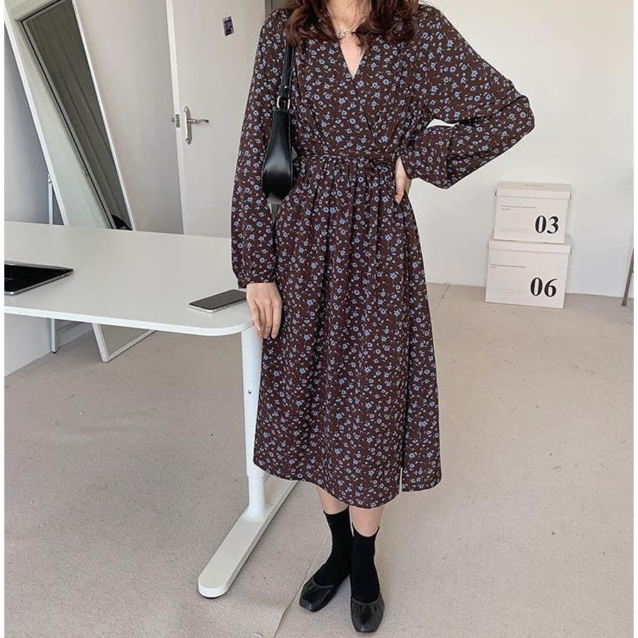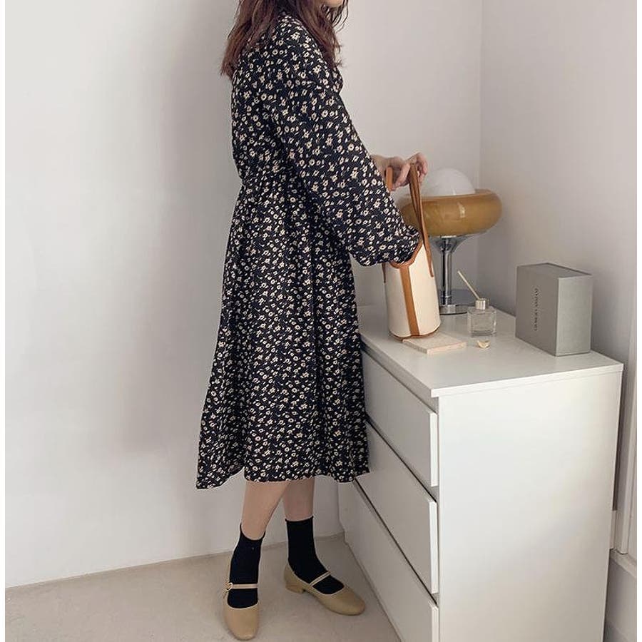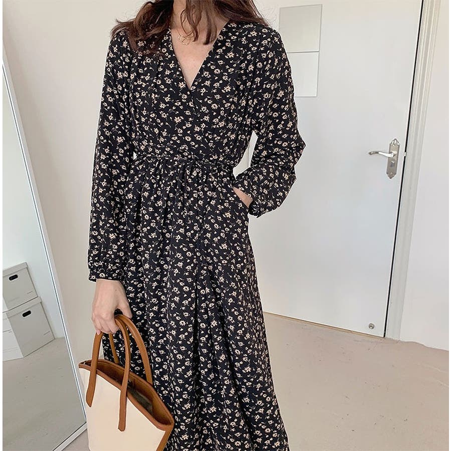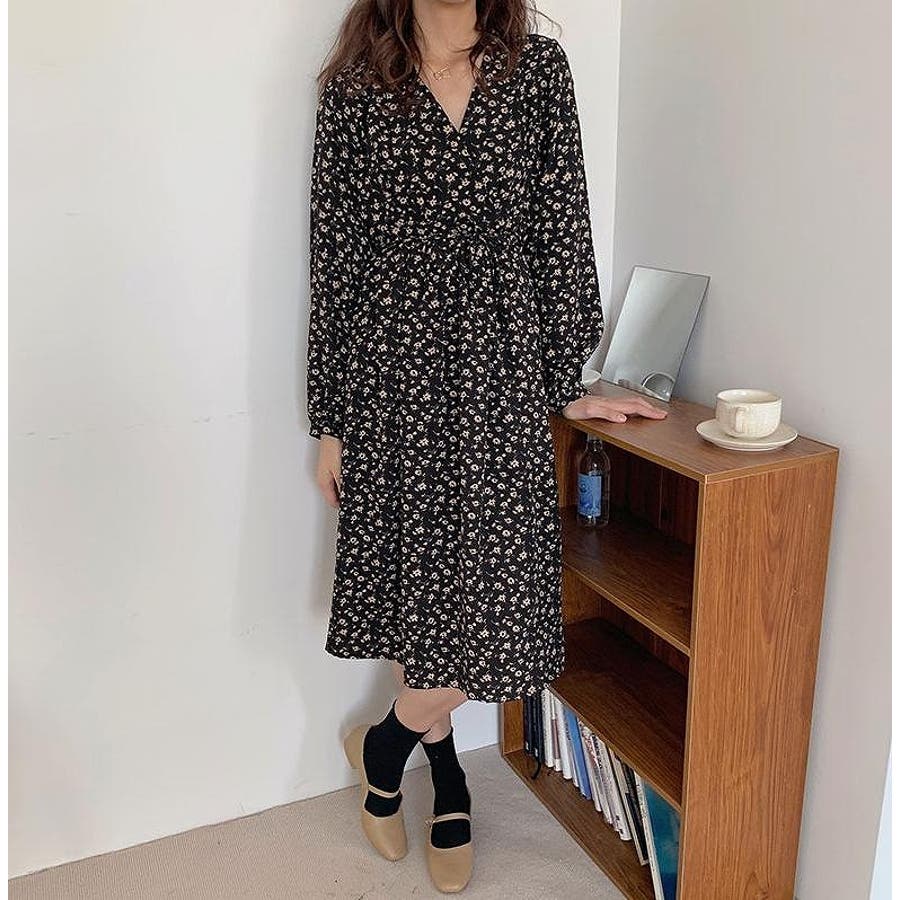 花柄リボン長袖ワンピース