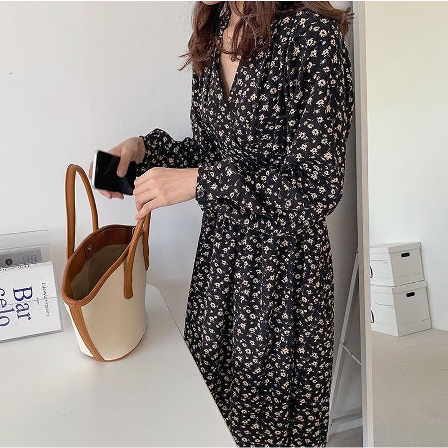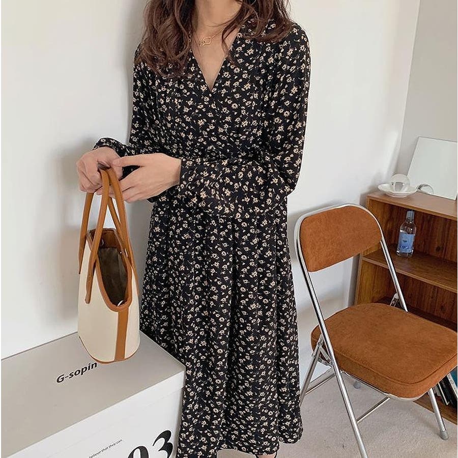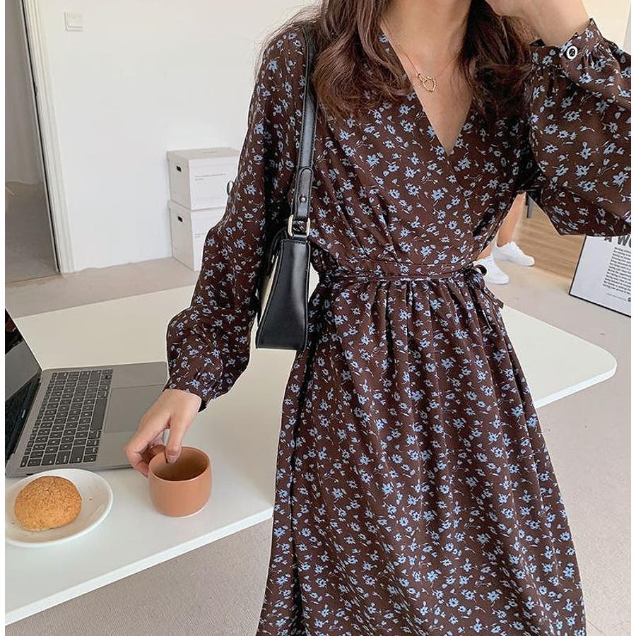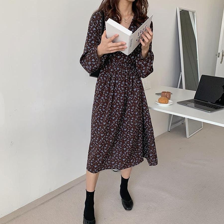 花柄リボン長袖ワンピース