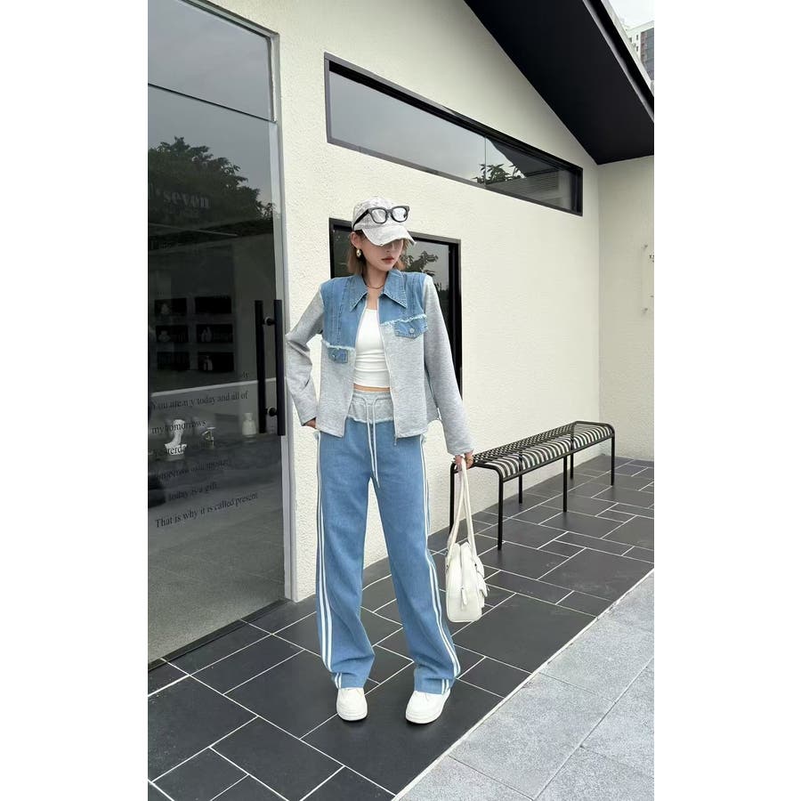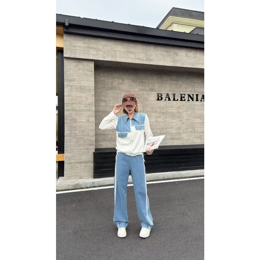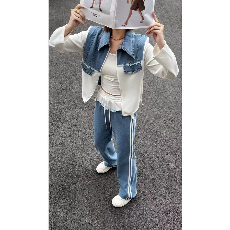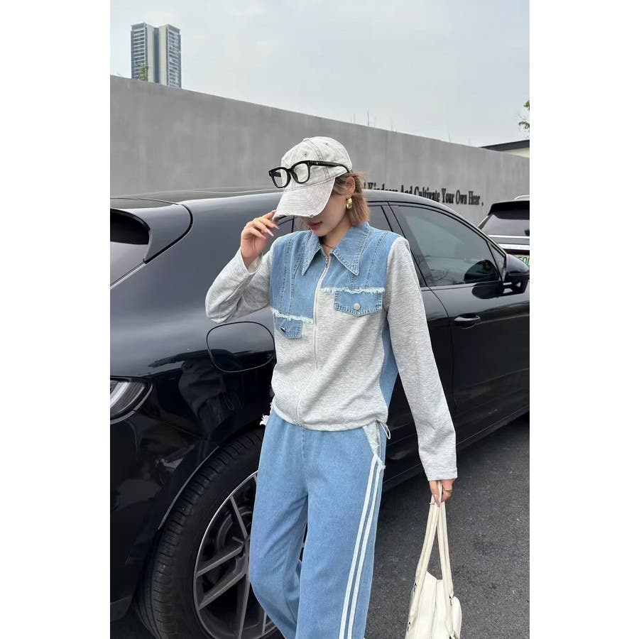 スウェット切り替えデニムトップスパンツセットアップ