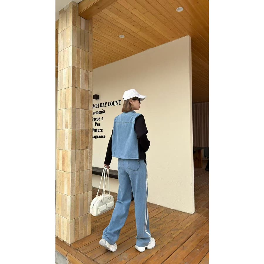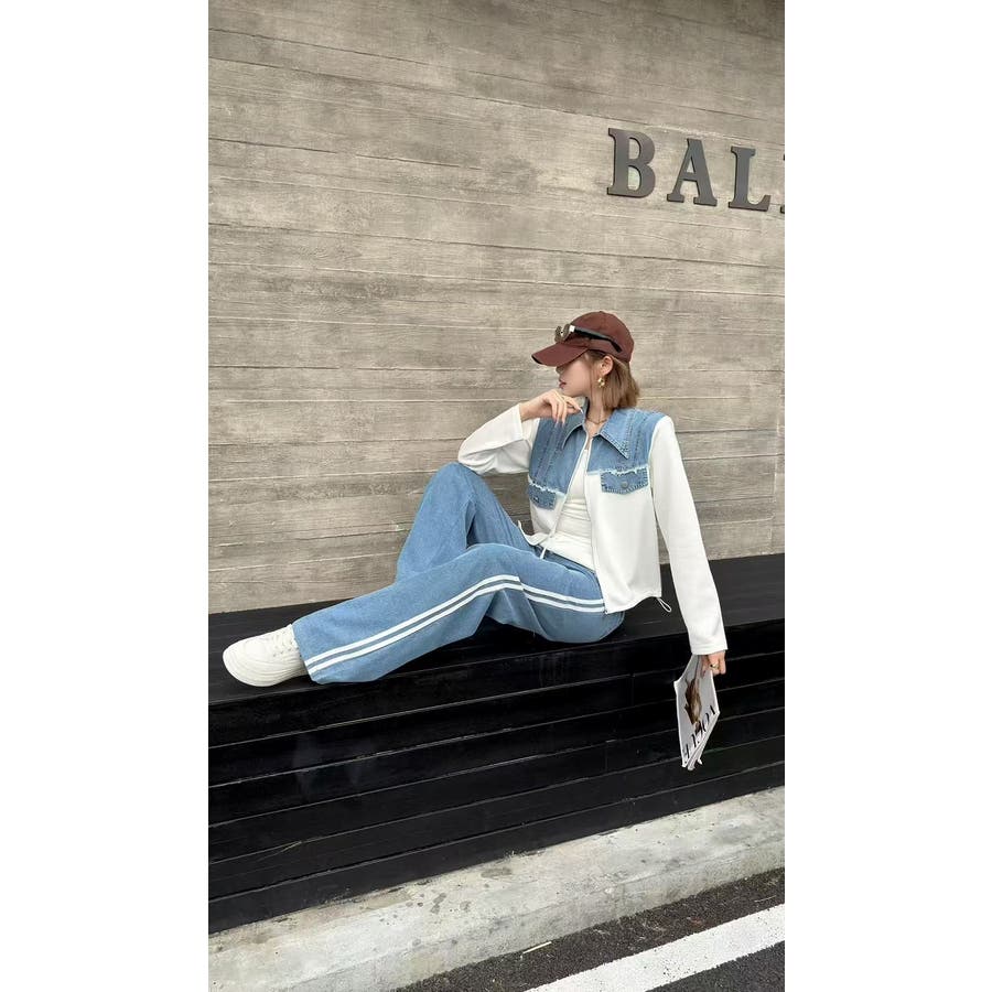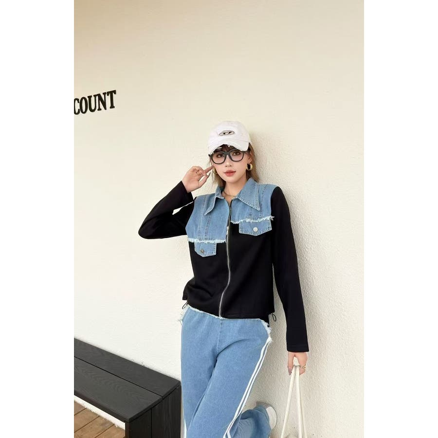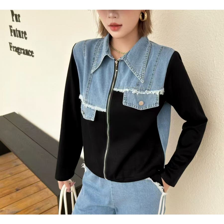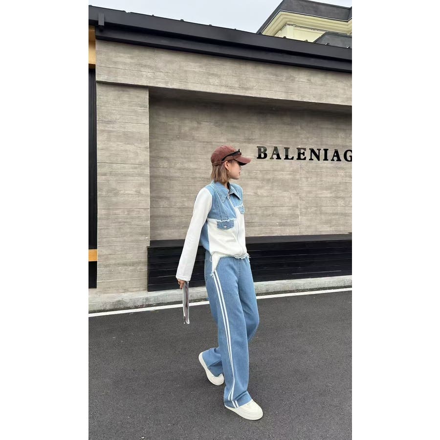 スウェット切り替えデニムトップスパンツセットアップ