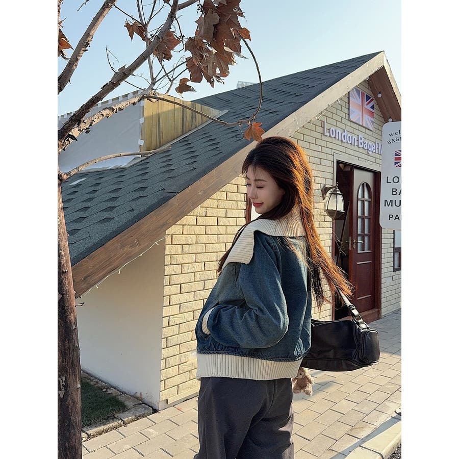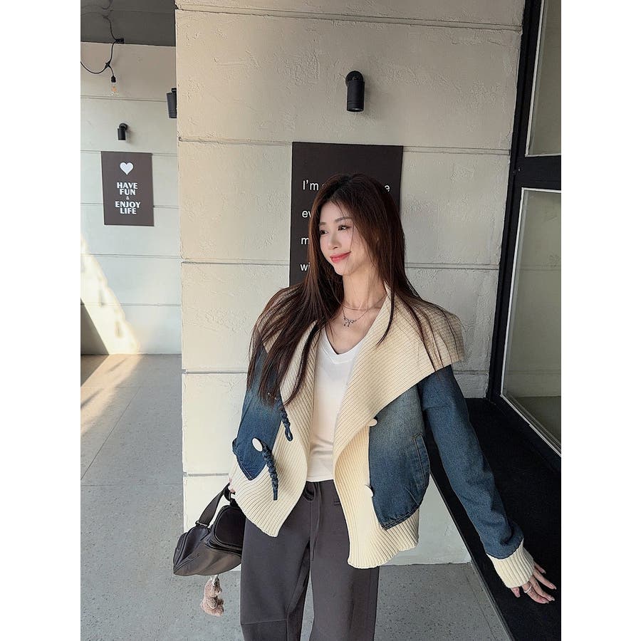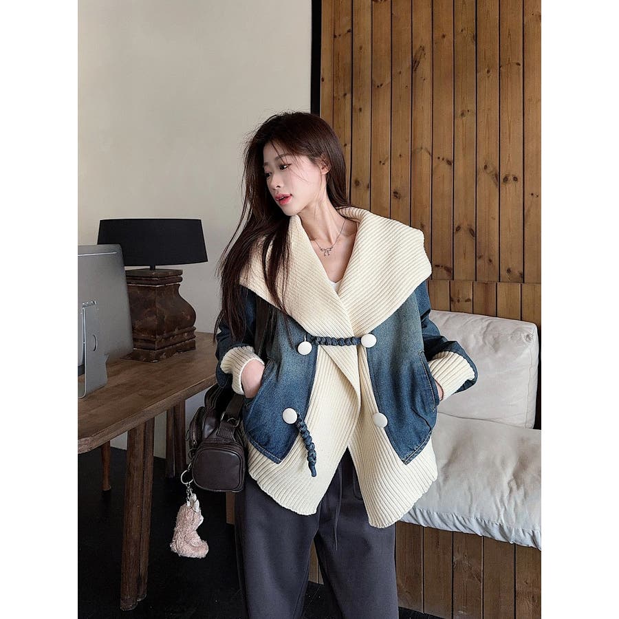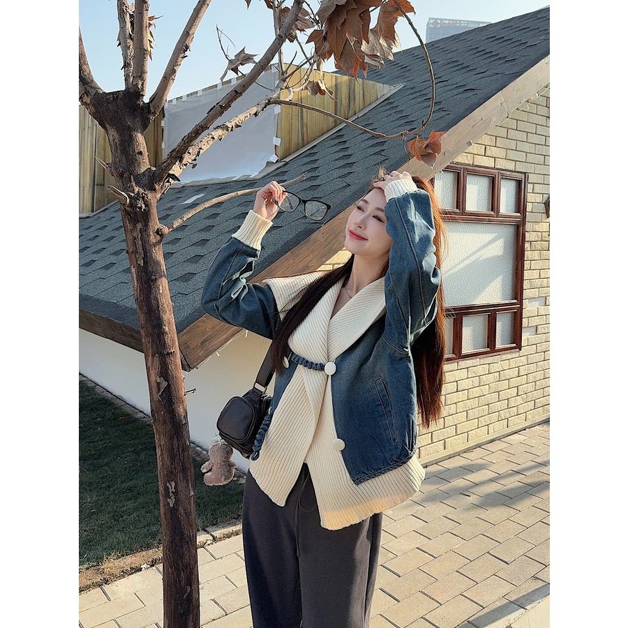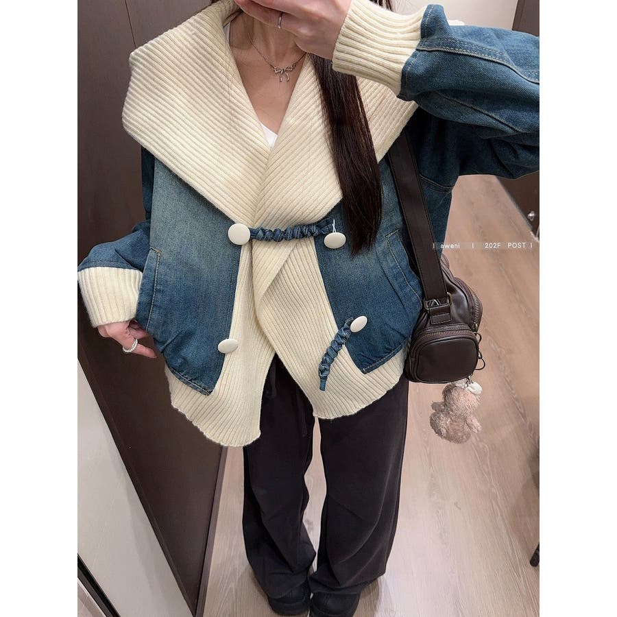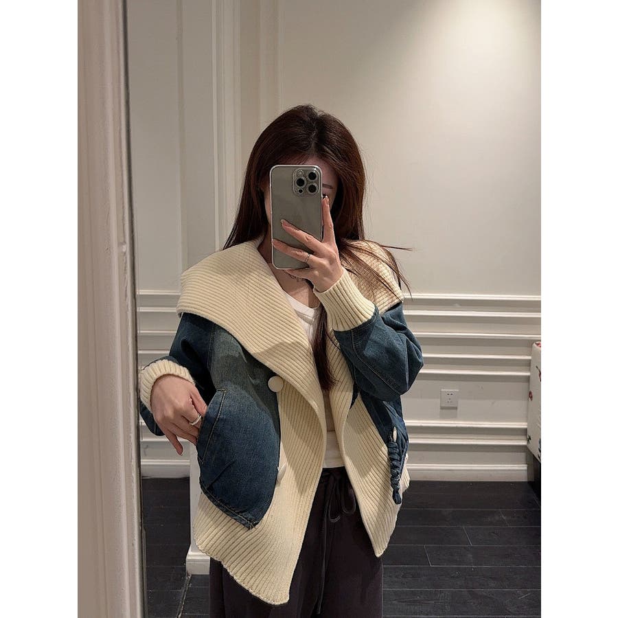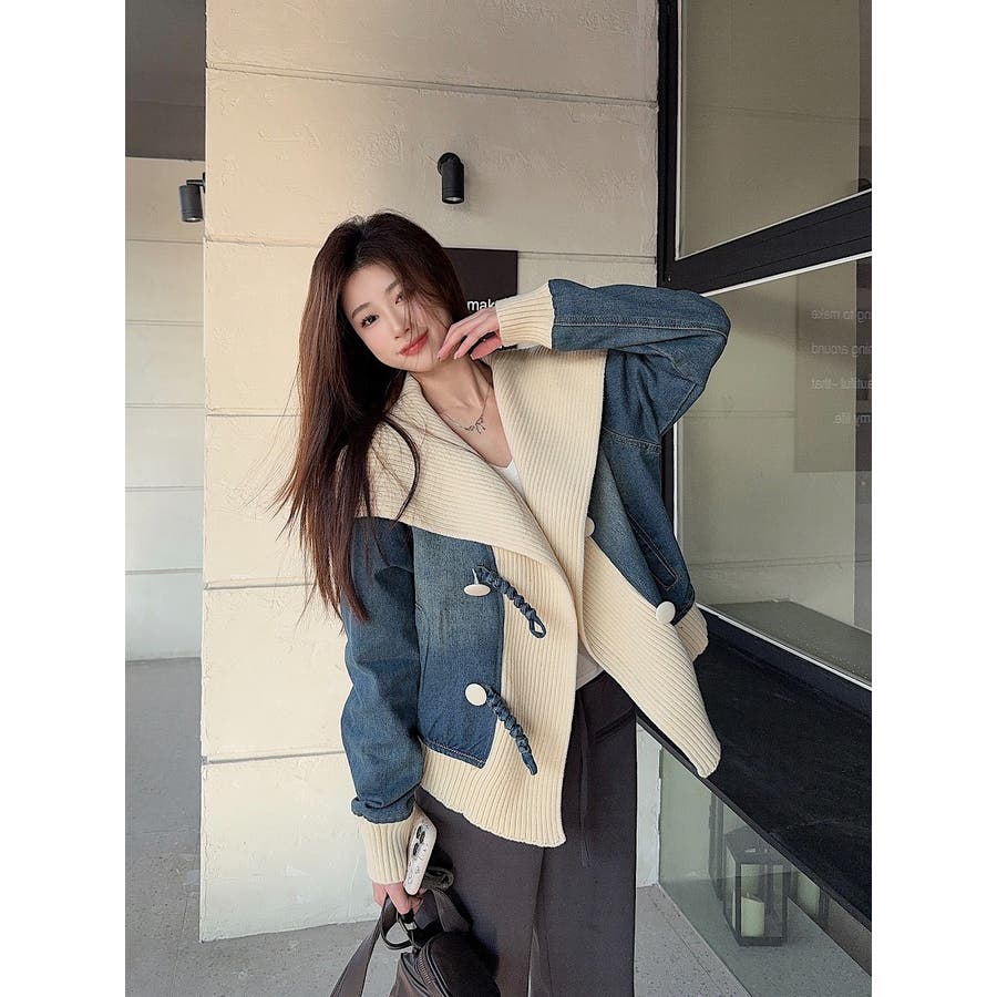 デニム切り替えニットジャケット