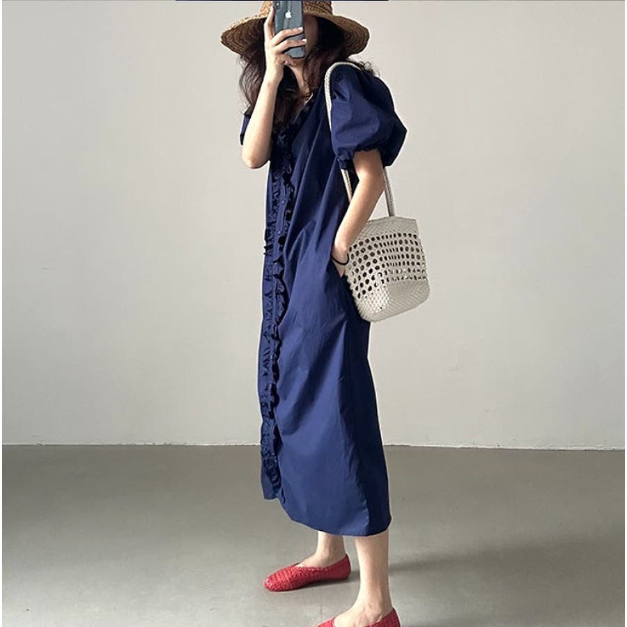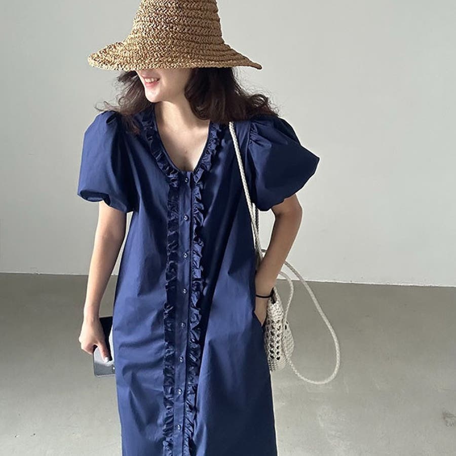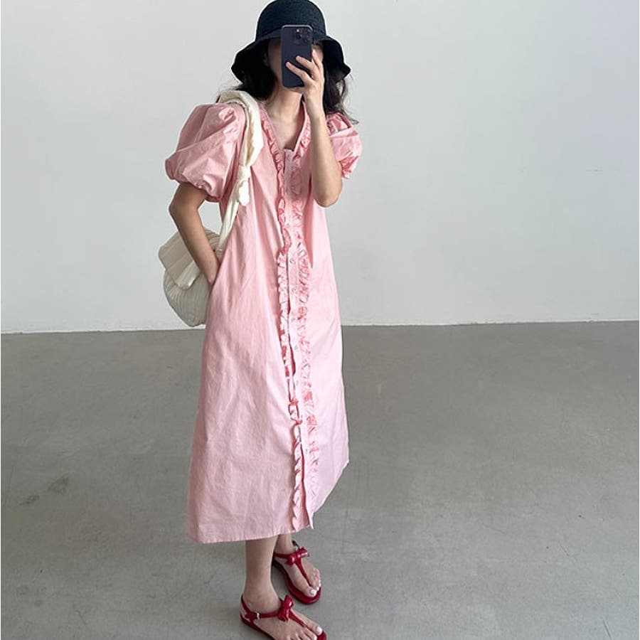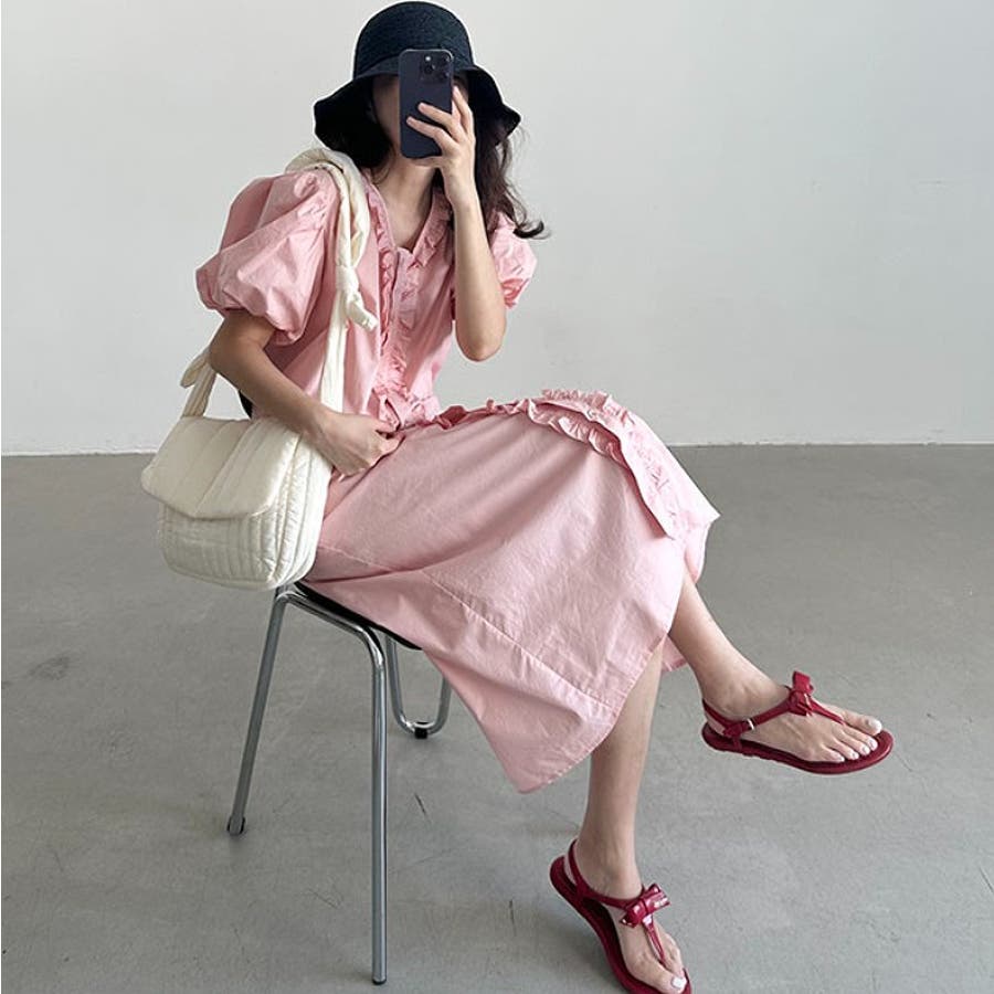フリルVネックパフスリーブワンピース