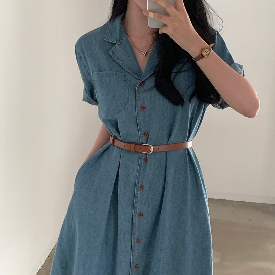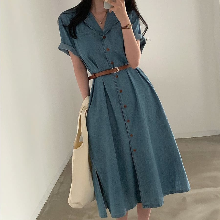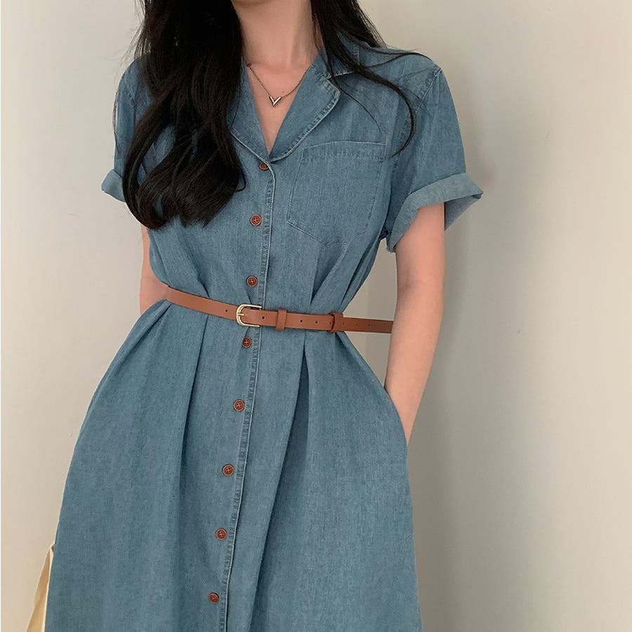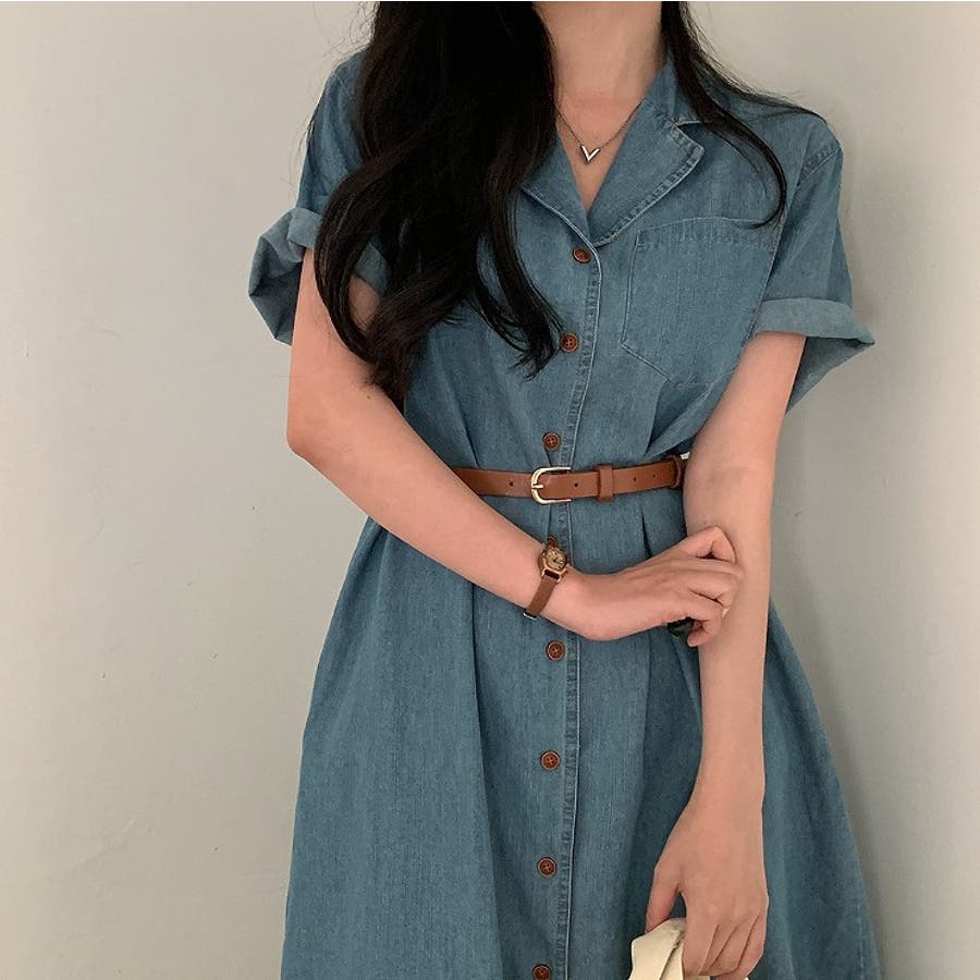 ベルト付き襟付きシングルブレストデニムワンピース