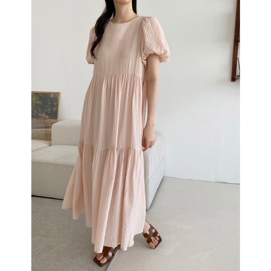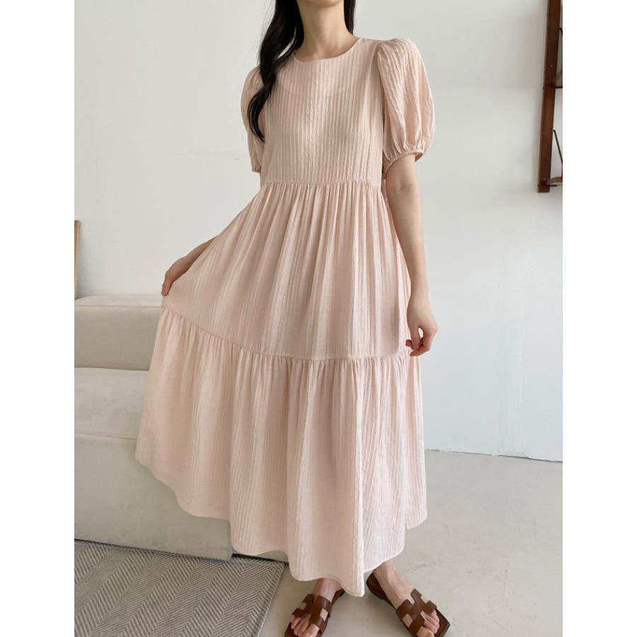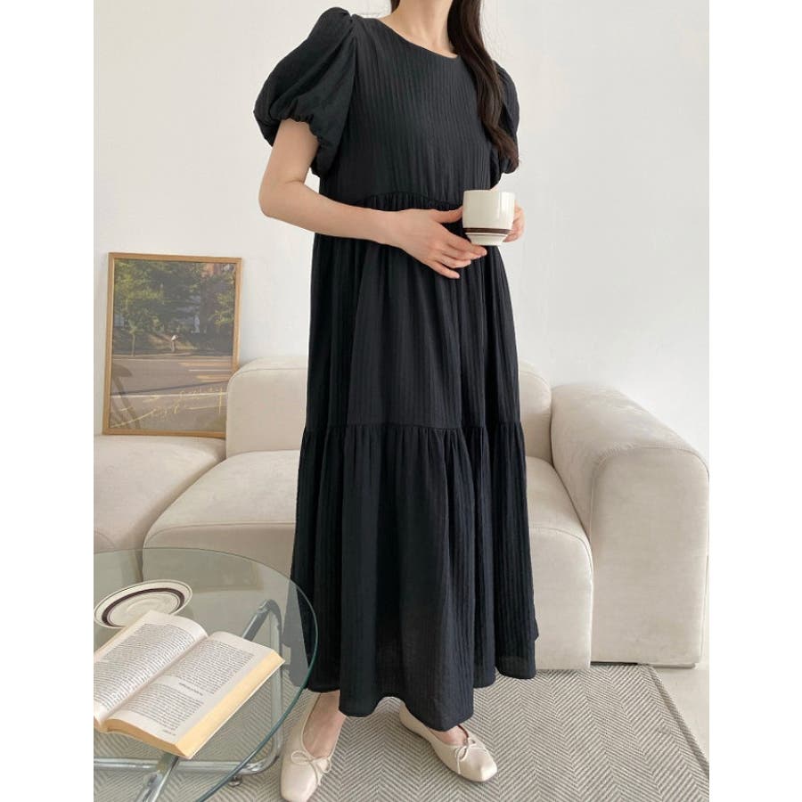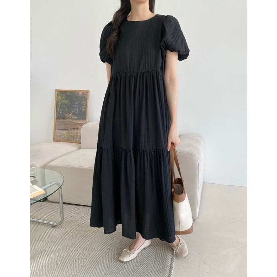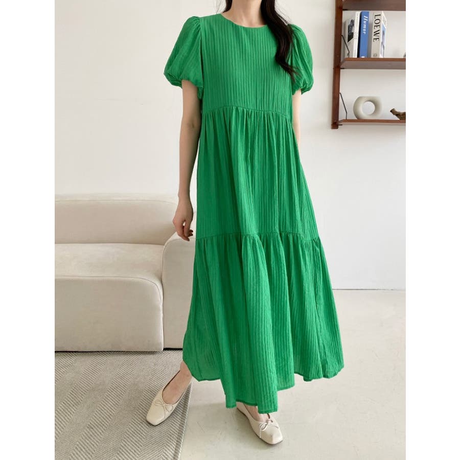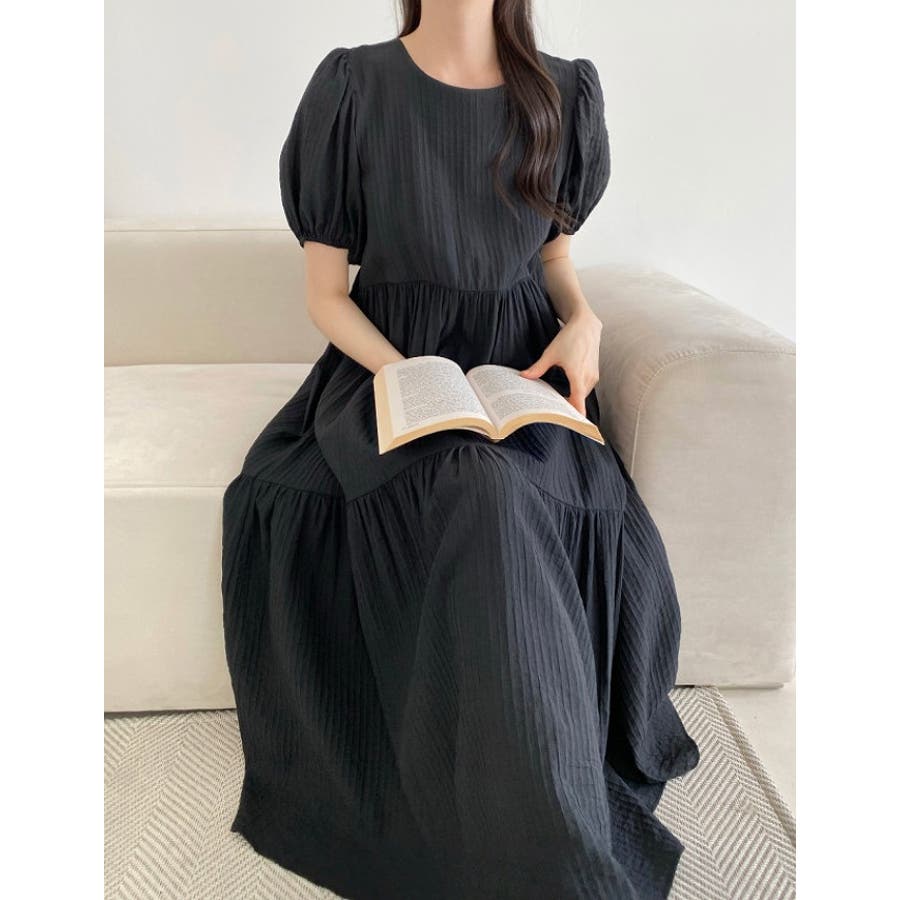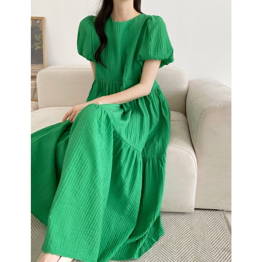 シンプルパフスリーブクルーネックワンピース